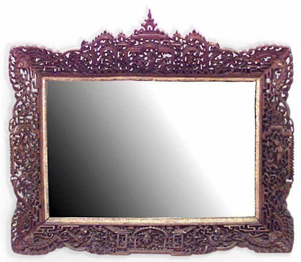 Asian Burmese-style (19th Century) horizontal teak wall mirror with a carved filigree border.