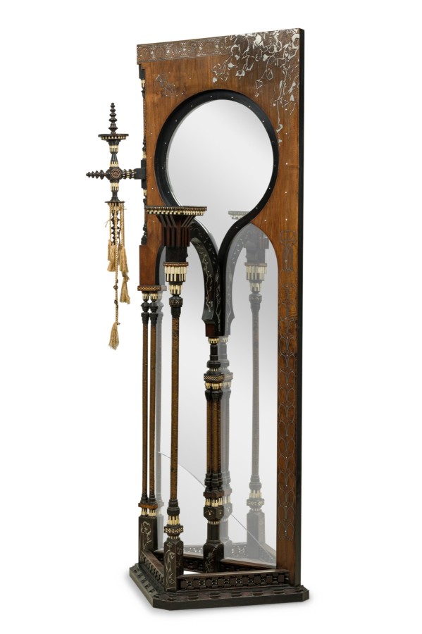 Carlo Bugatti Art Nouveau Mirrored Hall / Hat Stand with Mother of Pearl, Silver, and Bone Inlay