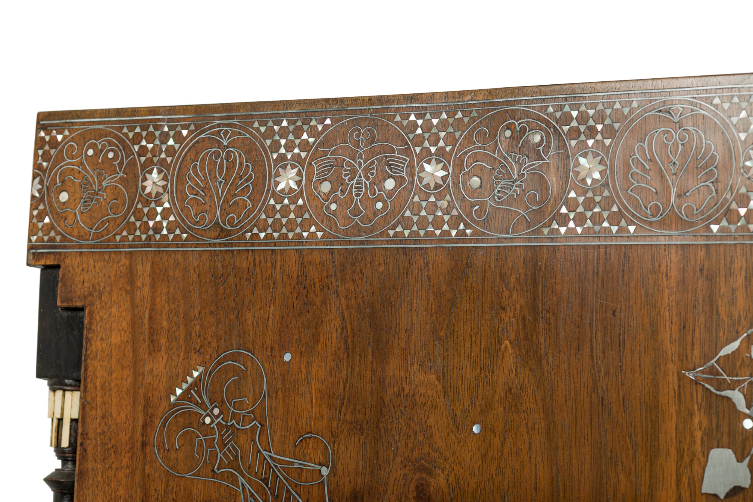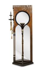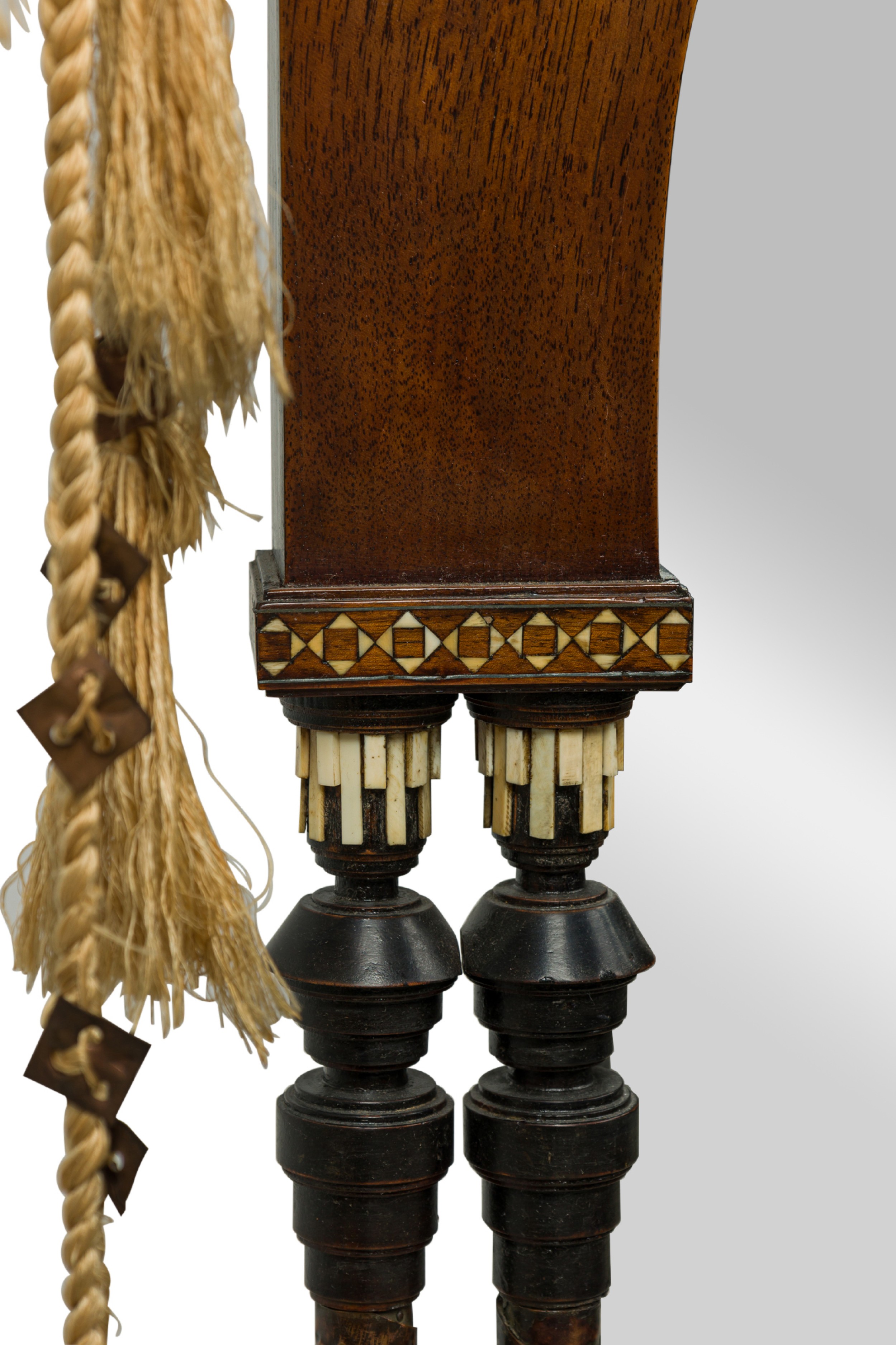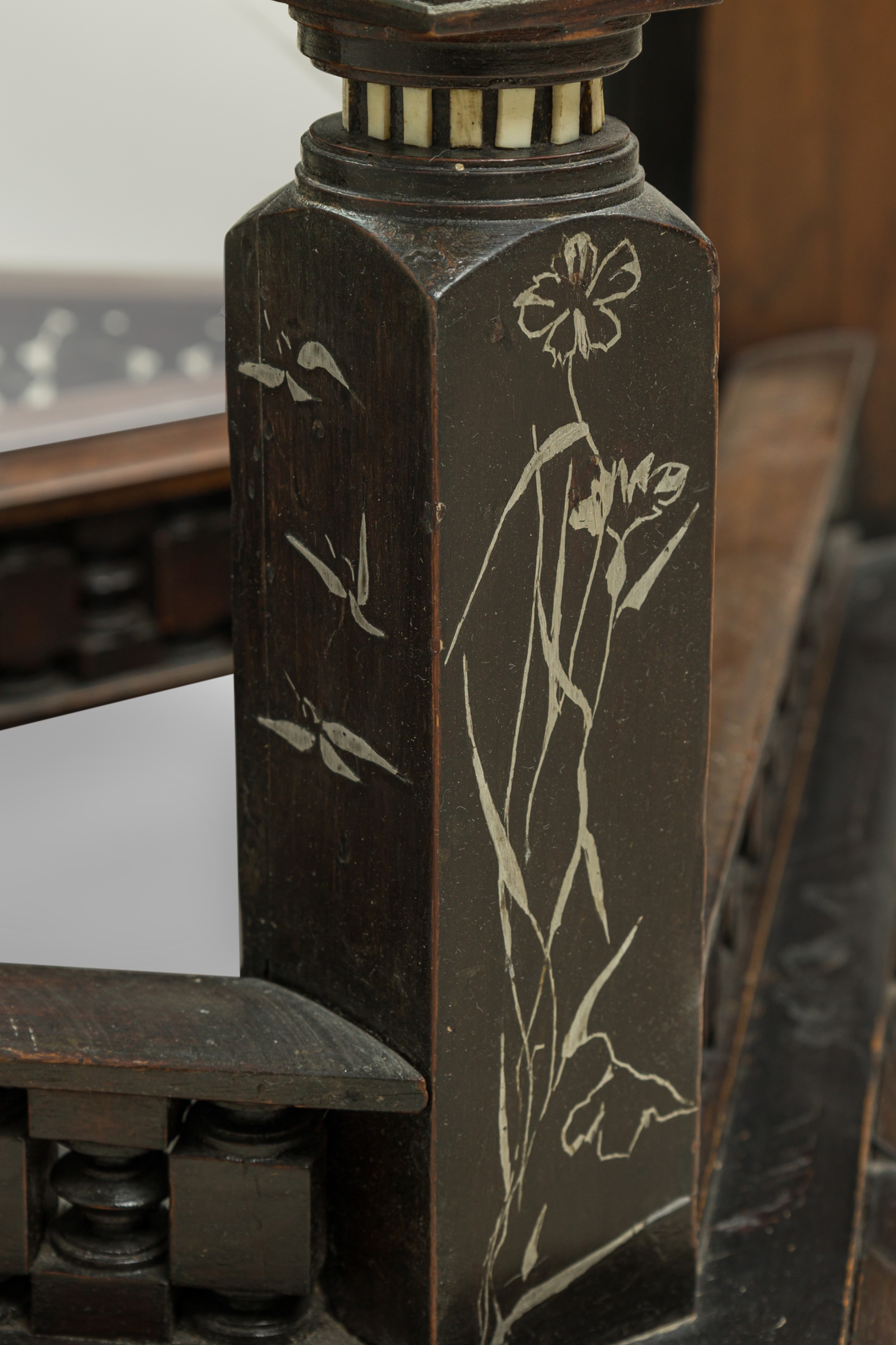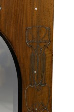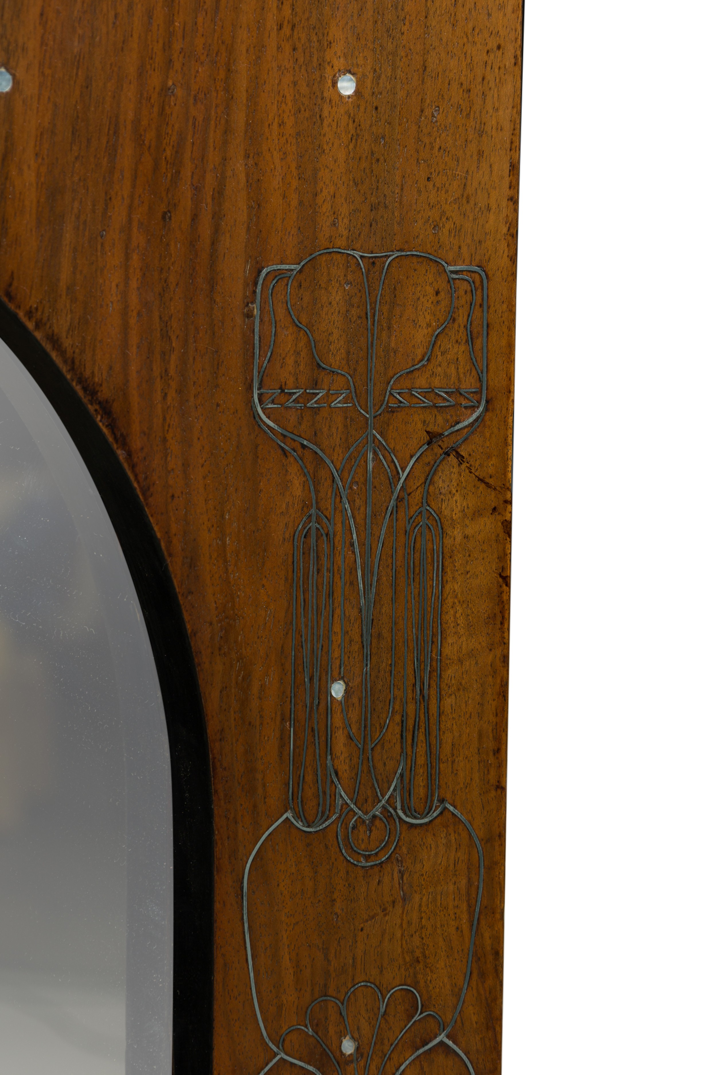 Style: Art Nouveau Materials & Techniques: Bone, ebony, inlaid, inlay, mahogany, metal, mirror, pearl / mother-of-pearl, silver, wood Category: Stands/Racks Condition: NOTE: crack in lower section of the mirror; Wear to finish Good; Wear consistent with age and use