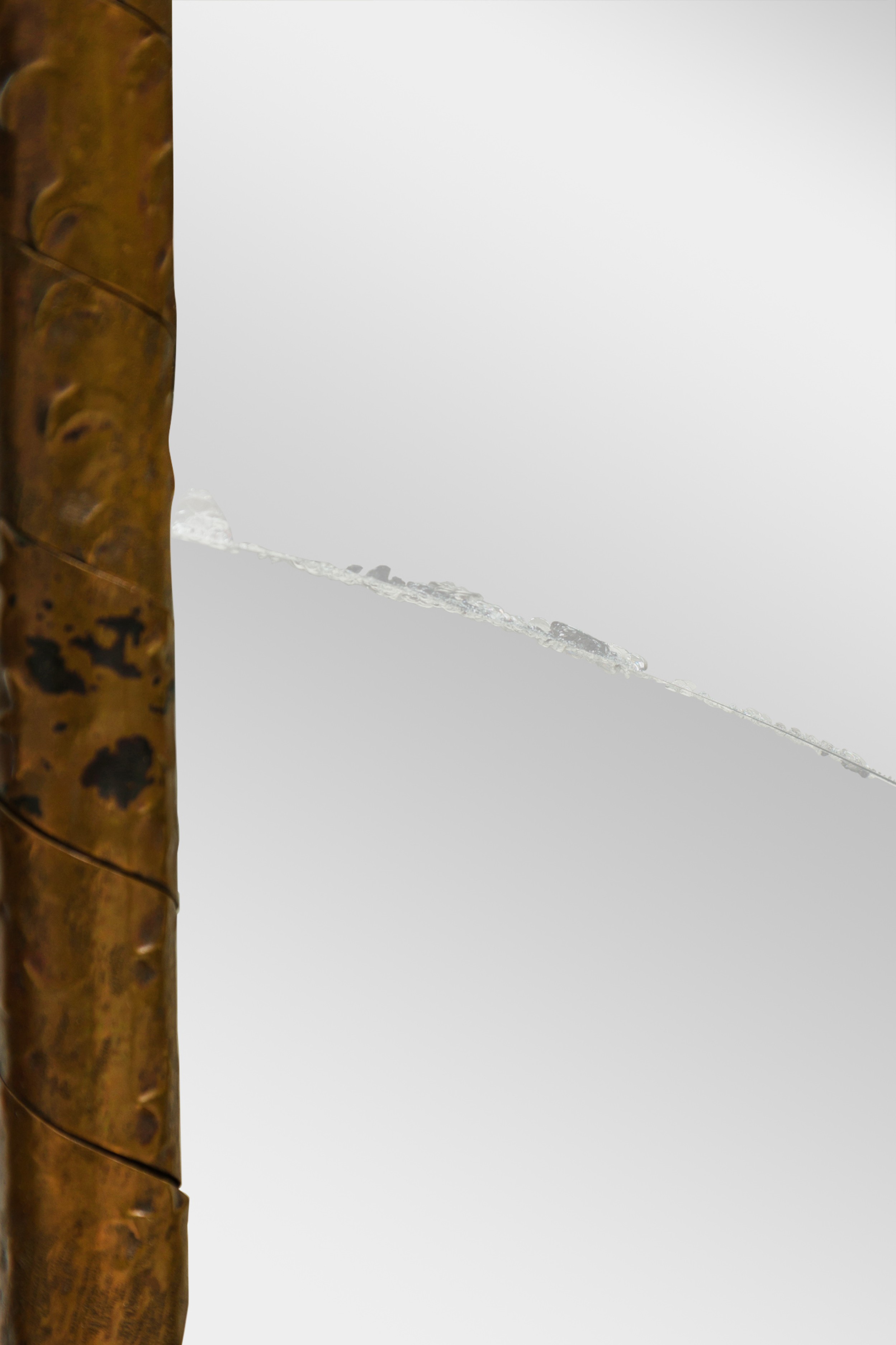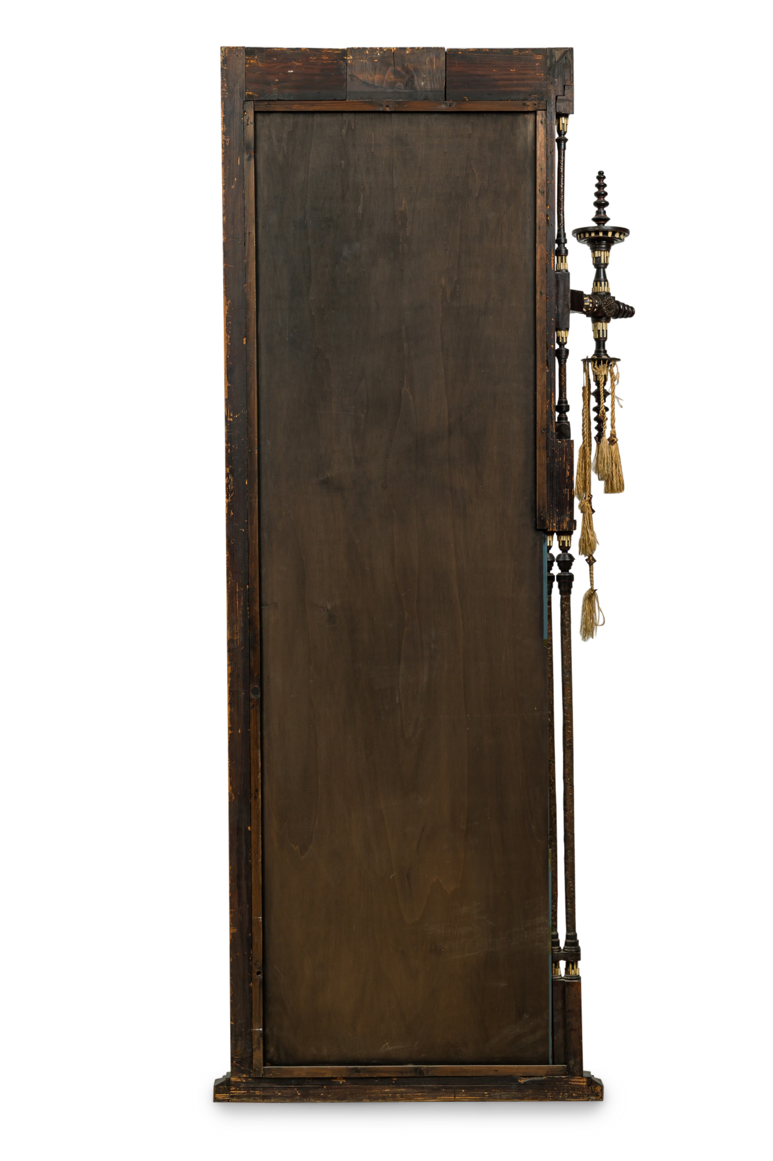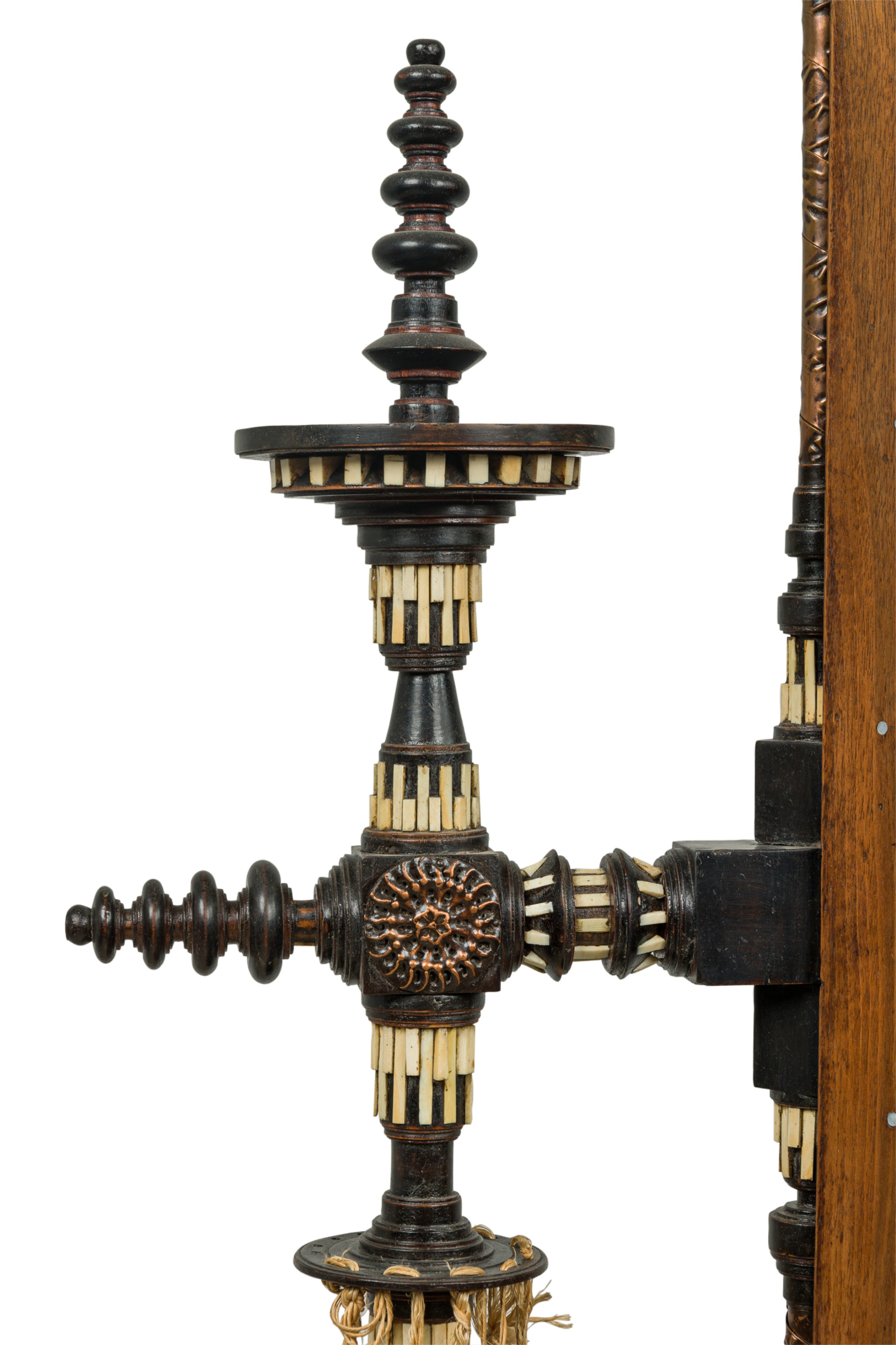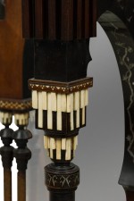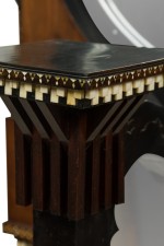 Italian Art Nouveau narrow hall / hatrack stand having a walnut & ebonized wood frame with pewter & pearl inlay and a shaped inset full-length mirror,with elaborate columns and center pedestal having copper veneer, featuring elaborate geometric bone trim, all resting on a triangular base (CARLO BUGATTI)