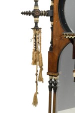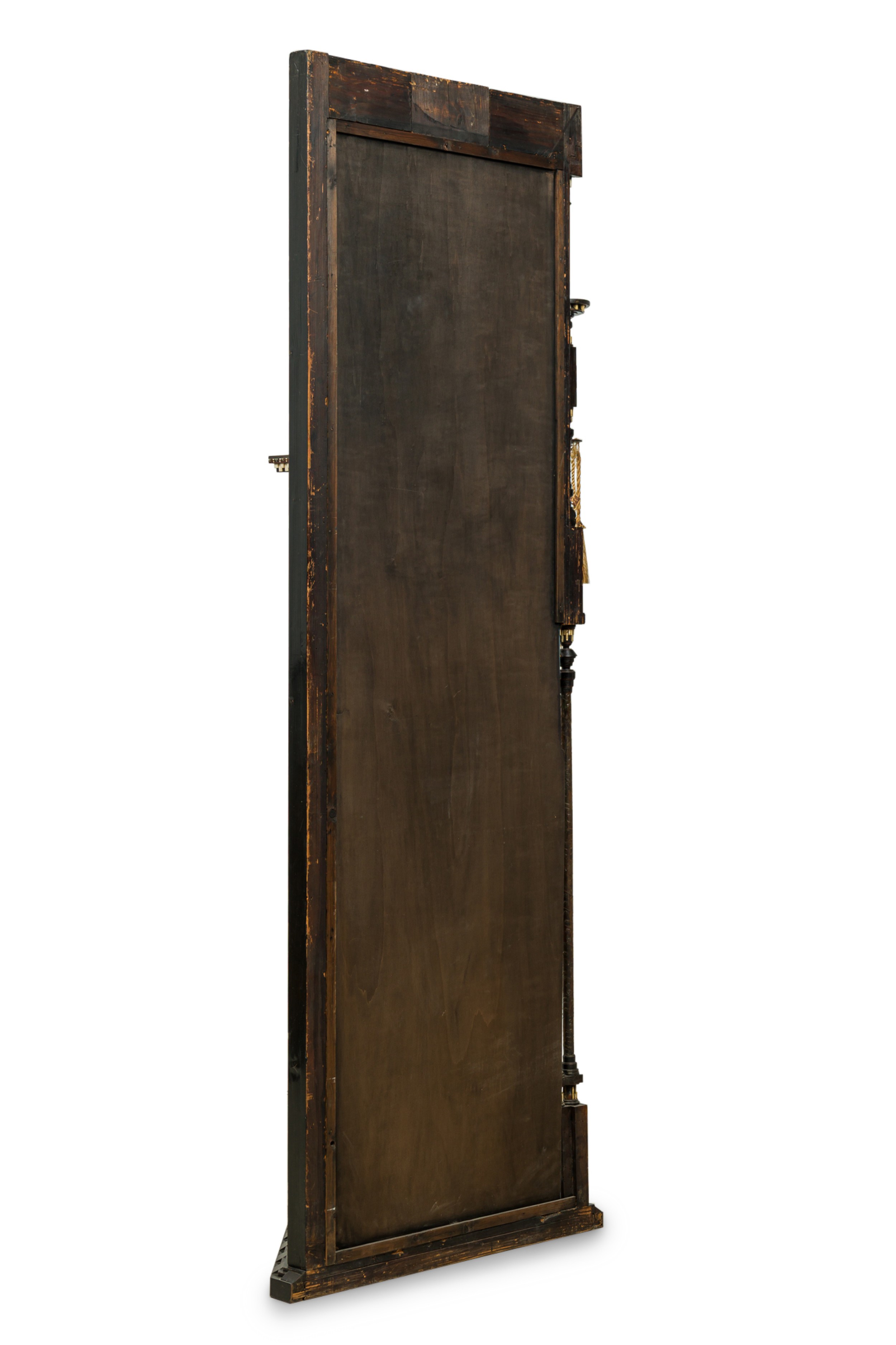 Italian Art Nouveau narrow hall / hatrack stand having a walnut & ebonized wood frame with pewter & pearl inlay and a shaped inset full-length mirror,with elaborate columns and center pedestal having copper veneer, featuring elaborate geometric bone trim, all resting on a triangular base (CARLO BUGATTI).