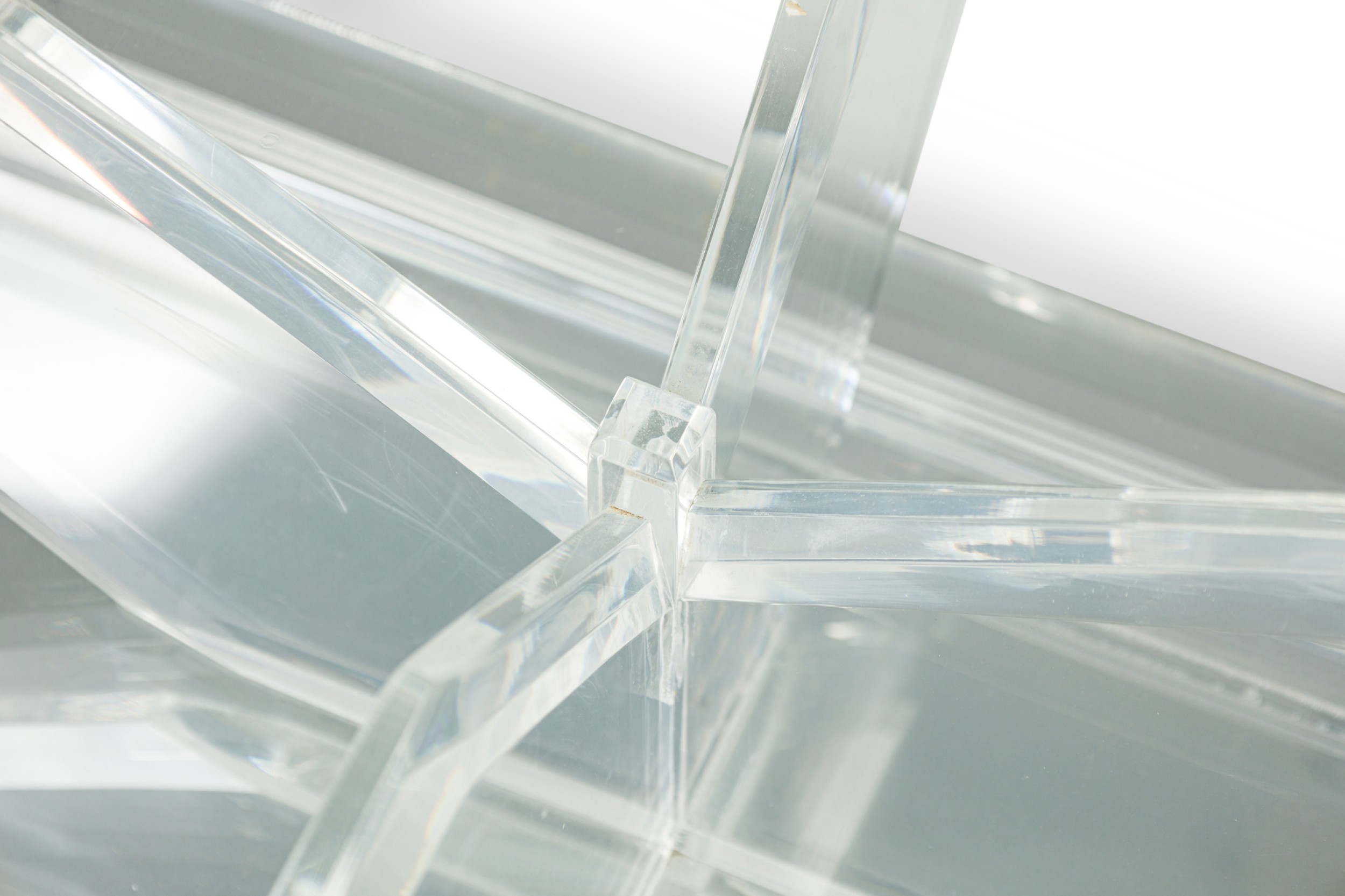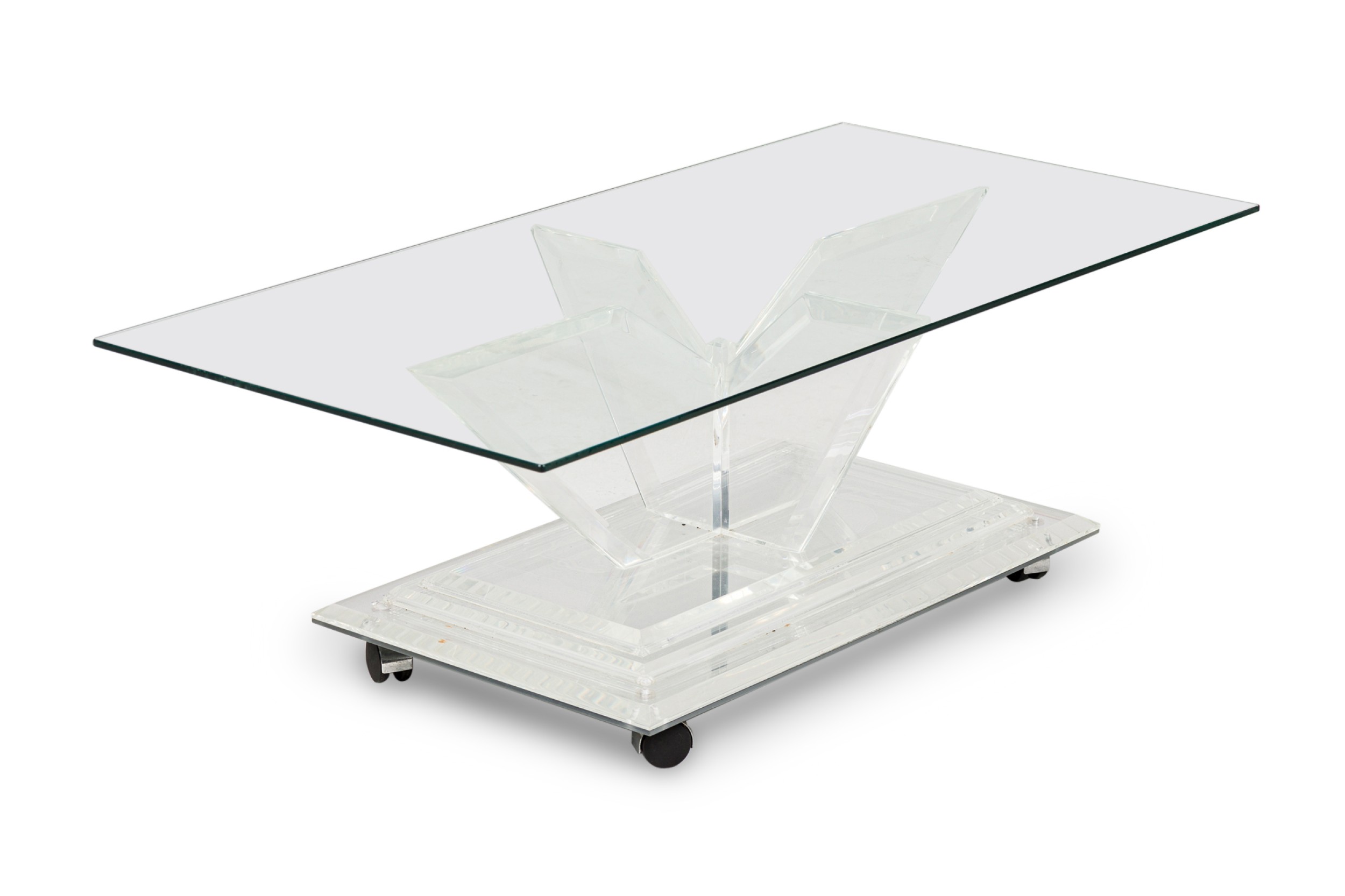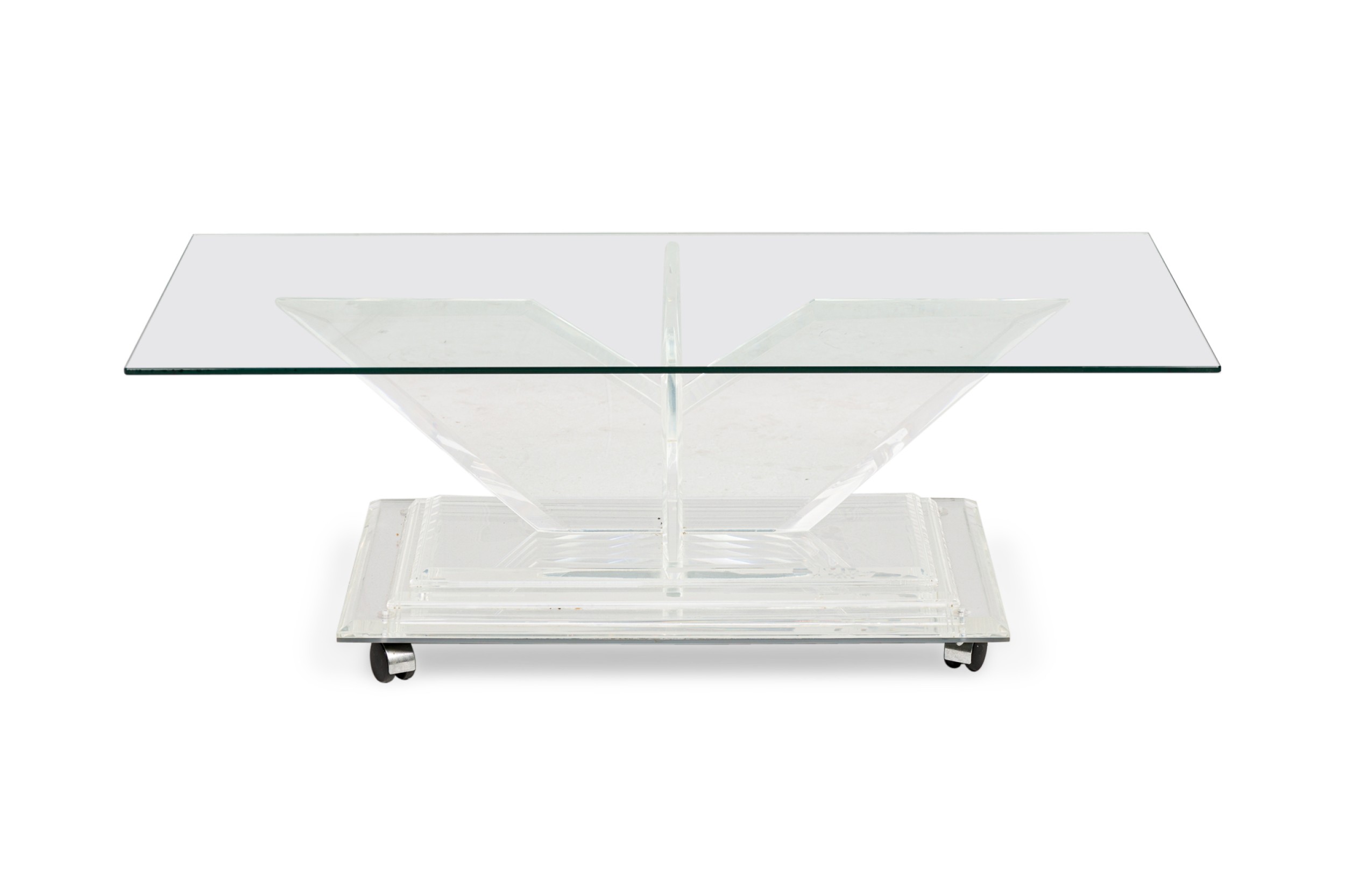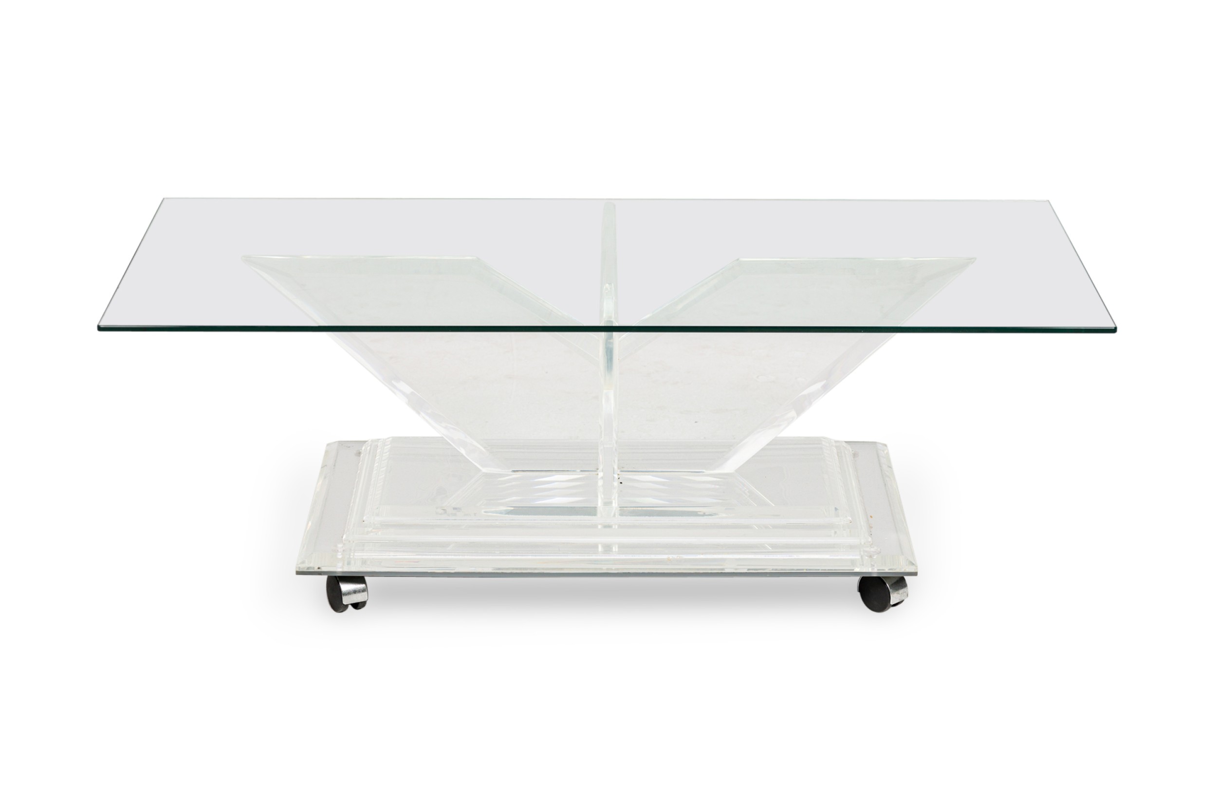 Mid-Century American lucite rectangular cocktail / coffee table frame features a mirrored top on a beveled, stepped lucite base supported on 4 V-shaped perpendicular flattened legs. (CHARLES HOLLIS JONES)