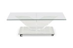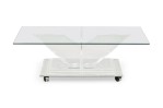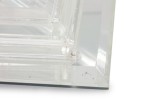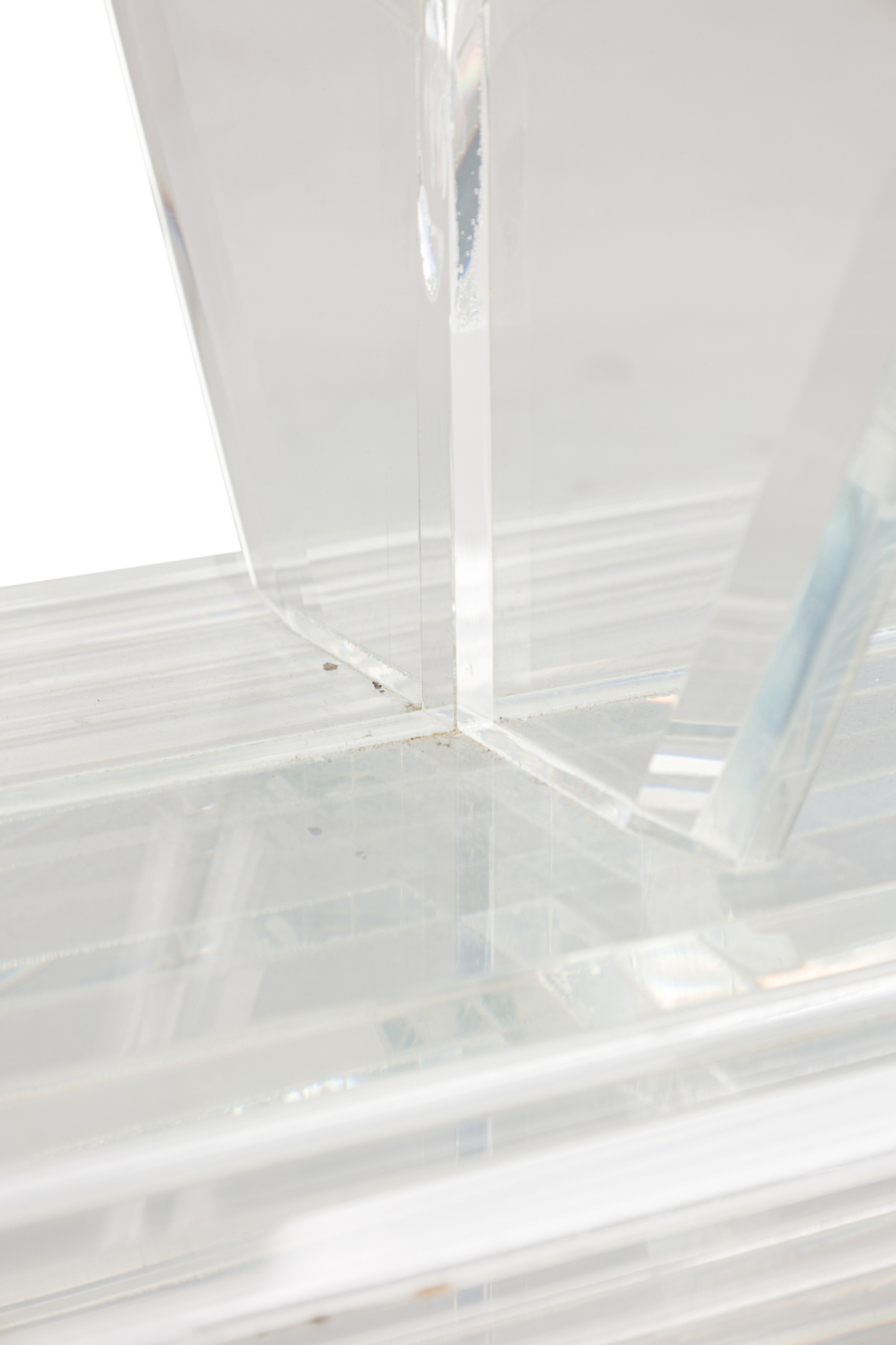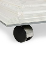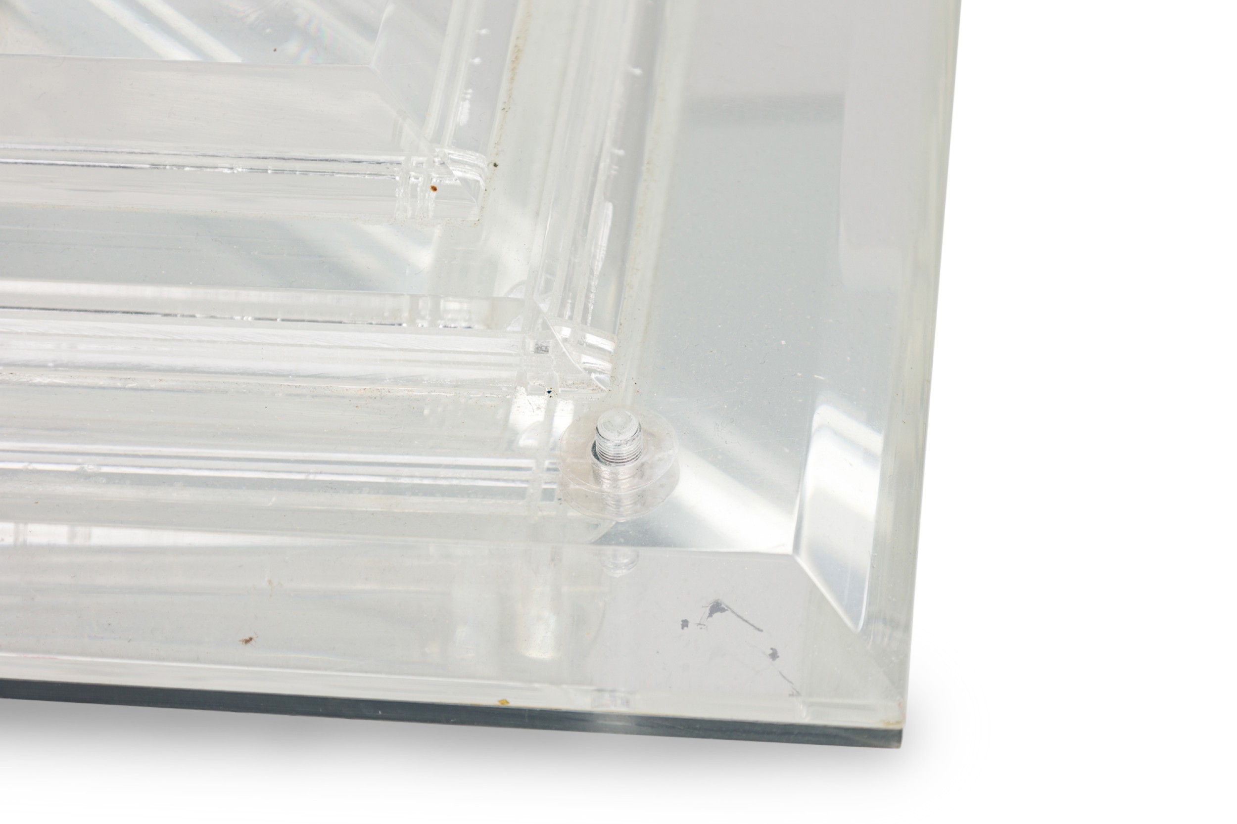 Mid-Century American lucite rectangular cocktail / coffee table frame features a mirrored top on a beveled, stepped lucite base supported on 4 V-shaped perpendicular flattened legs. (CHARLES HOLLIS JONES).