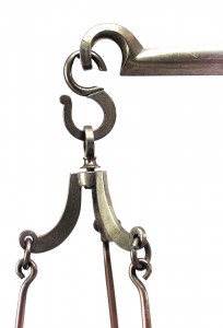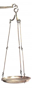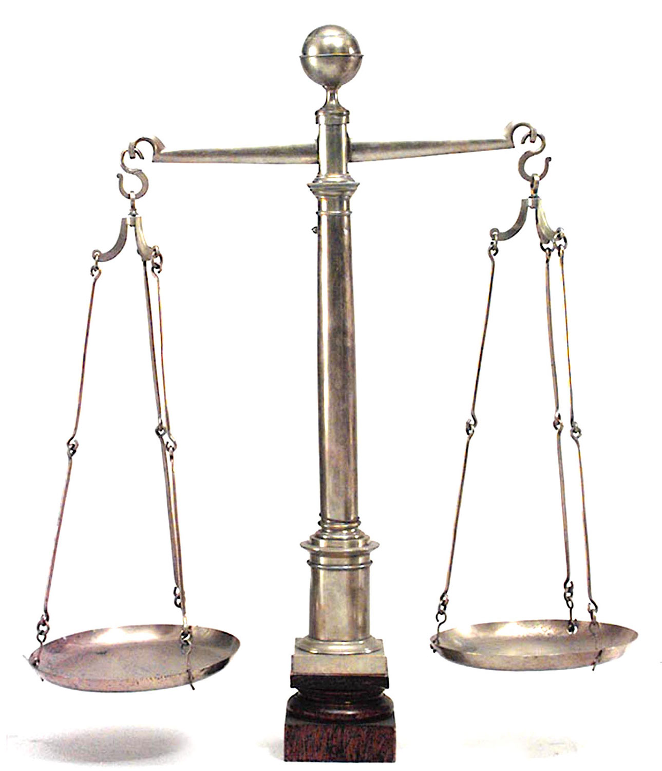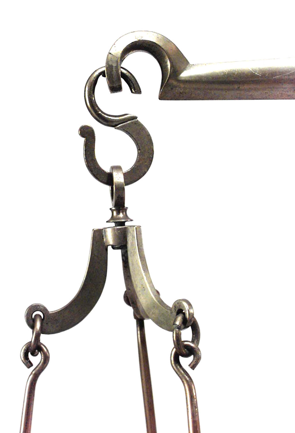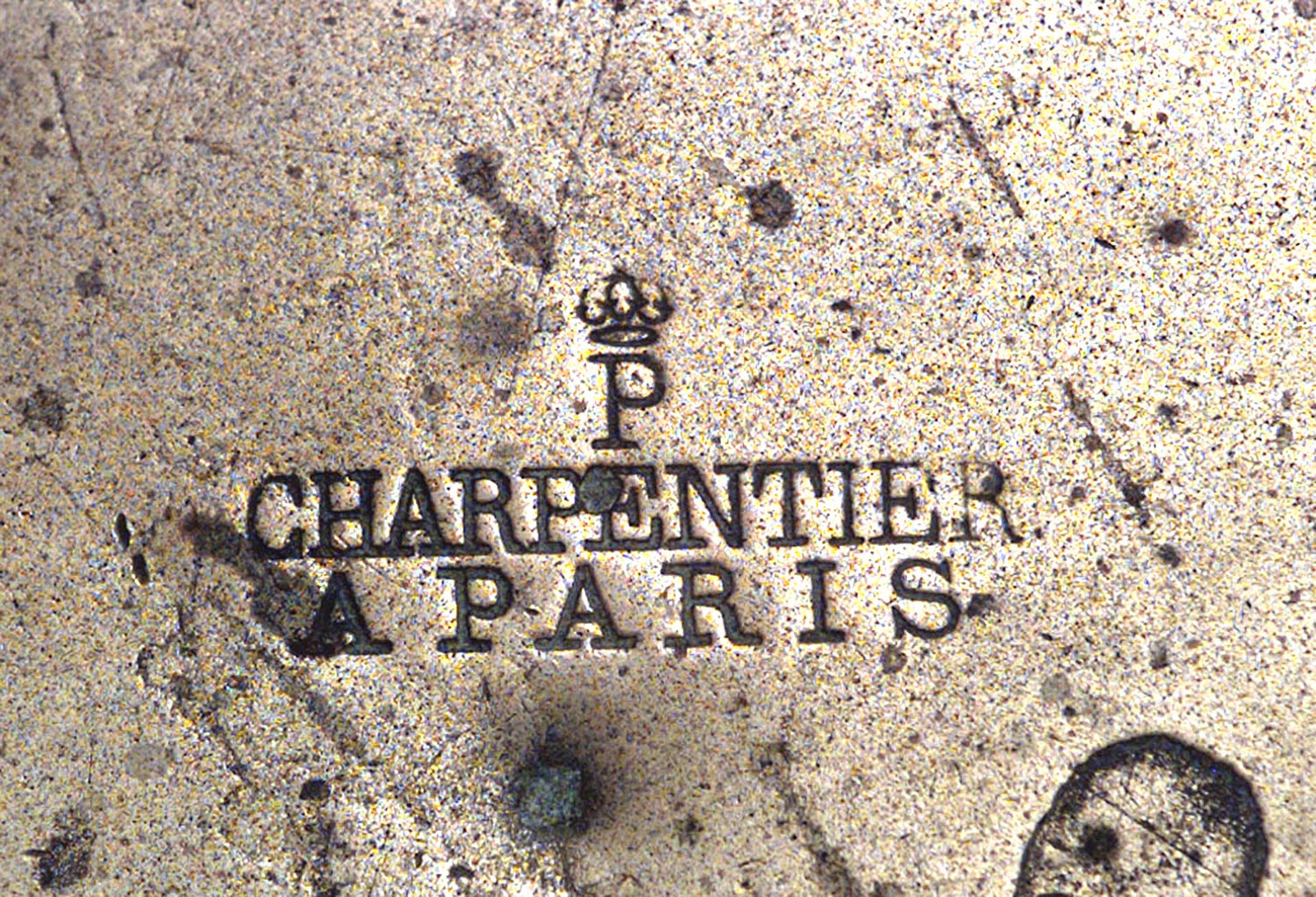 French Victorian brass scale with 2 round trays on square wooden base (signed CHARPENTIER with hallmark)