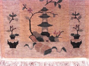 Chinese Art Deco style gold wool rug carpet with pagoda design (4 x 2')..