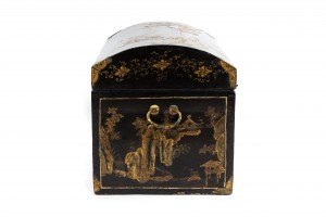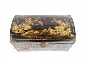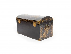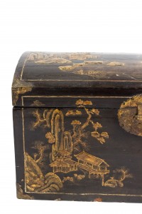 Asian Chinese black lacquered floor trunk with a rounded arch shaped top and decorated with Chinese genre scenes and having a red painted and parcel gilt interior.