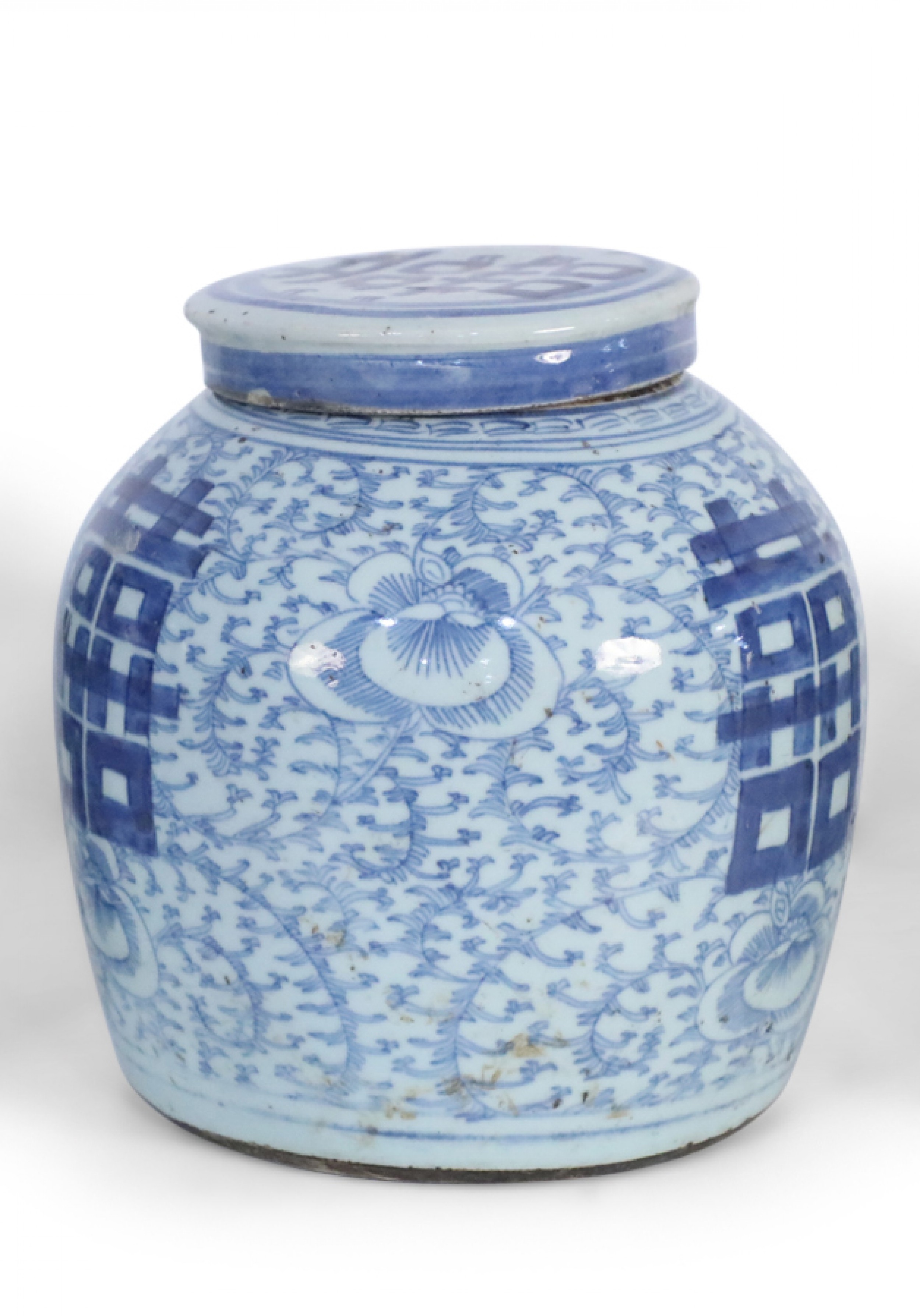Antique Chinese (Late 19th Century) ceramic lidded ginger jar with blue floral designs surrounding a bold, centered character and geometric patterned band leading to a brown rustic stripe at the mouth opening.