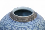 Antique Chinese (Late 19th Century) ceramic lidded ginger jar with blue floral designs surrounding a bold, centered character and geometric patterned band leading to a brown rustic stripe at the mouth opening..