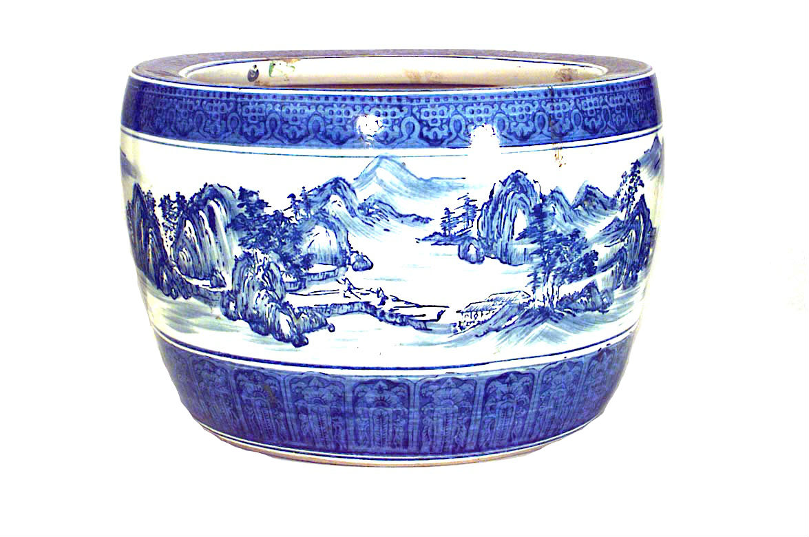 2 Asian Chinese-style (20th Century) blue and white porcelain jardinieres with scenes (PRICED EACH).