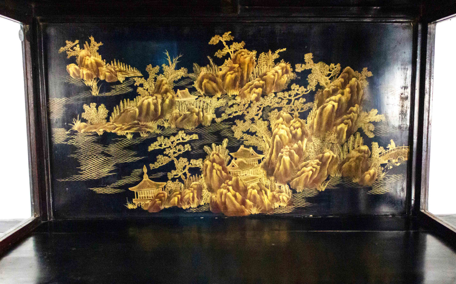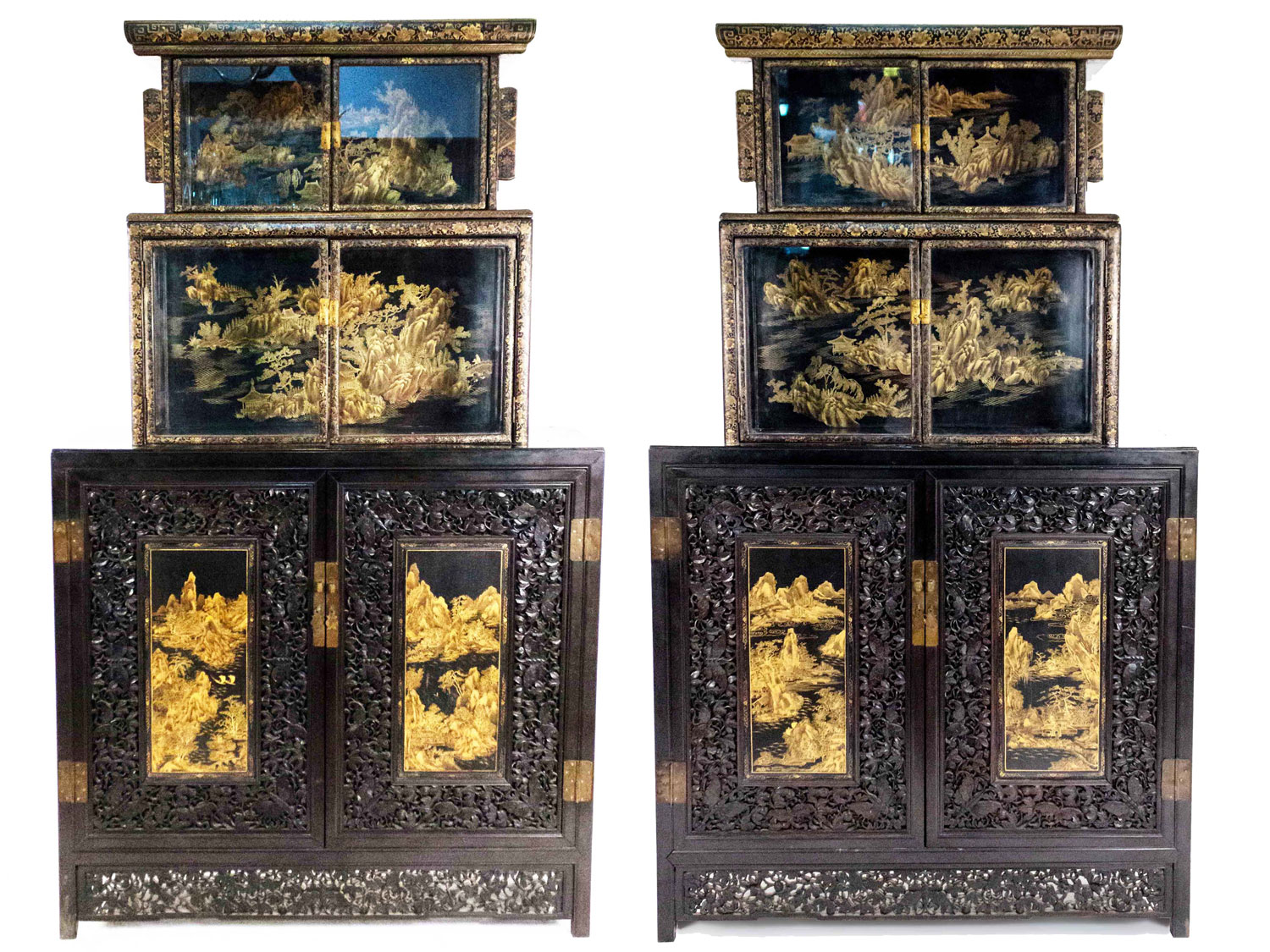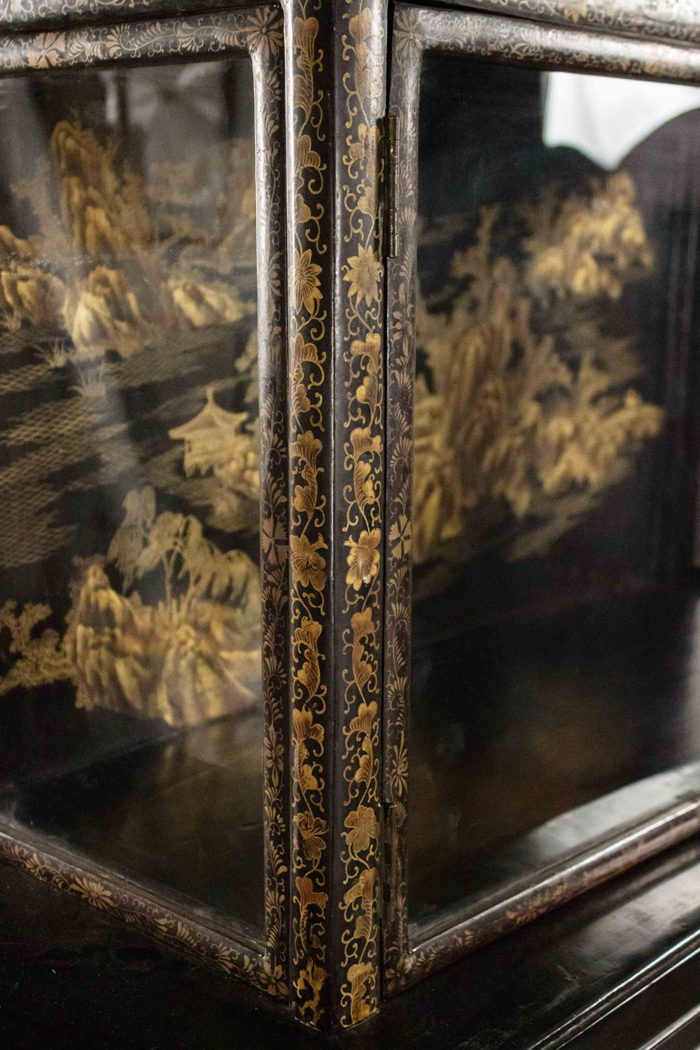 PAIR of Chinese black lacquered (19th Century) three-tiered glass & wooden cabinets decorated with landscape scenes & carved borders with brass hardware & detailed interior (PRICED AS PAIR).