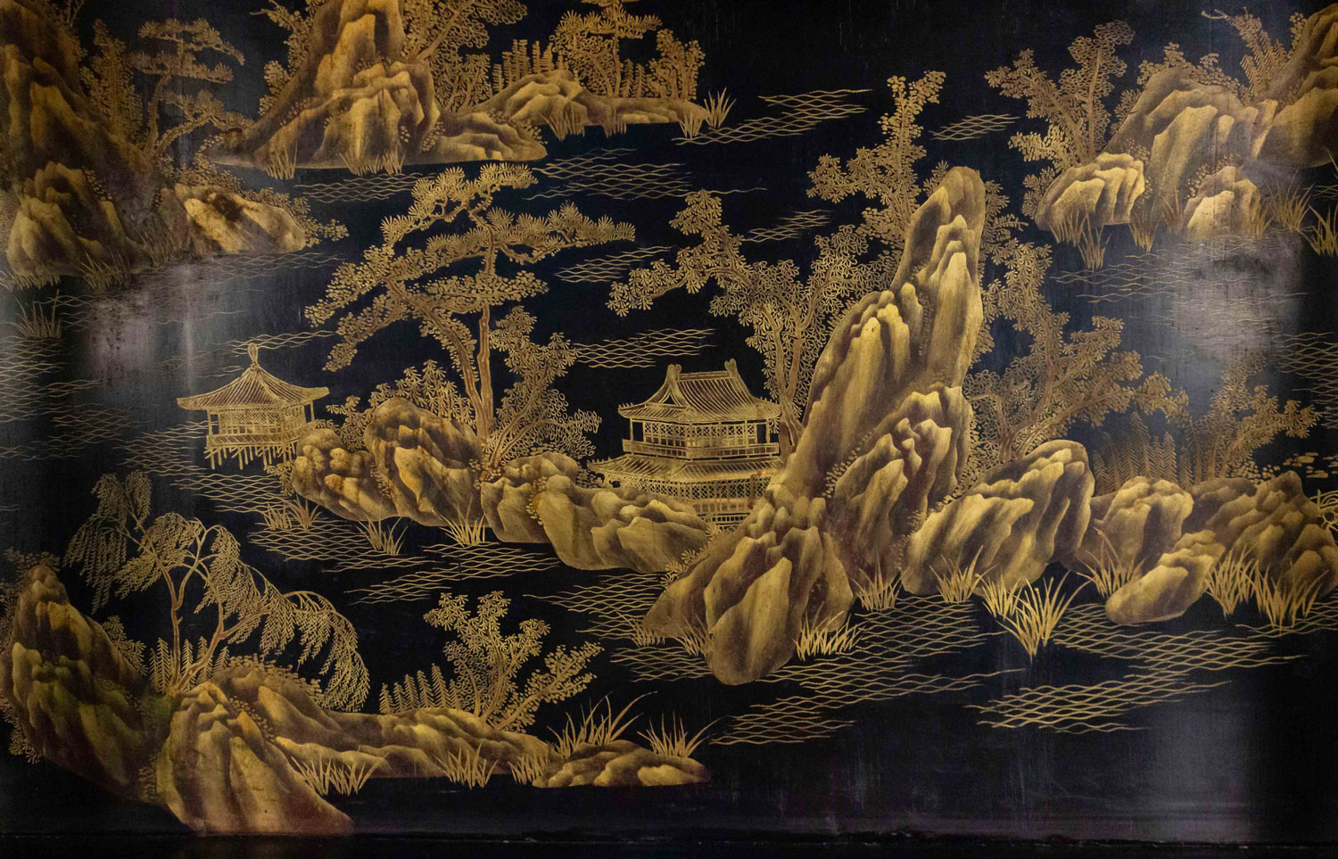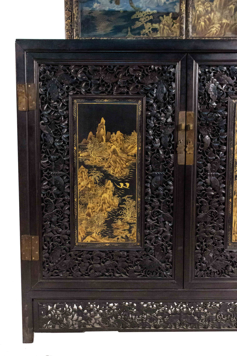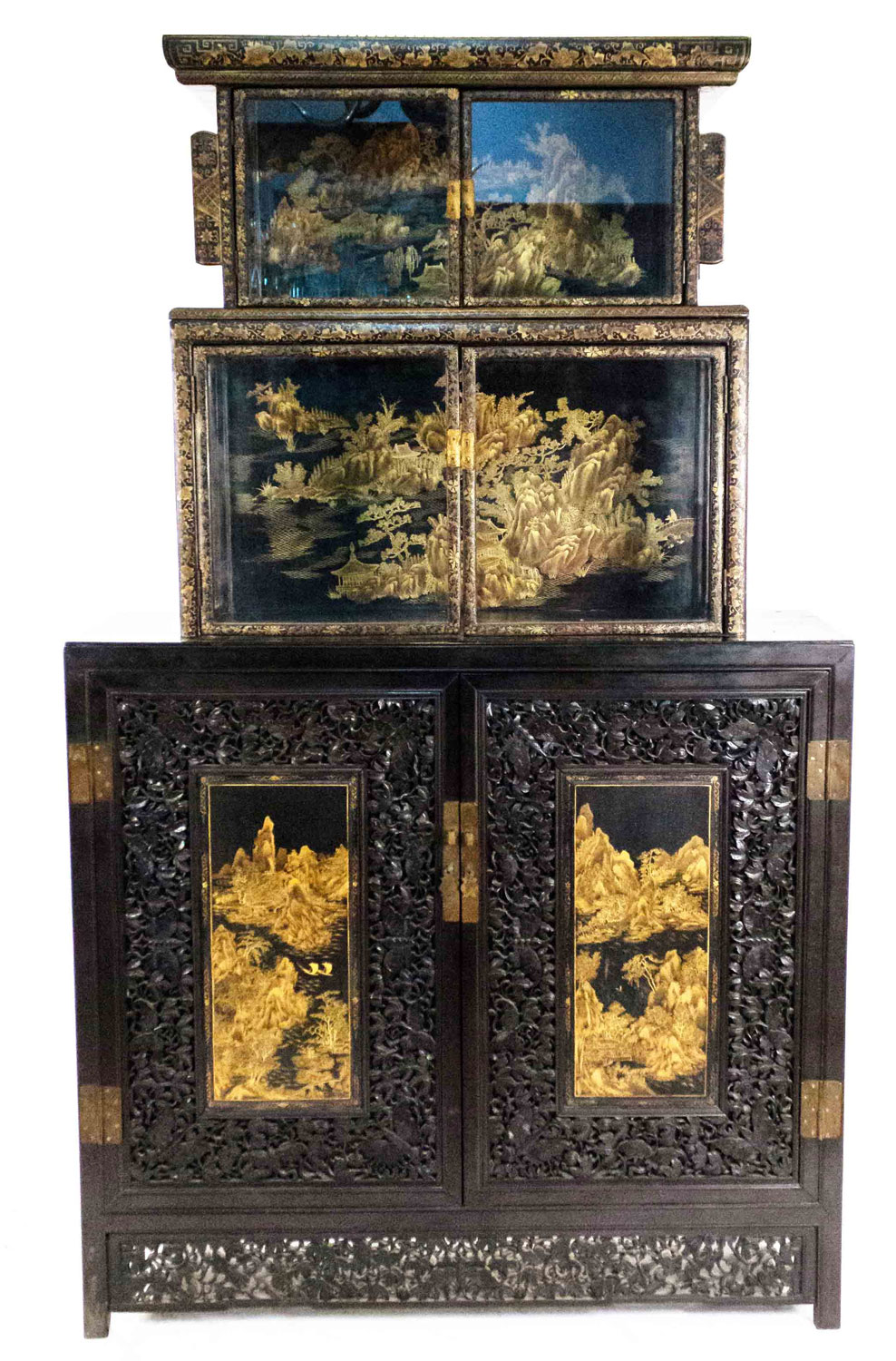 PAIR of Chinese black lacquered (19th Century) three-tiered glass & wooden cabinets decorated with landscape scenes & carved borders with brass hardware & detailed interior (PRICED AS PAIR).