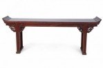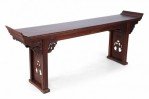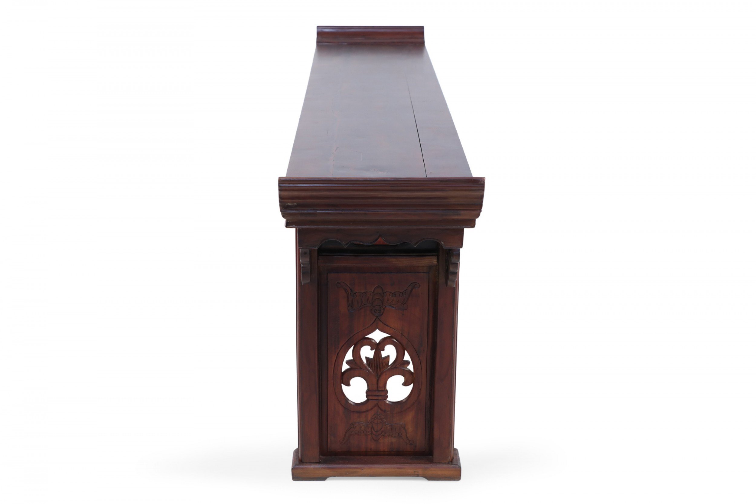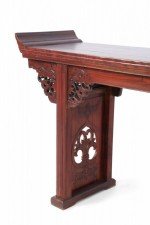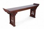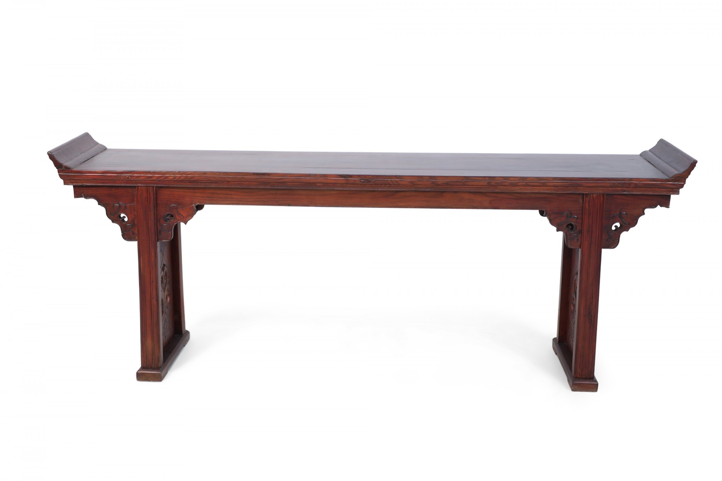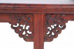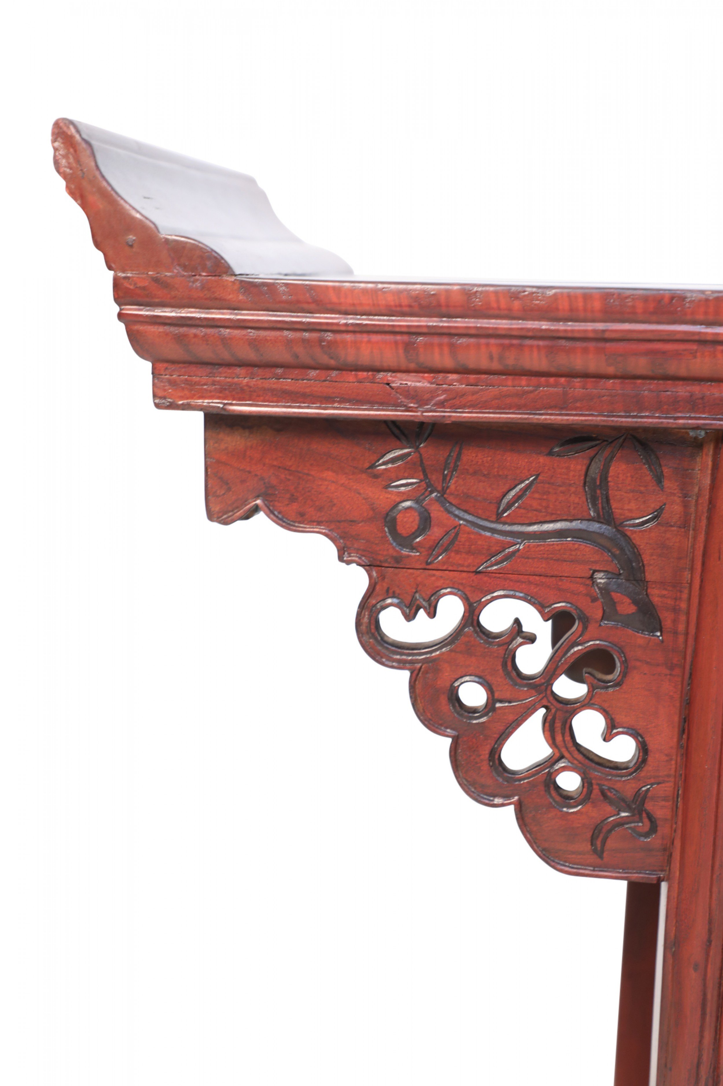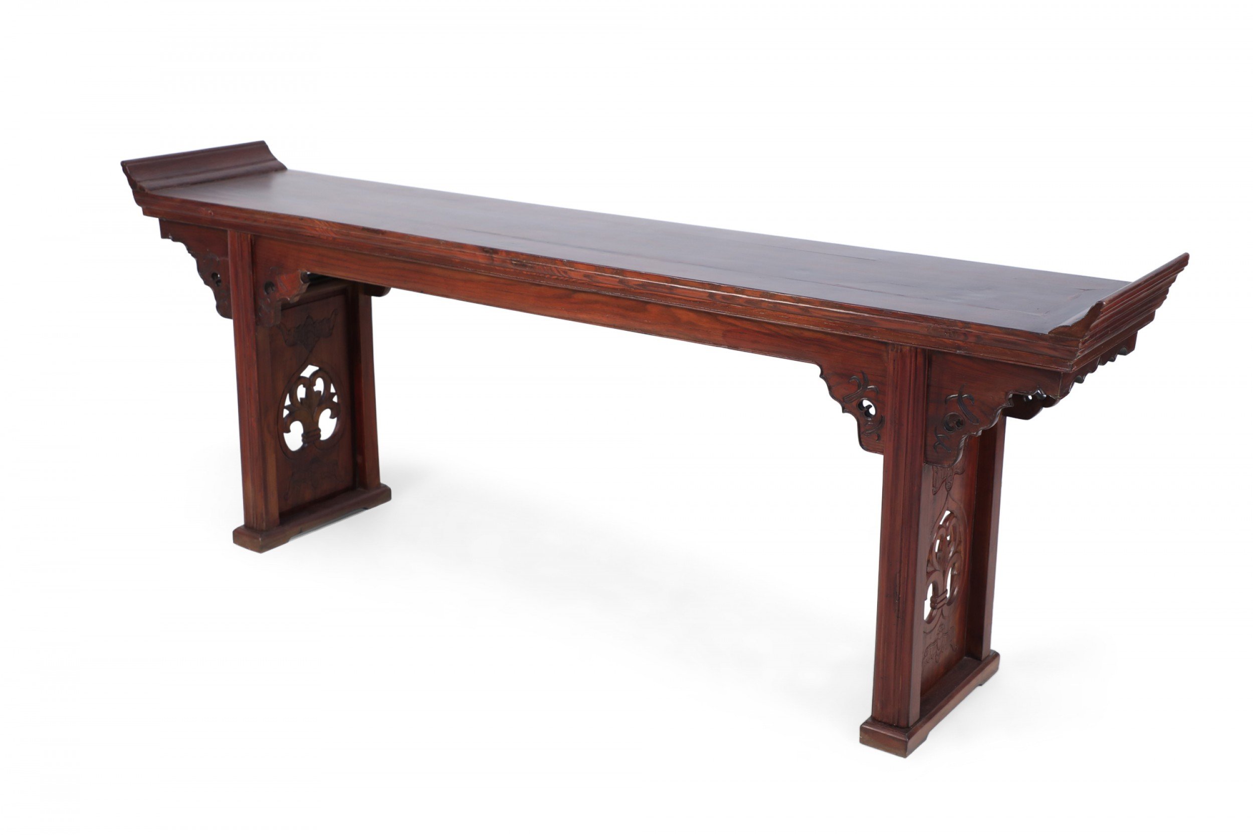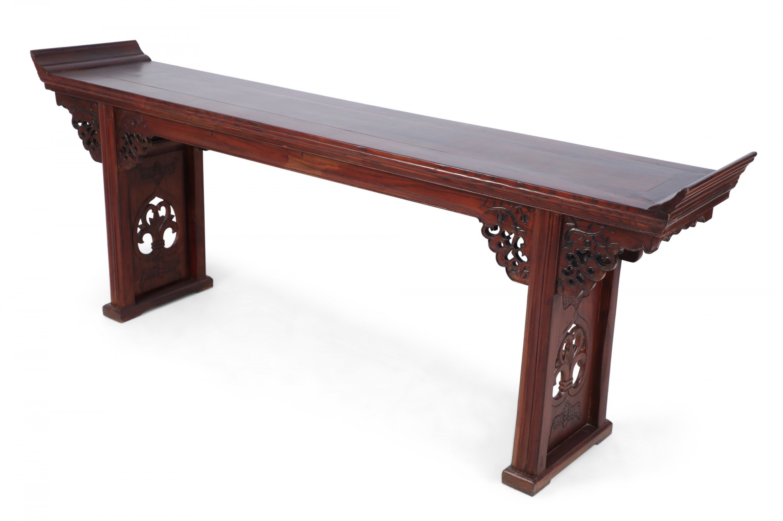 Chinese hardwood altar / console table accented with ornately carved and pierced spandrels and recessed legs and topped with a surface bearing gently sloping sides.