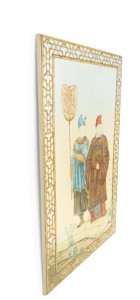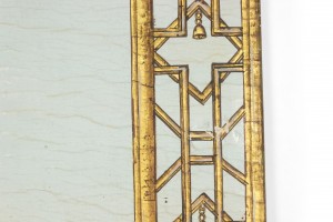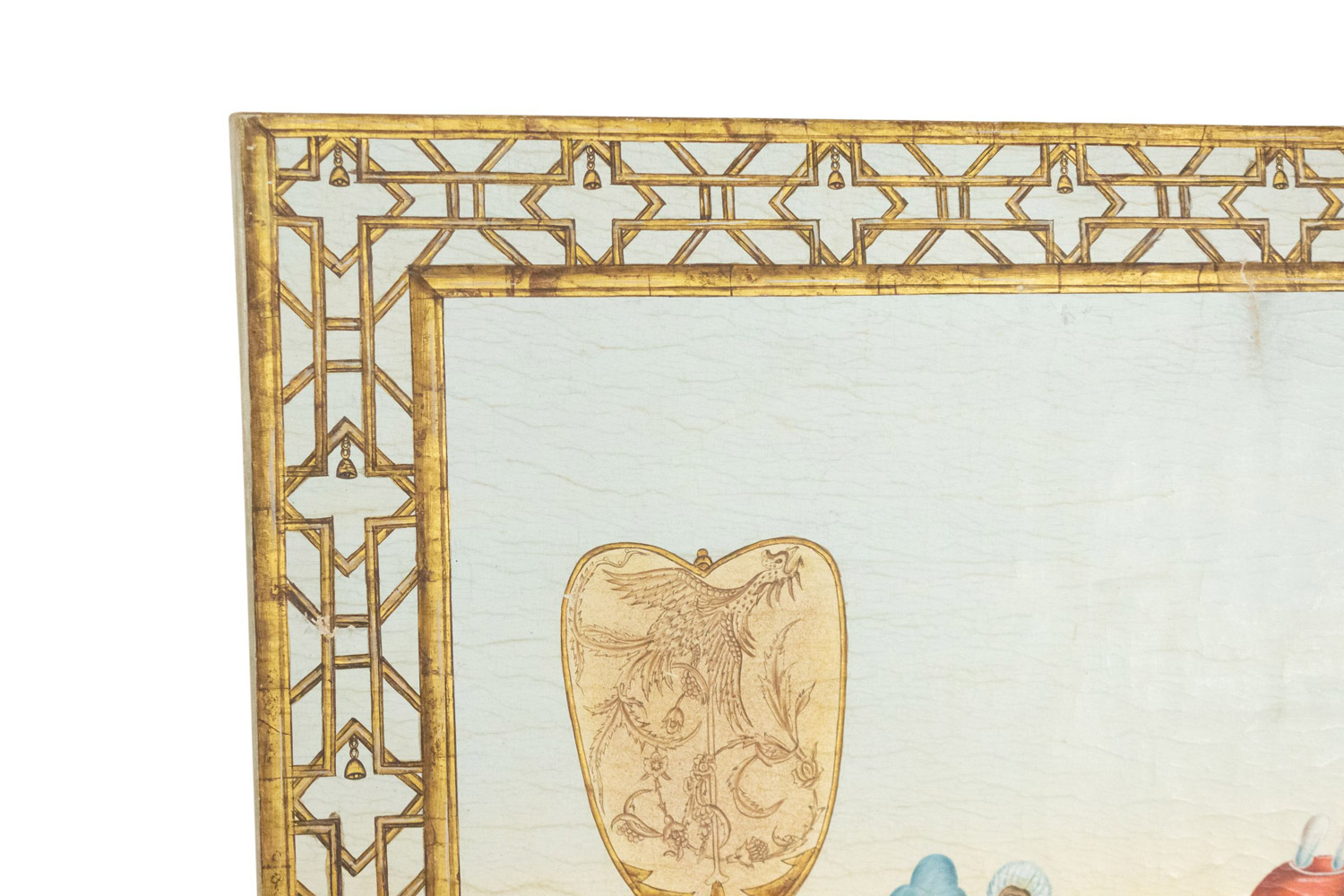 Asian Chinese style oil painting portrait on canvas of figural chinoiserie scene of man and servant with fan framed by gold leaf painted fretwork (Similar to 058970).