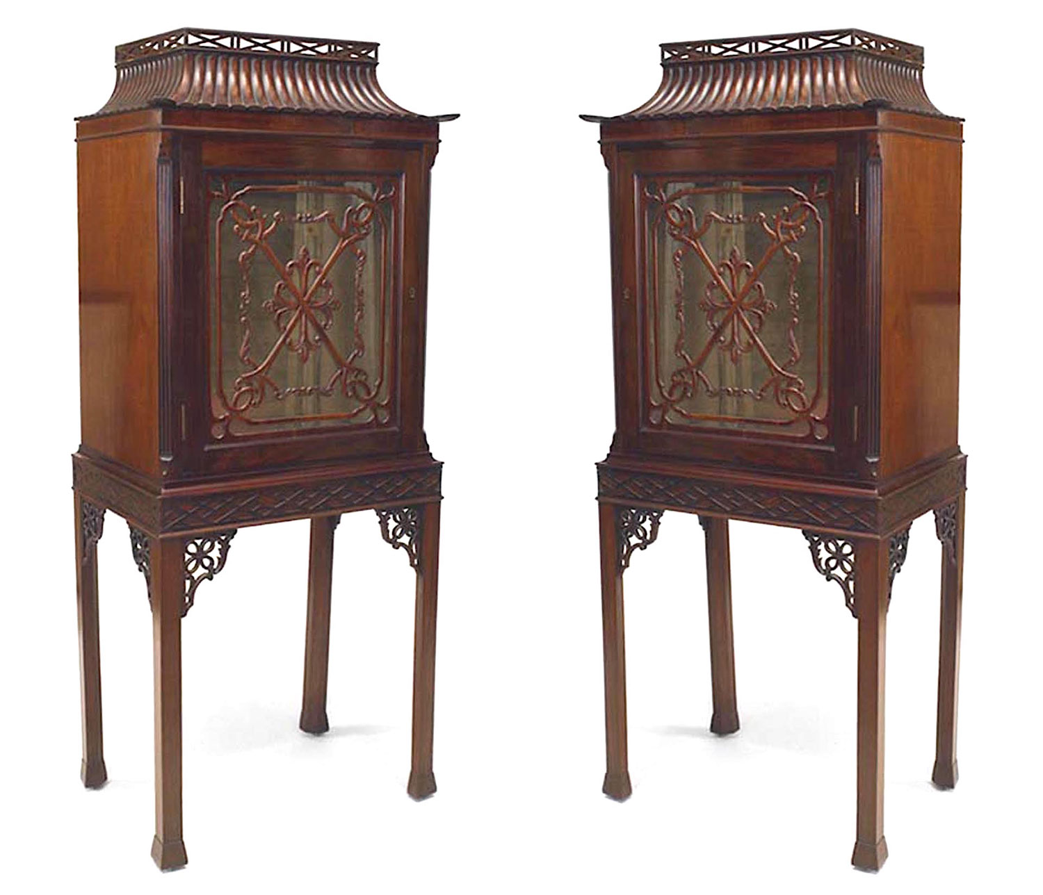 Pair of Chinese Chippendale Mahogany Curio Cabinets