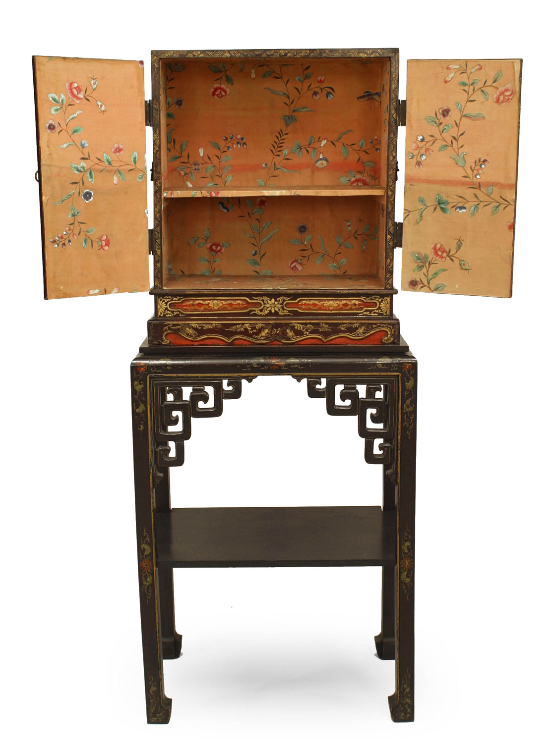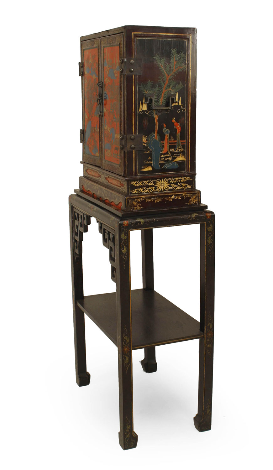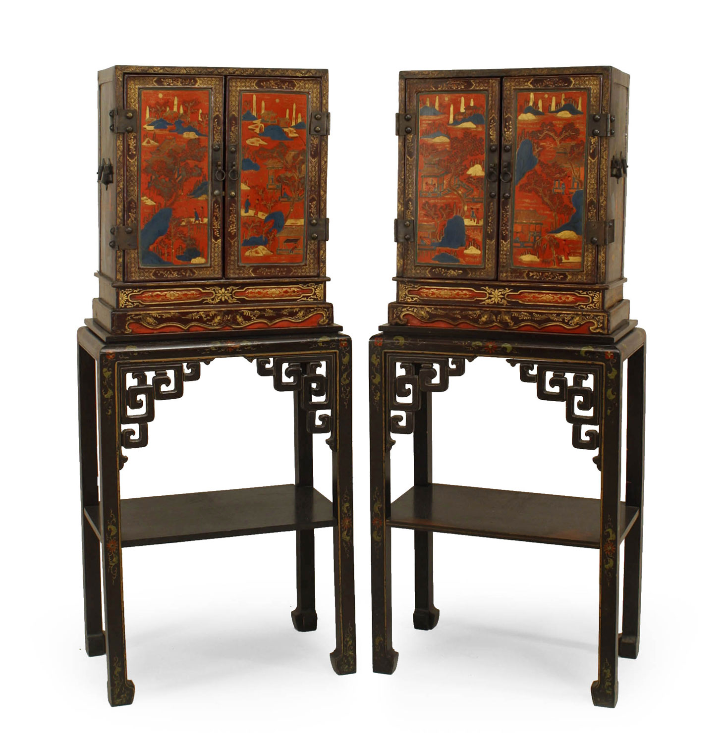 PAIR of Asian Chinese (19th Century) decorated lacquered small 2 door cabinets with scenes and figures on rectangular stands with filigree corners and shelf (PRICED AS PAIR).