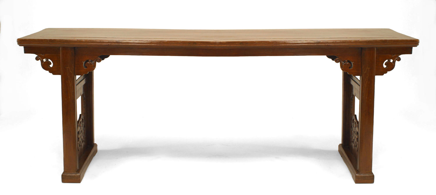 Chinese (19th Century) elmwood (yu-mu) large console table with carved cloud form scrolls between the legs on the apron and filigree carving with a stretcher on the sides..