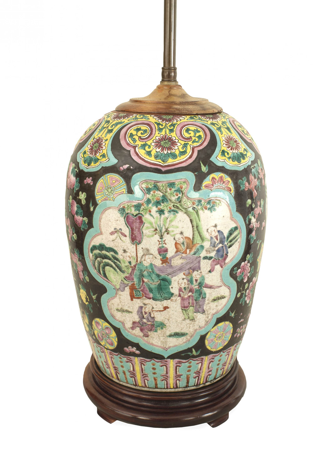 Asian Chinese style (20th Cent) ginger jar shaped table lamp with a black, green & blue background with figures on a wood base.