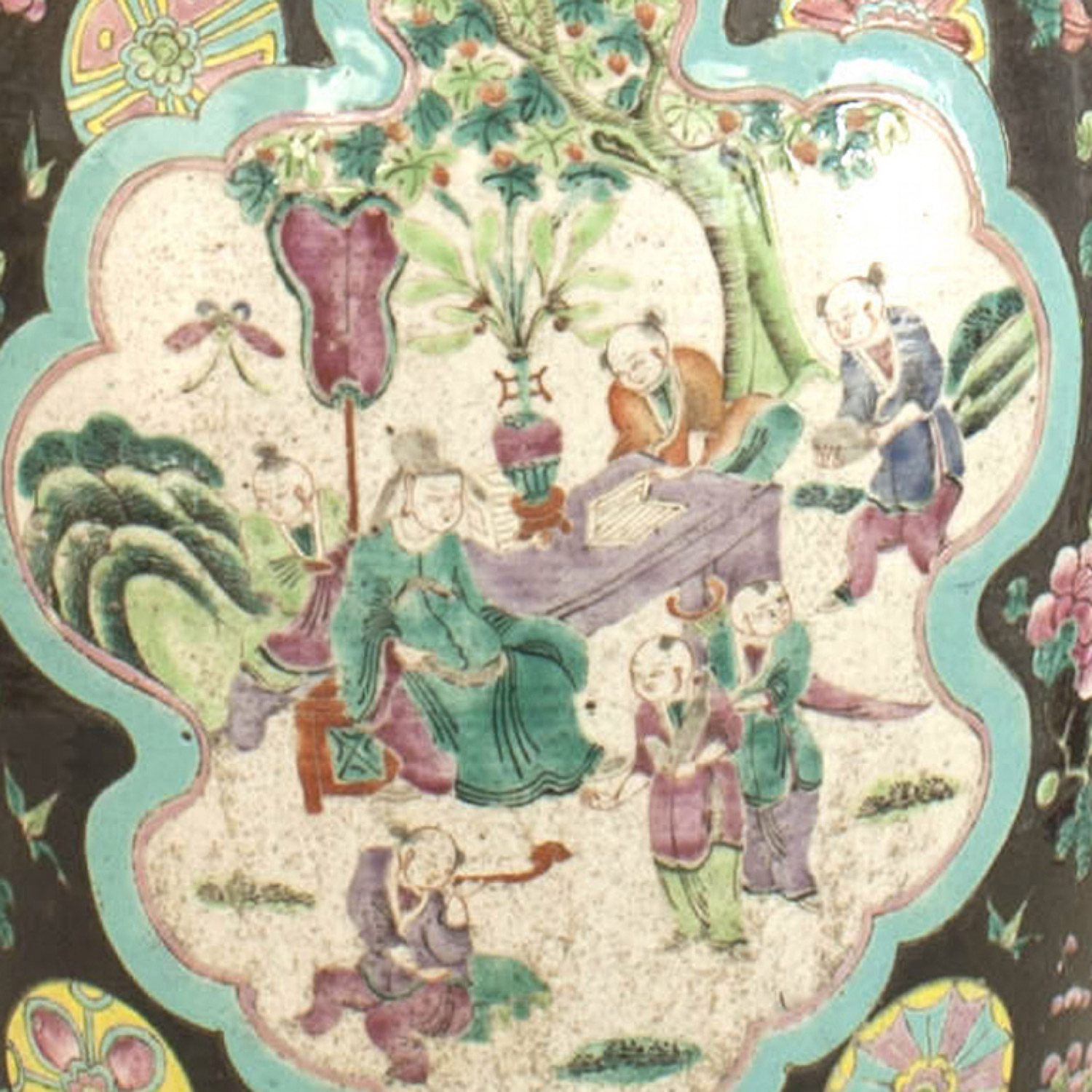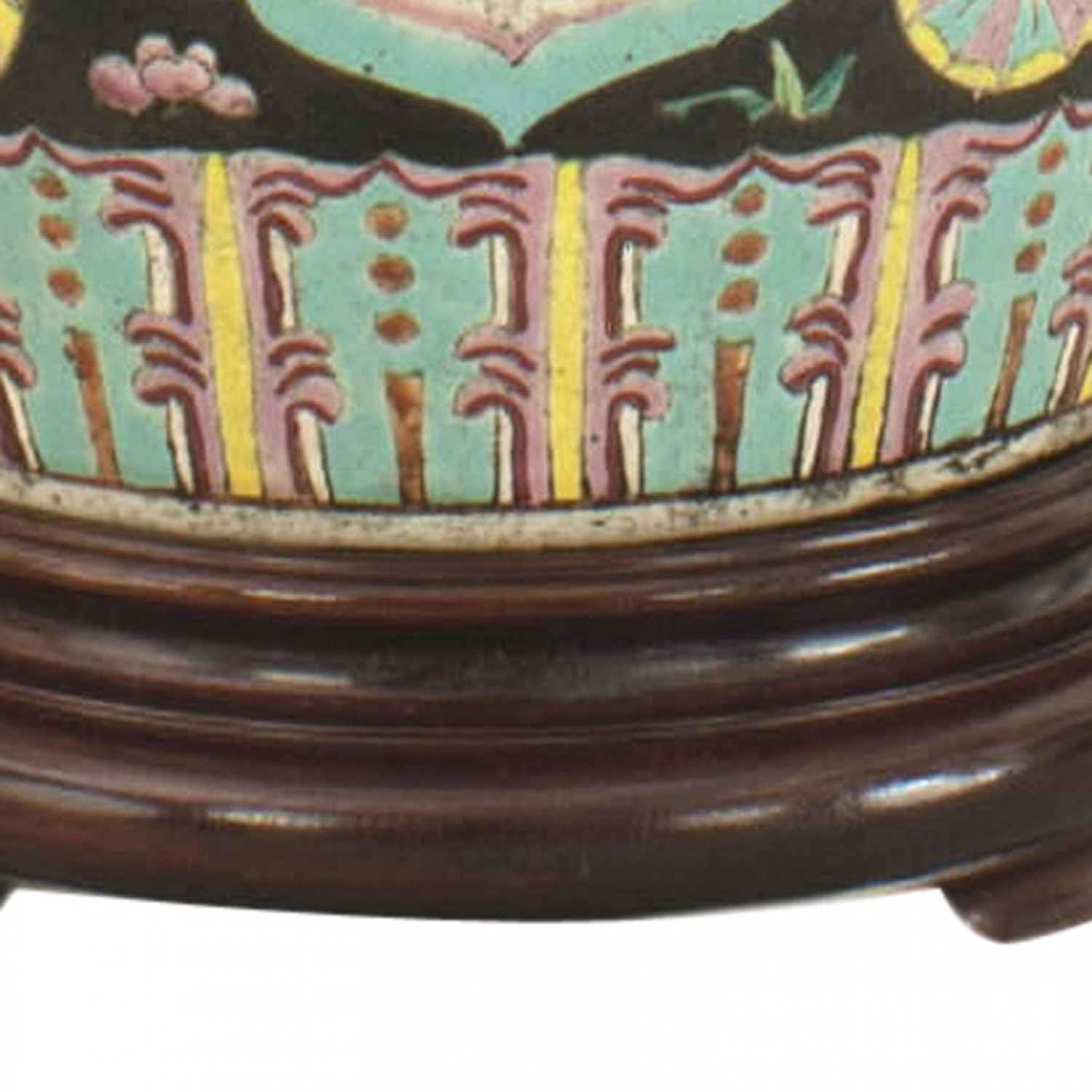Asian Chinese style (20th Cent) ginger jar shaped table lamp with a black, green & blue background with figures on a wood base..