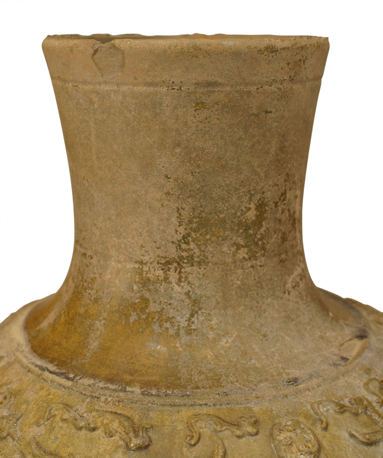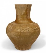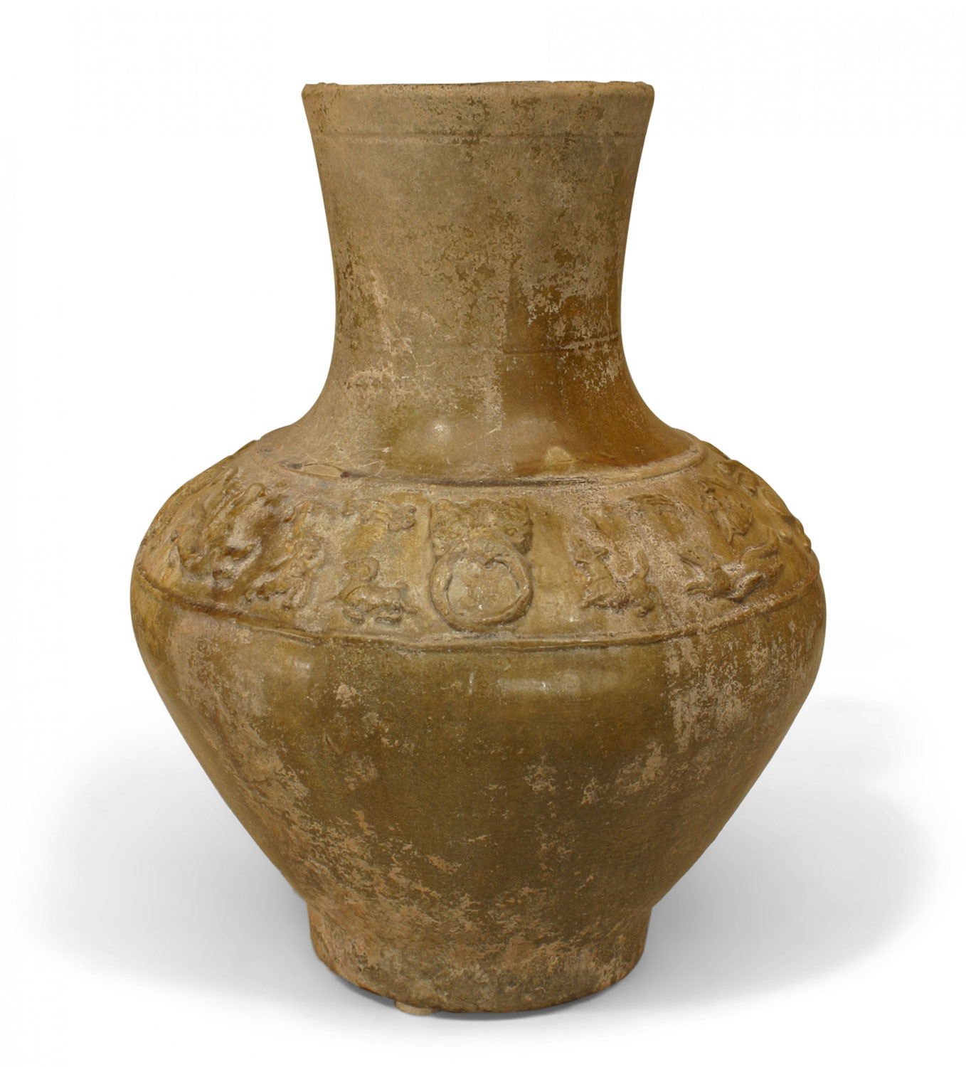 Asian Chinese (Han Dynasty 206BC-220AD) amber glazed pottery vase (jar) with a band of animals in relief raised on a modern 2½" high base..