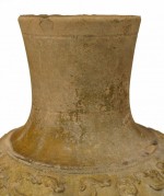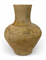 Asian Chinese (Han Dynasty 206BC-220AD) amber glazed pottery vase (jar) with a band of animals in relief raised on a modern 2½" high base.
