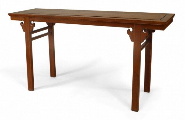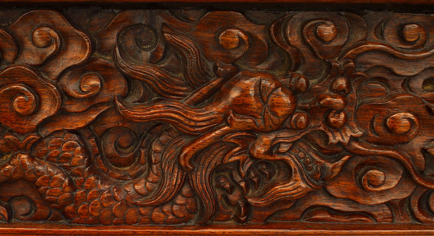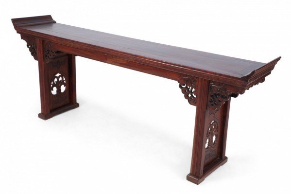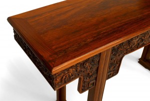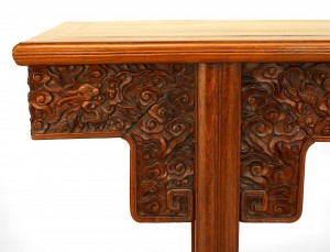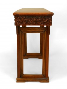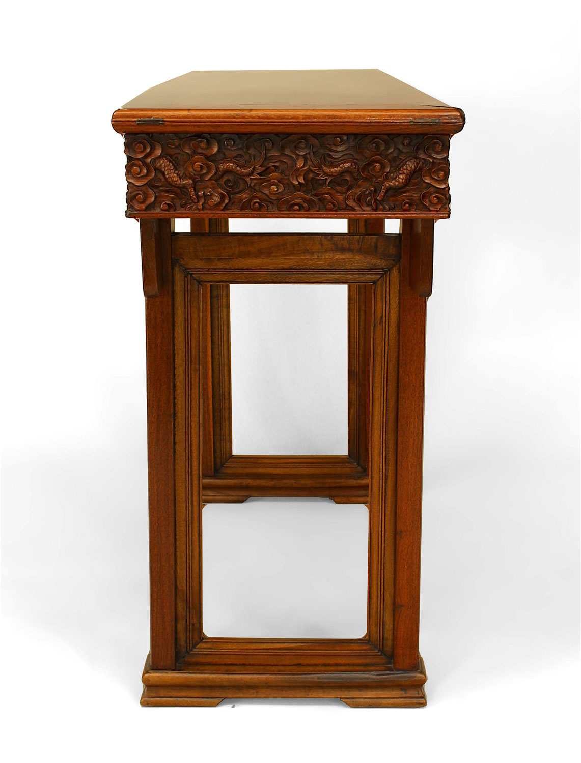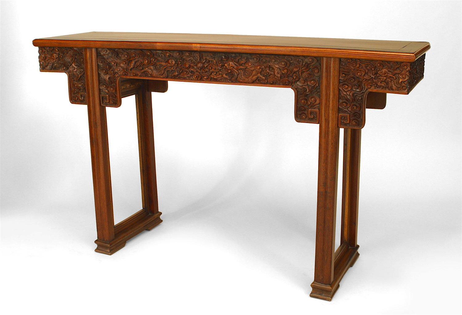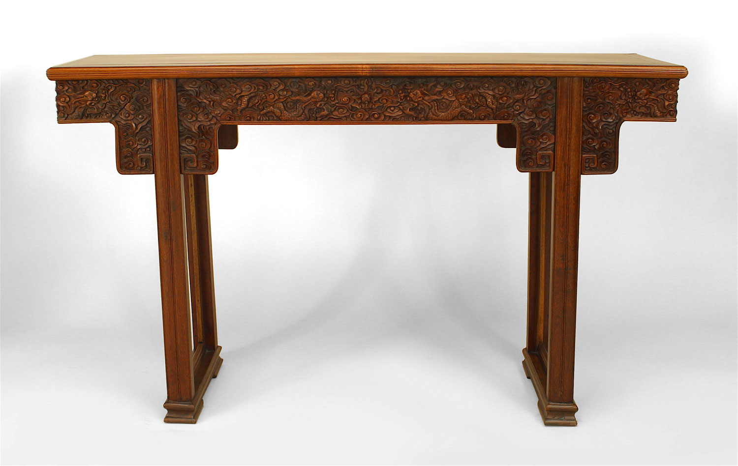 PAIR of Asian Chinese (Qing Dynasty - 18/19th Century) hardwood console scroll tables with a finely carved apron with Shou & Fu characters and dragons with clouds in relief. (PRICED AS PAIR)