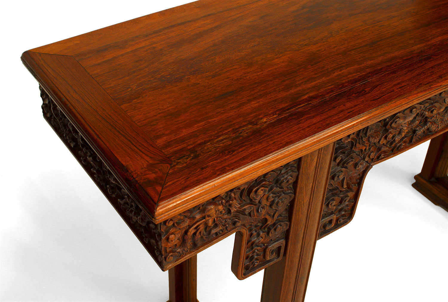 PAIR of Asian Chinese (Qing Dynasty - 18/19th Century) hardwood console scroll tables with a finely carved apron with Shou & Fu characters and dragons with clouds in relief. (PRICED AS PAIR).