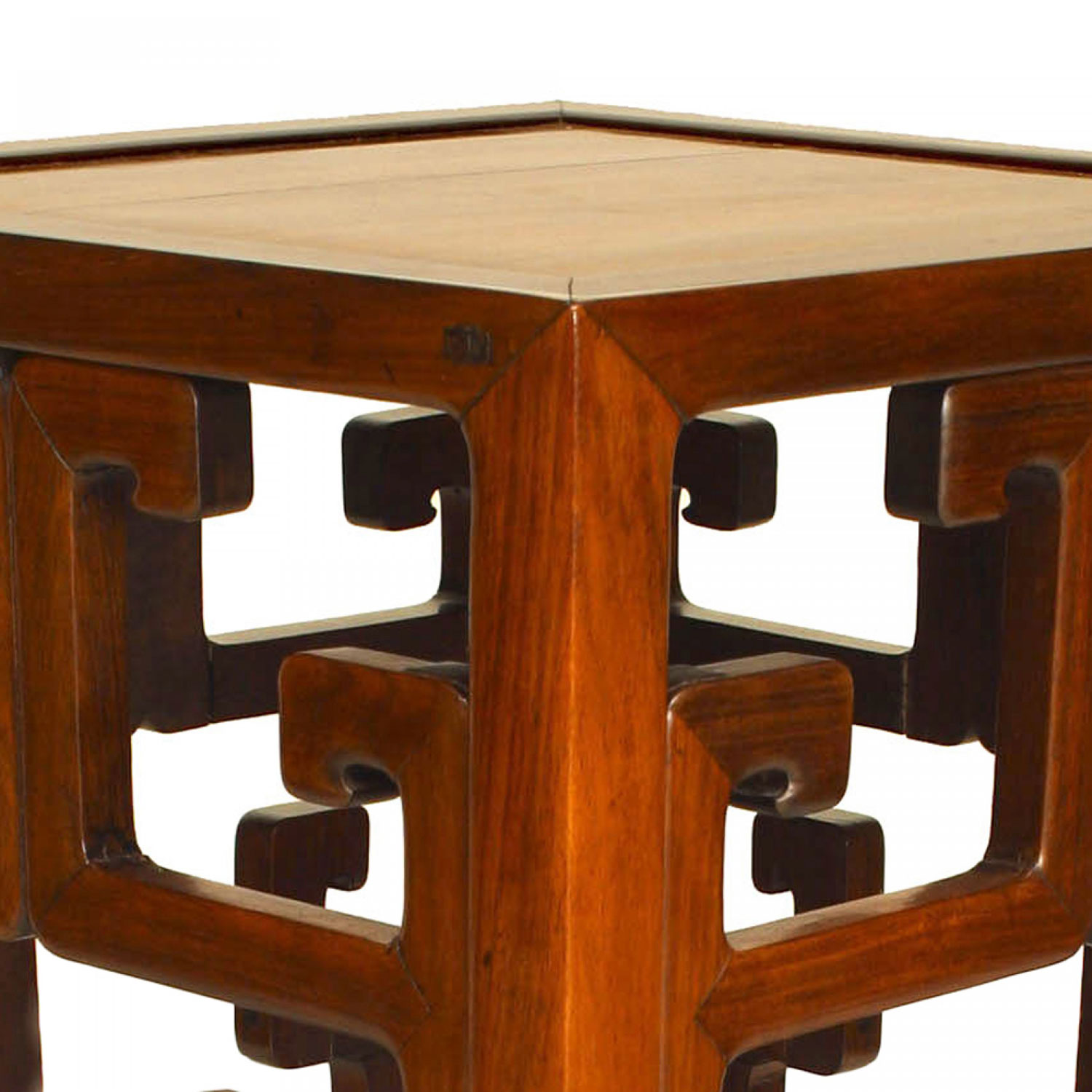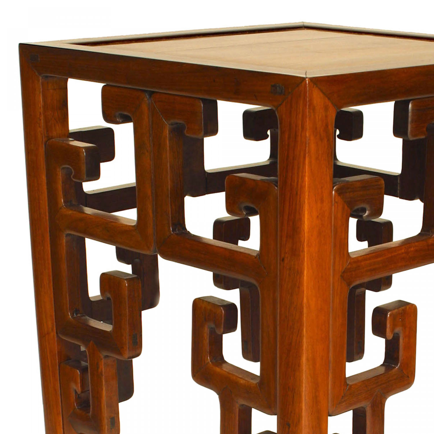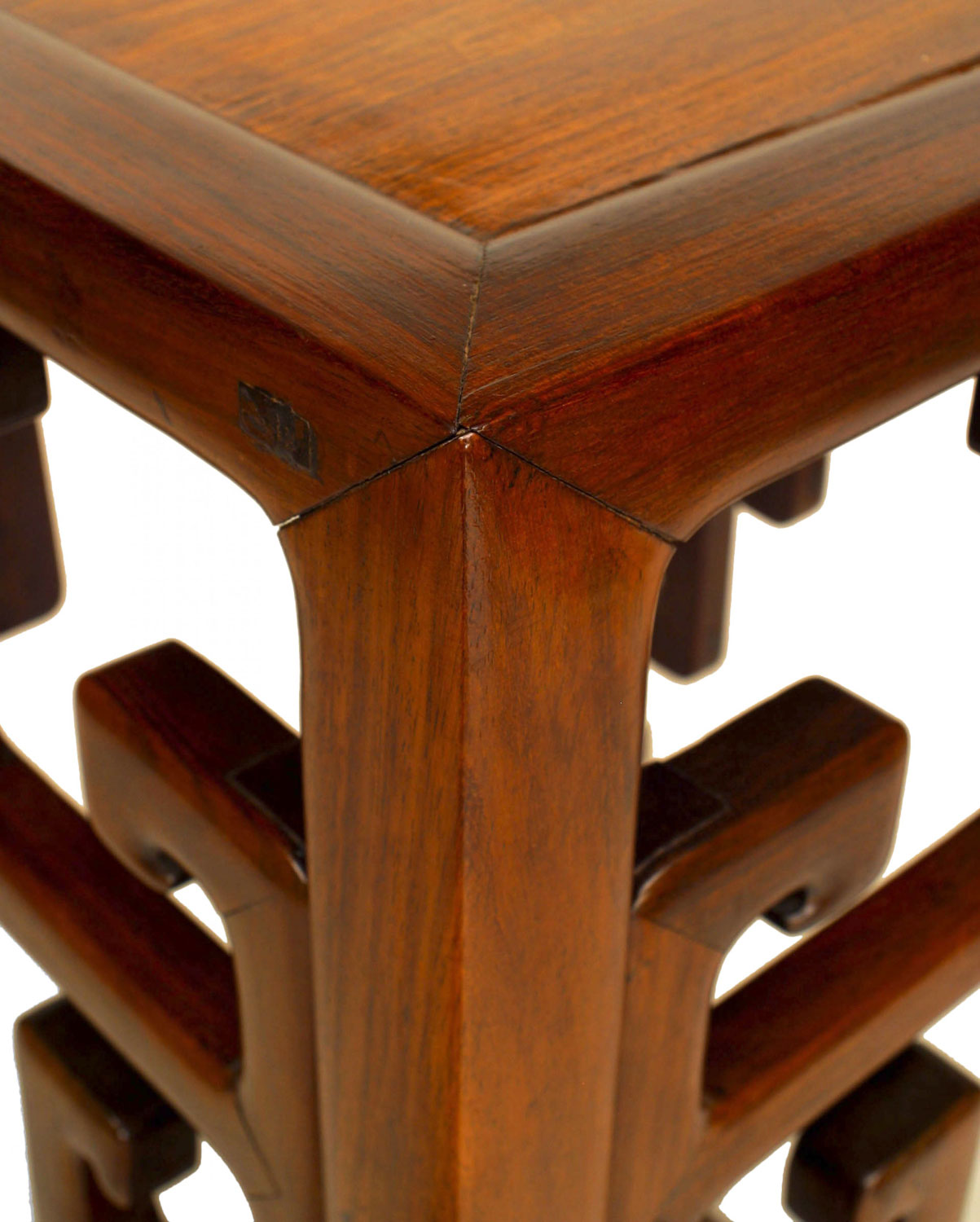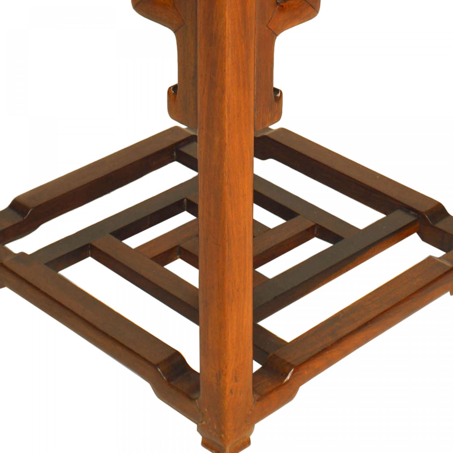 Asian Chinese (Qing Dynasty-probably 18th Cent) hardwood pedestal stand with an open design under top and a box stretcher with an open design.
