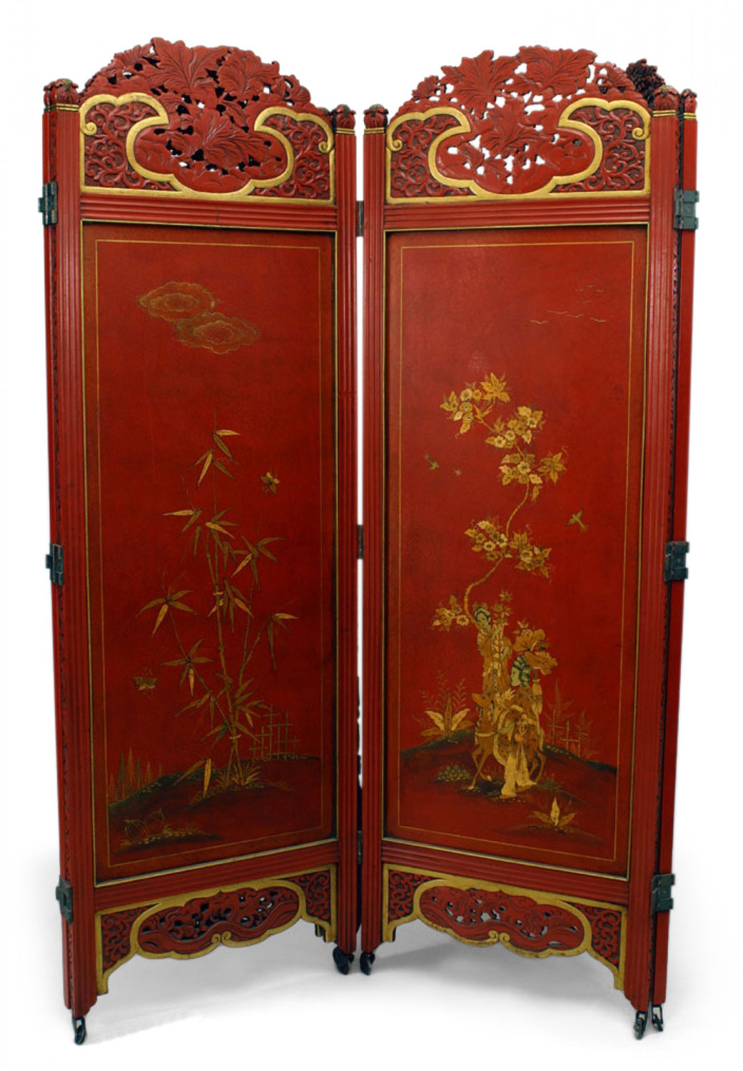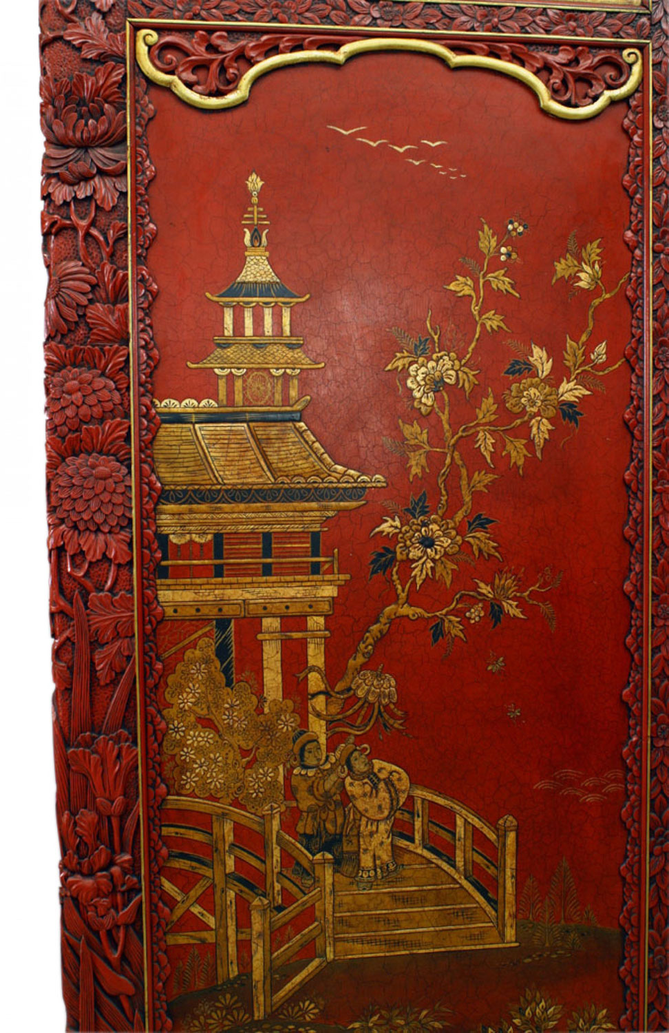 Chinese style (19th/20th century ) red and gold lacquered 4 fold screen featuring a carved floral frame and a Chinoiserie design.