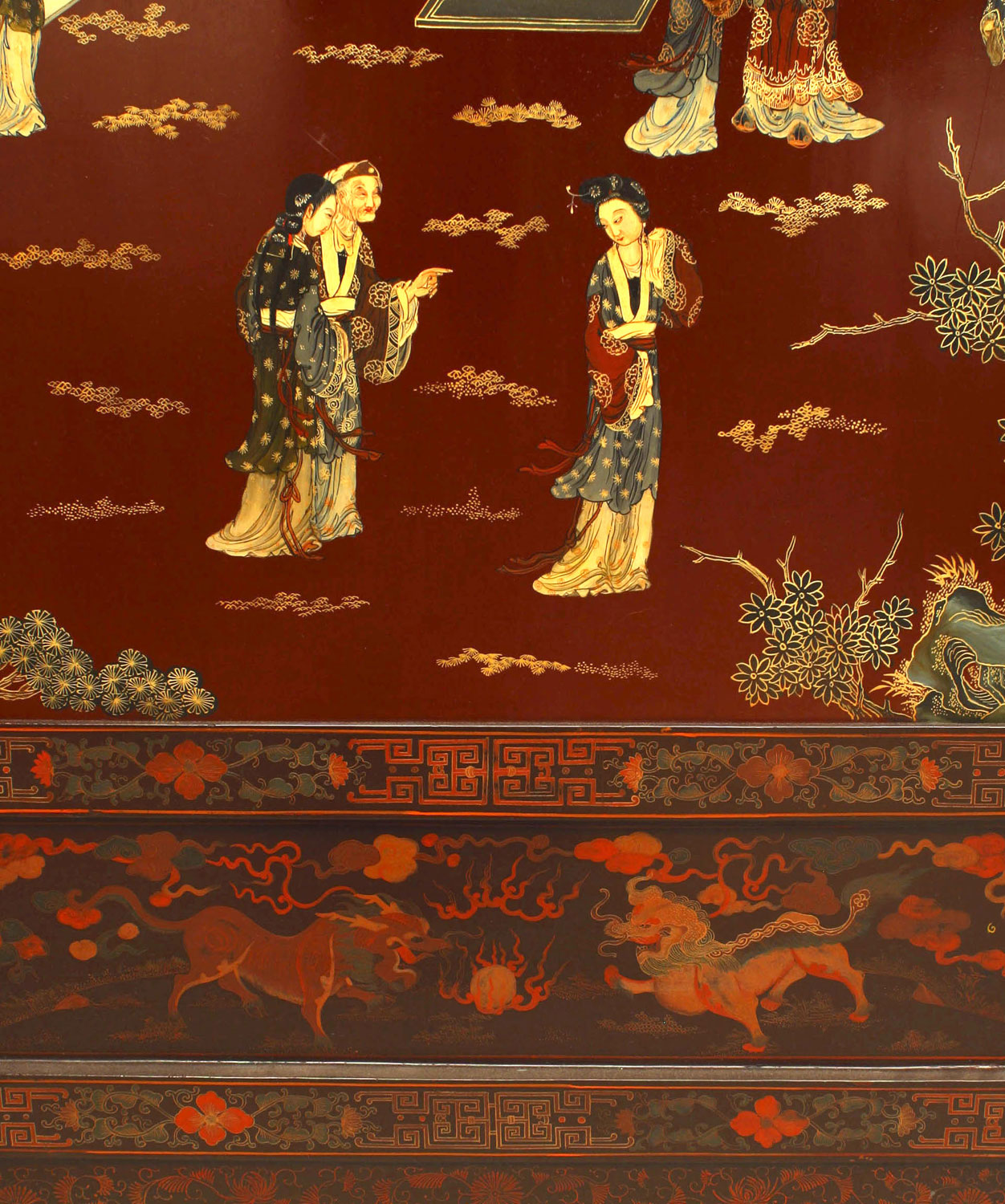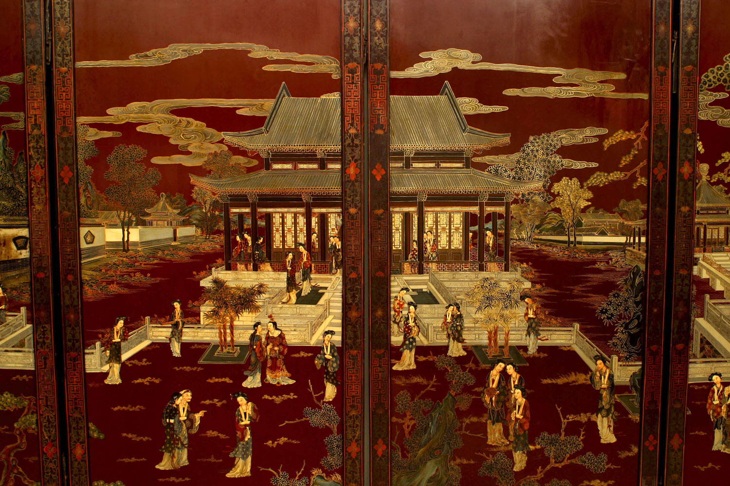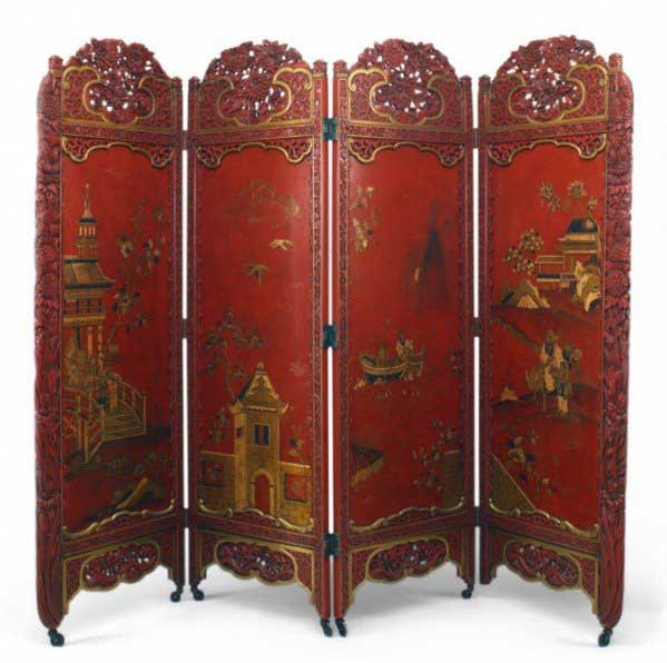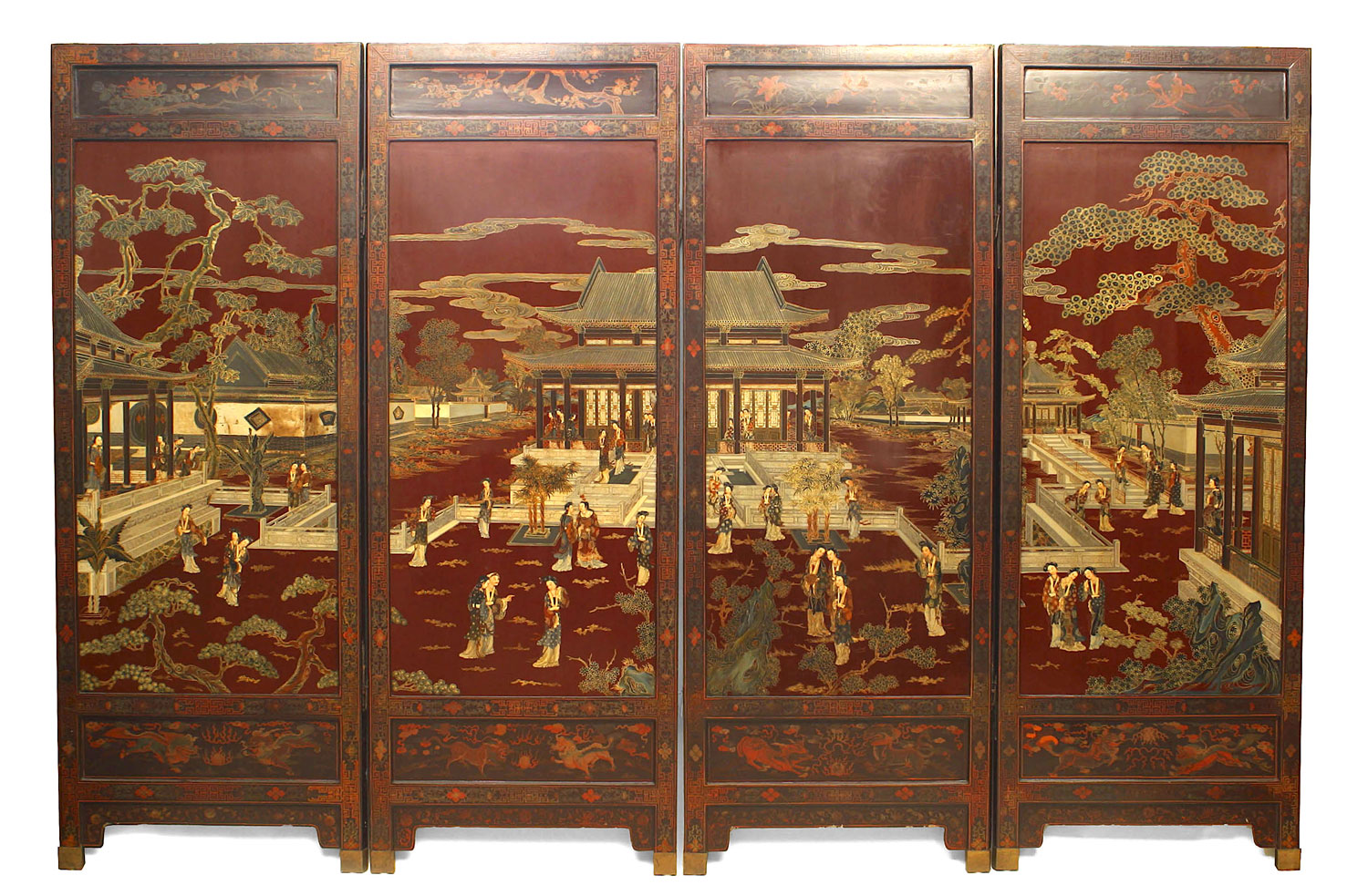 Chinese Quing Dynasty Red Lacquered 4-Fold Screen
