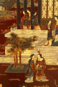 Asian Chinese (Qing Dynasty 18/19th Century) 4 panel screen with a (restored) maroon lacquered background and finely decorated scene of figures and palace in a black lacquered frame.