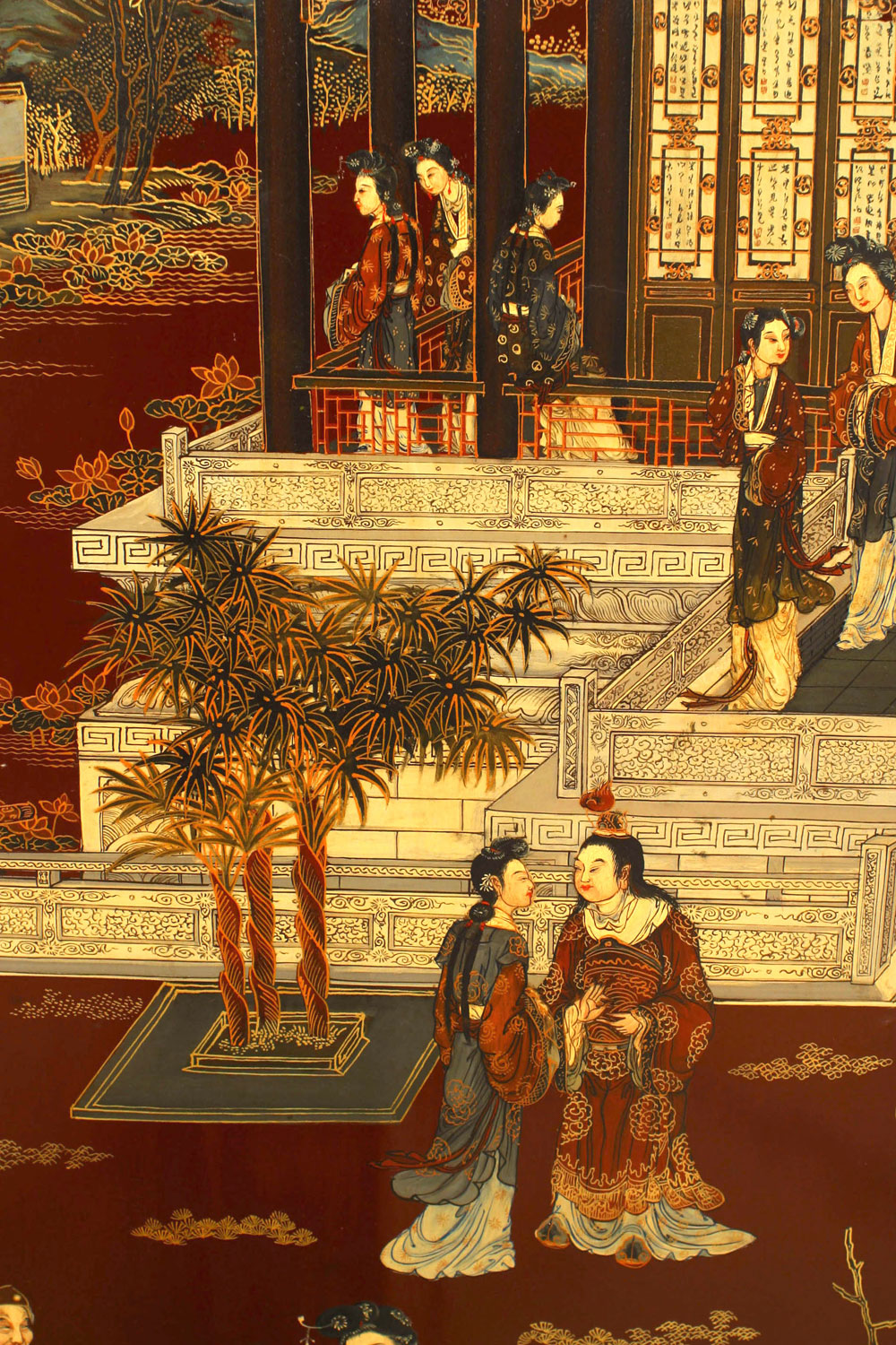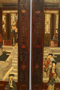 Asian Chinese (Qing Dynasty 18/19th Century) 4 panel screen with a (restored) maroon lacquered background and finely decorated scene of figures and palace in a black lacquered frame..
