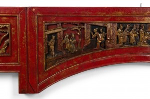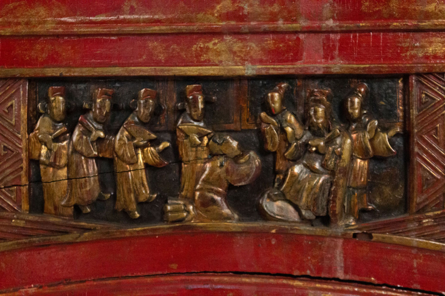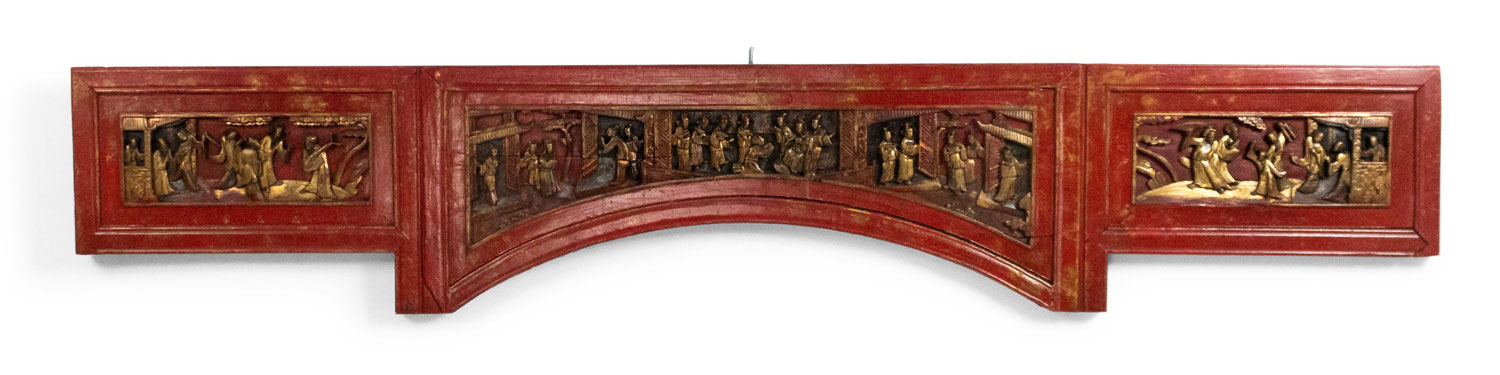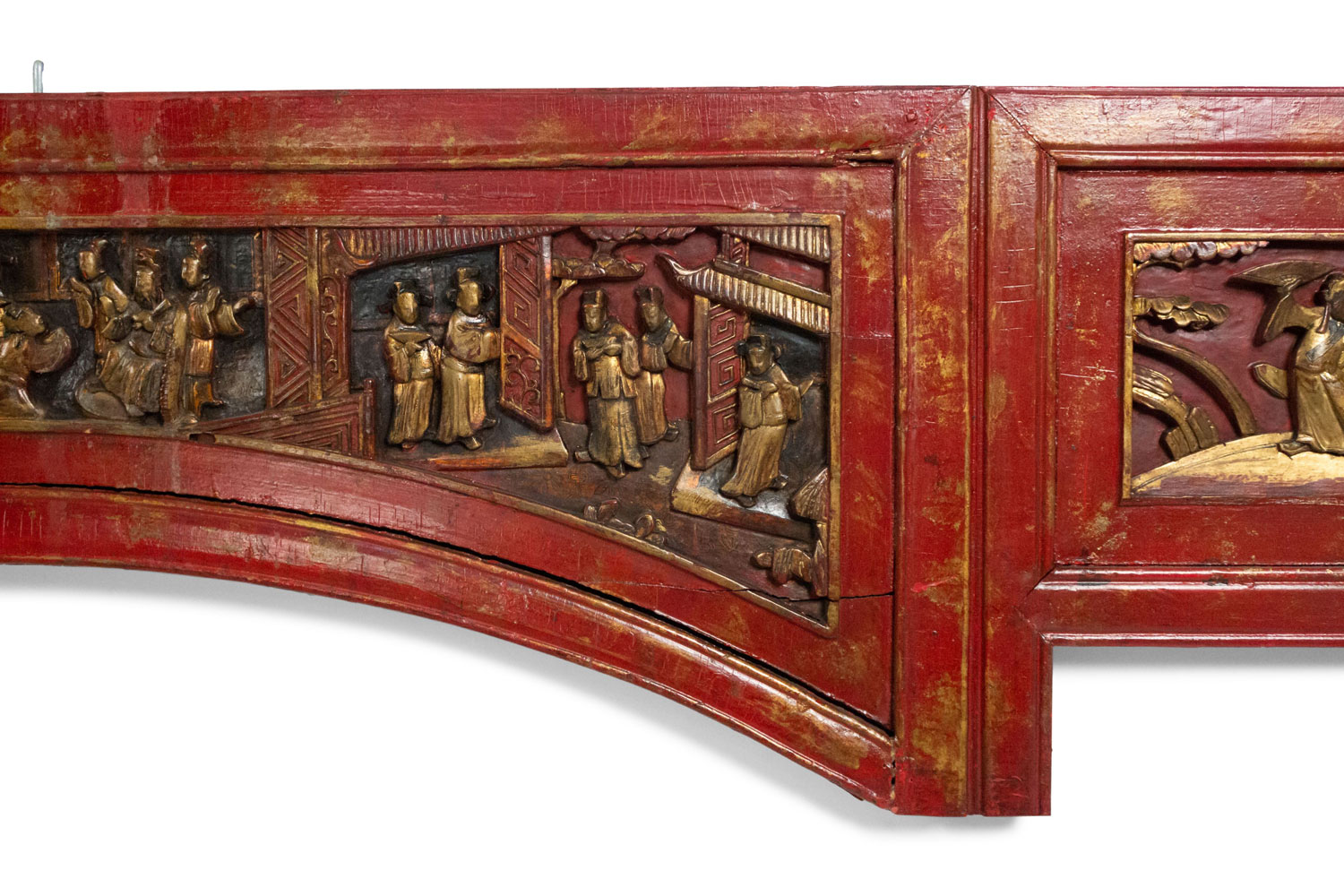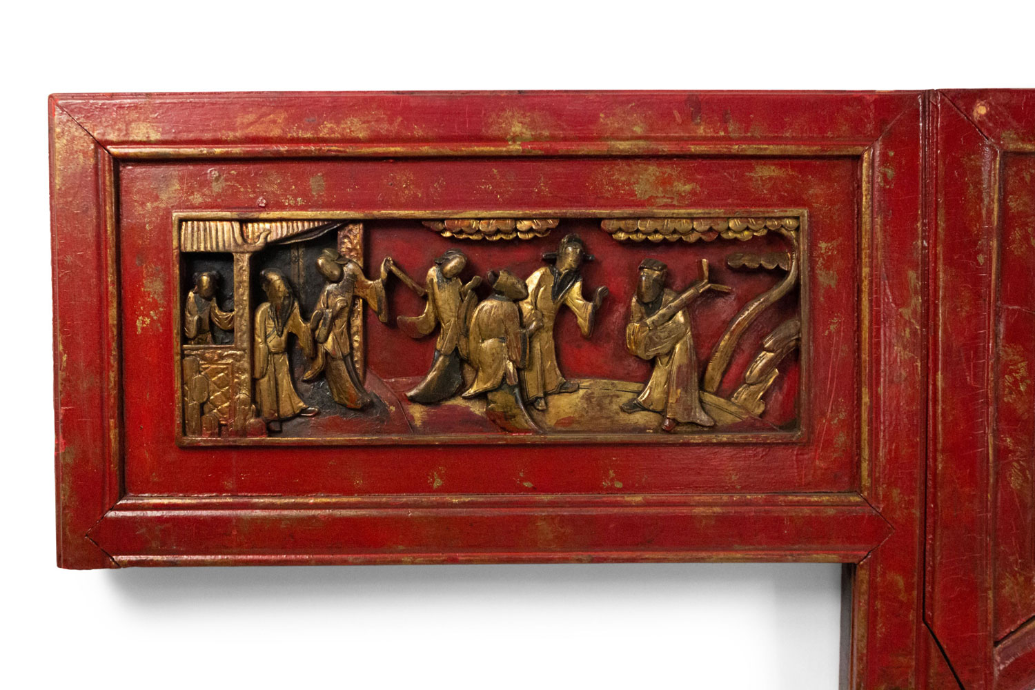 Asian Chinese style (19th Century) red lacquer and gilt trimmed wall carving with filigree & carved panels with scenes with figures.