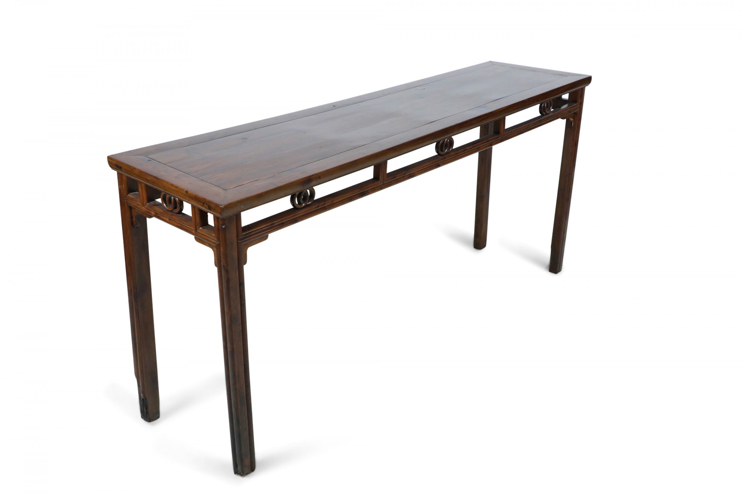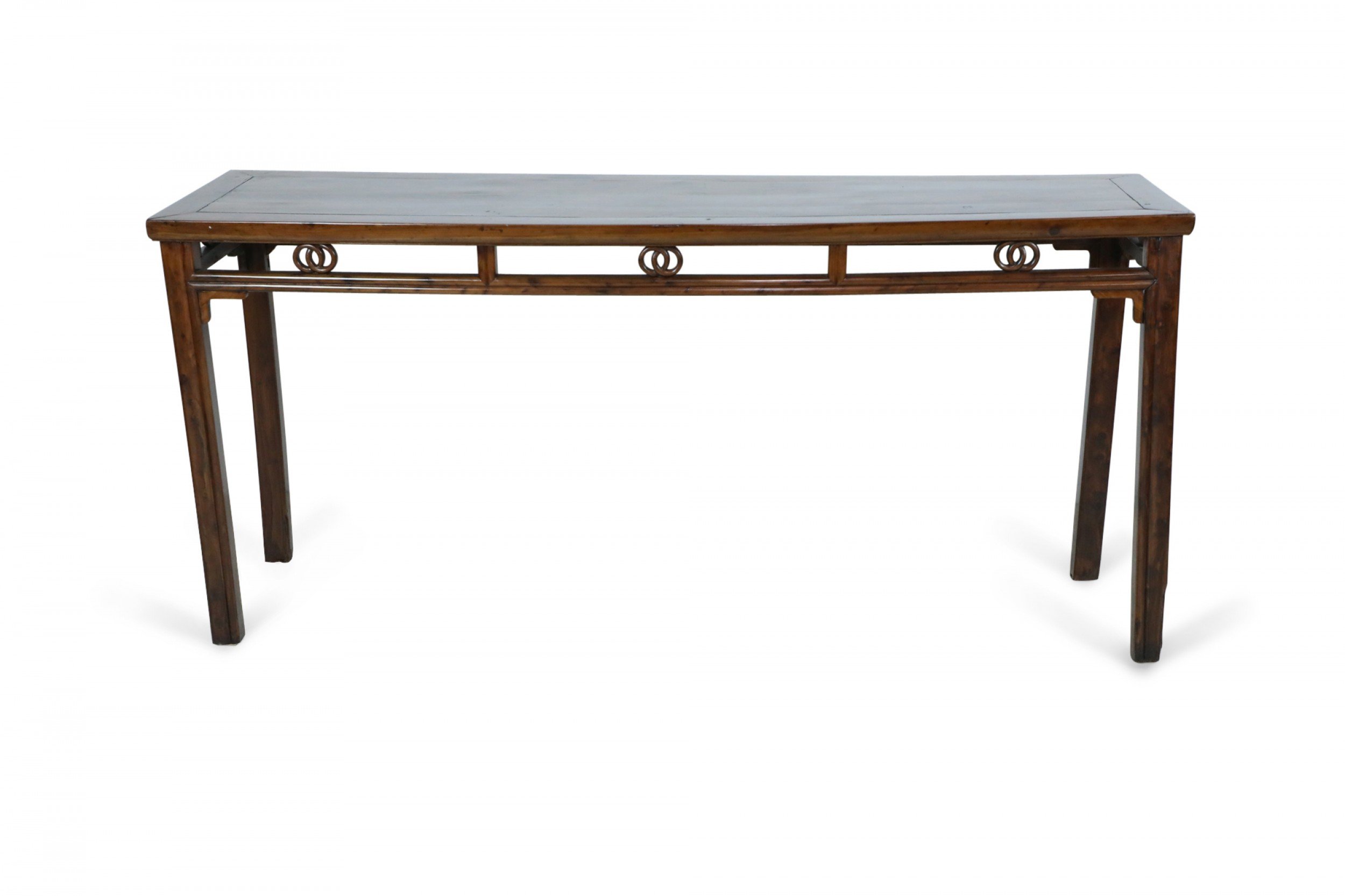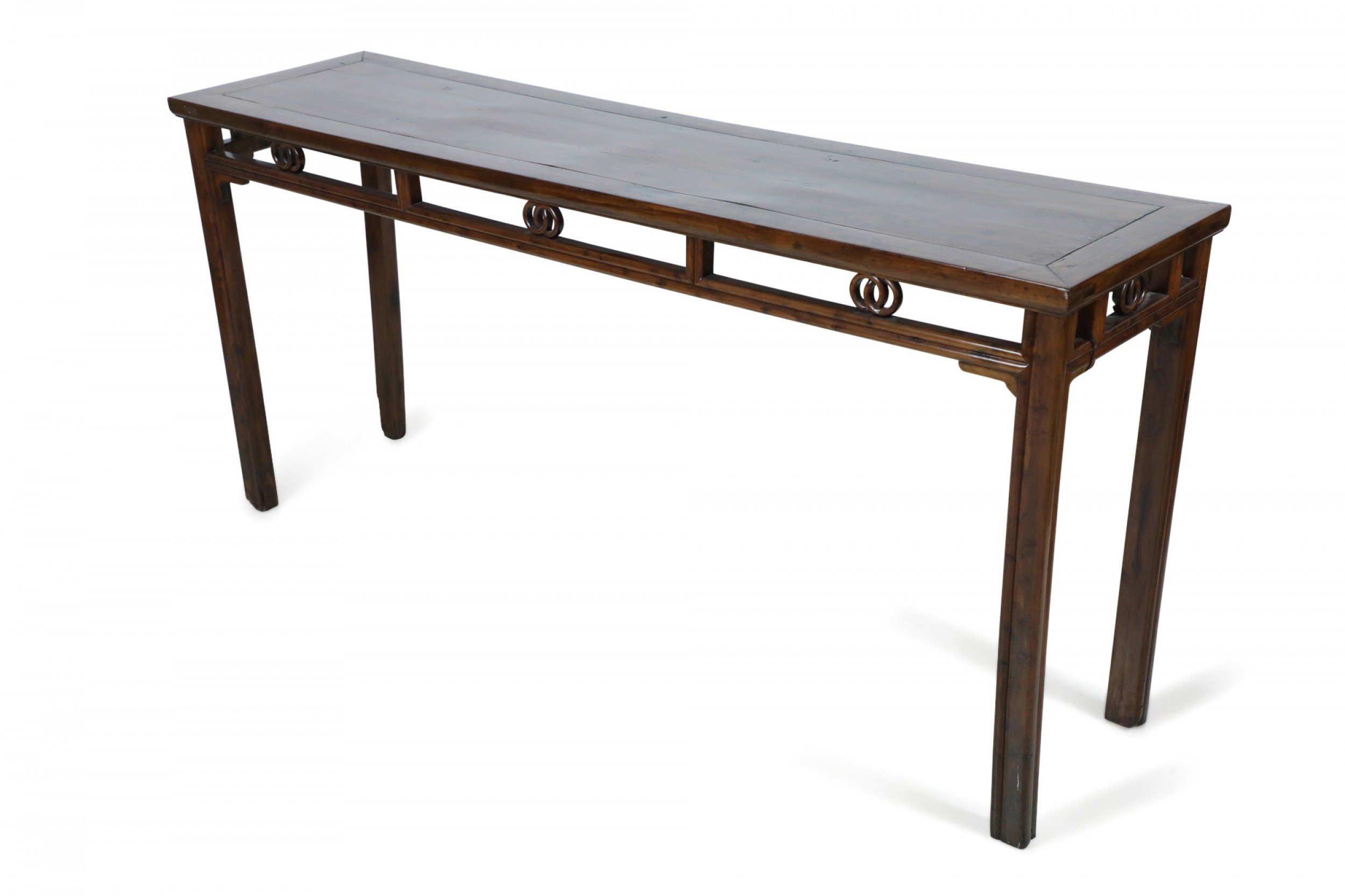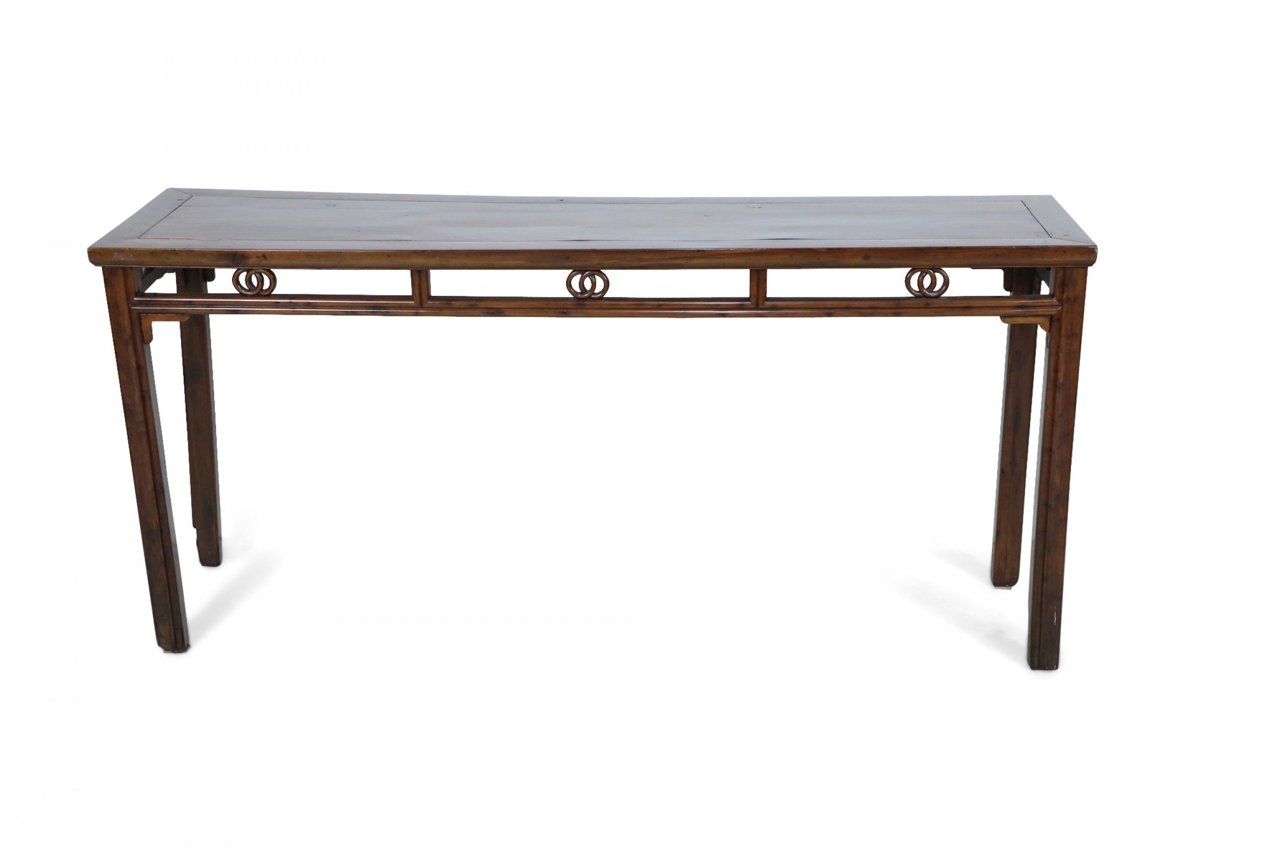 Chinese (19th Century) hardwood narrow rectangular console table with open apron featuring interlocking circular design.