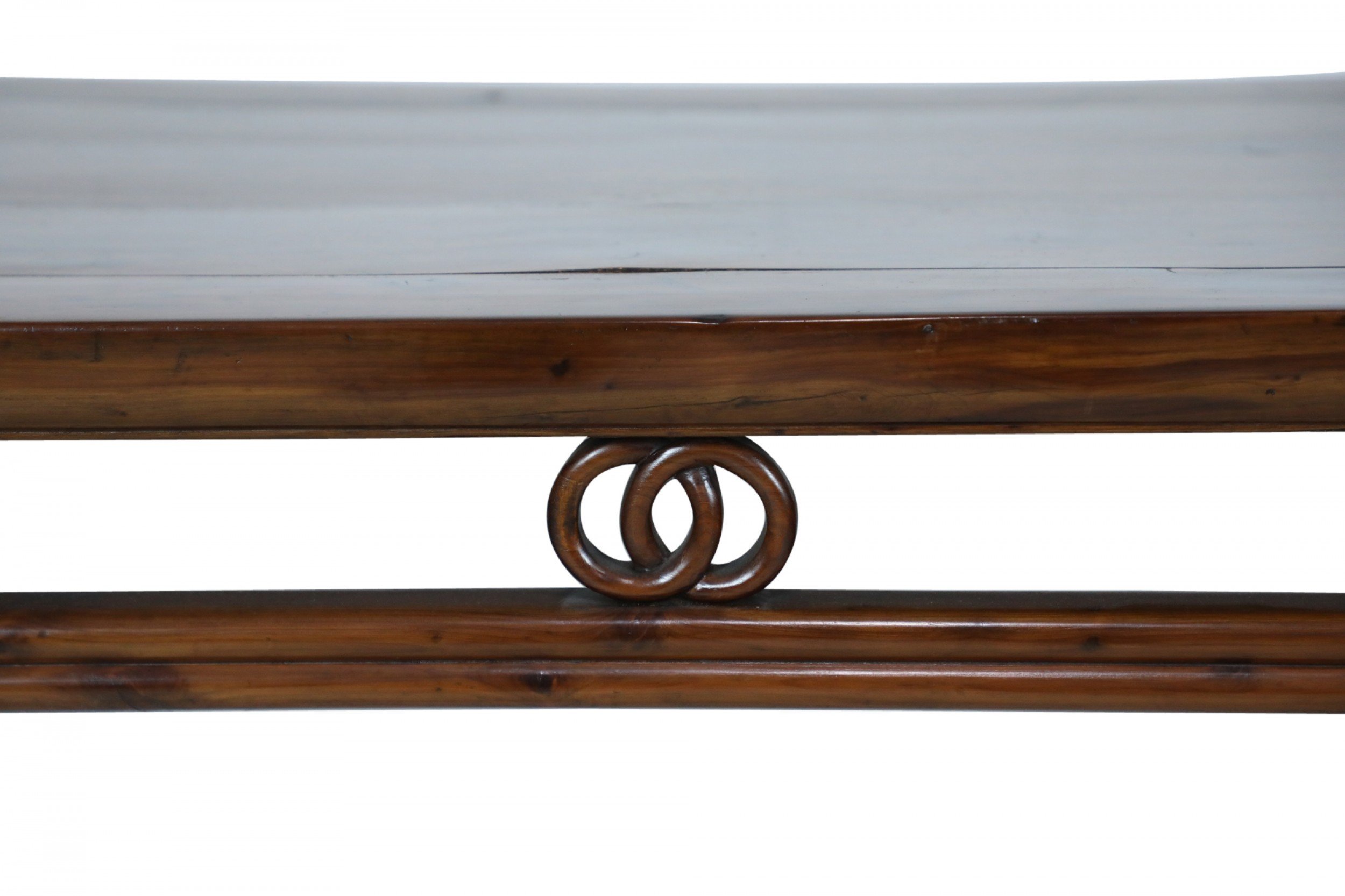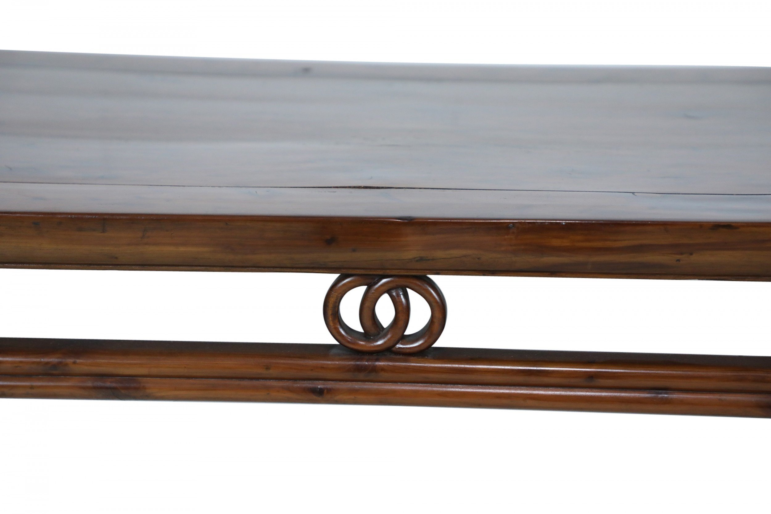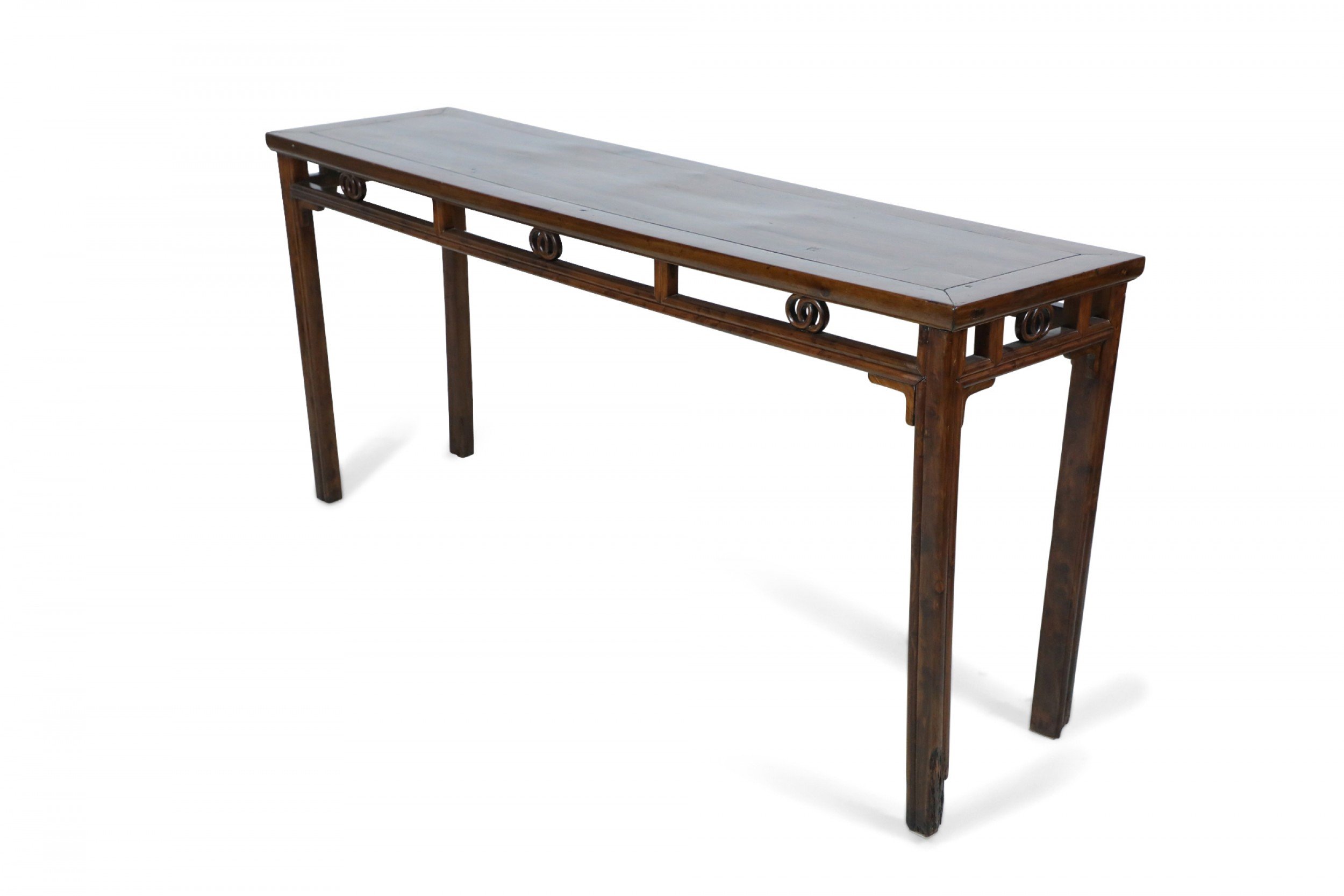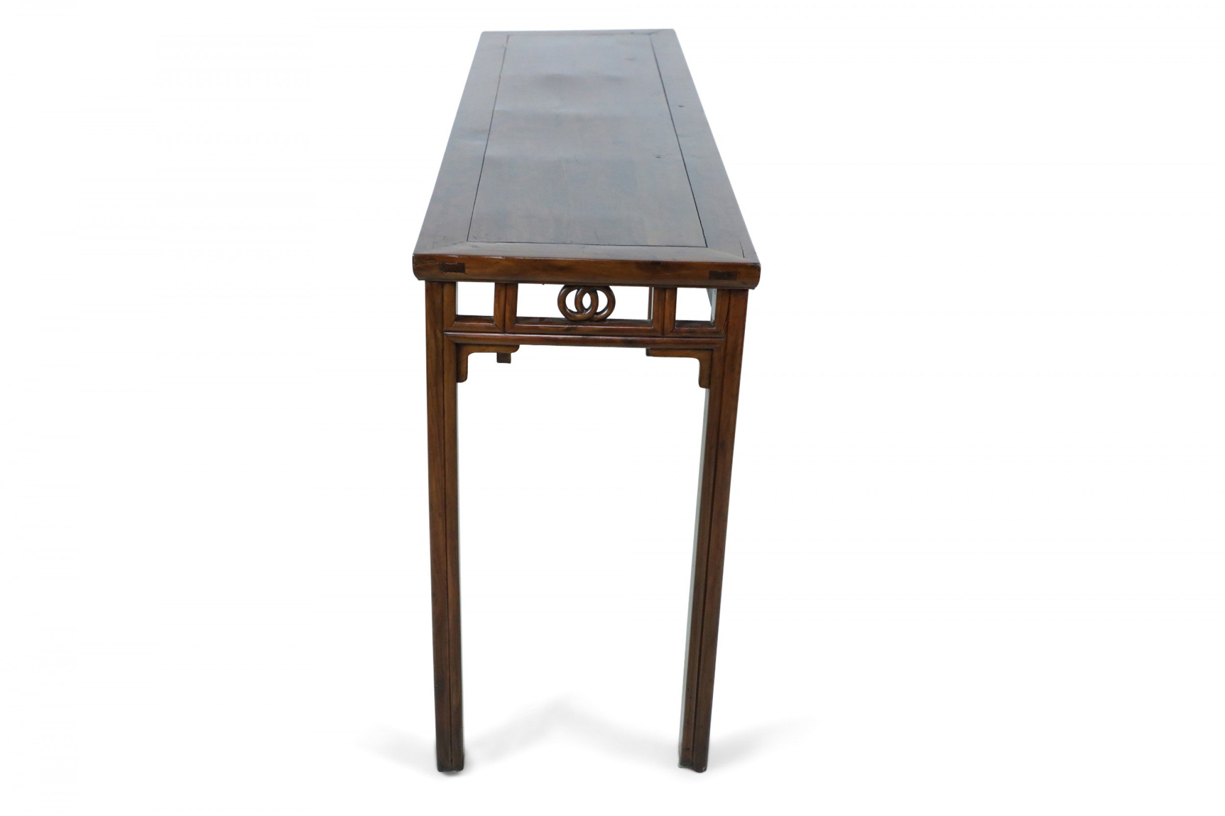Chinese (19th Century) hardwood narrow rectangular console table with open apron featuring interlocking circular design.