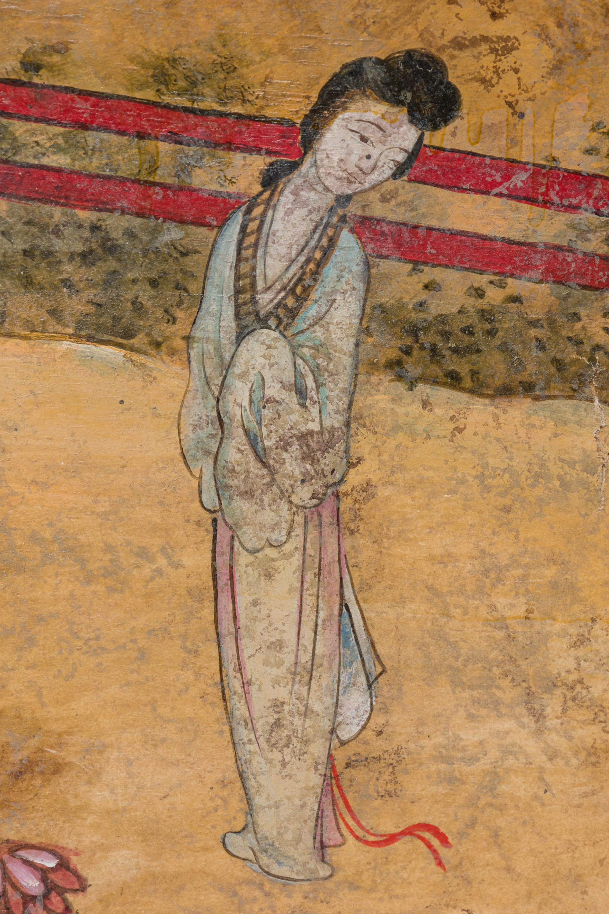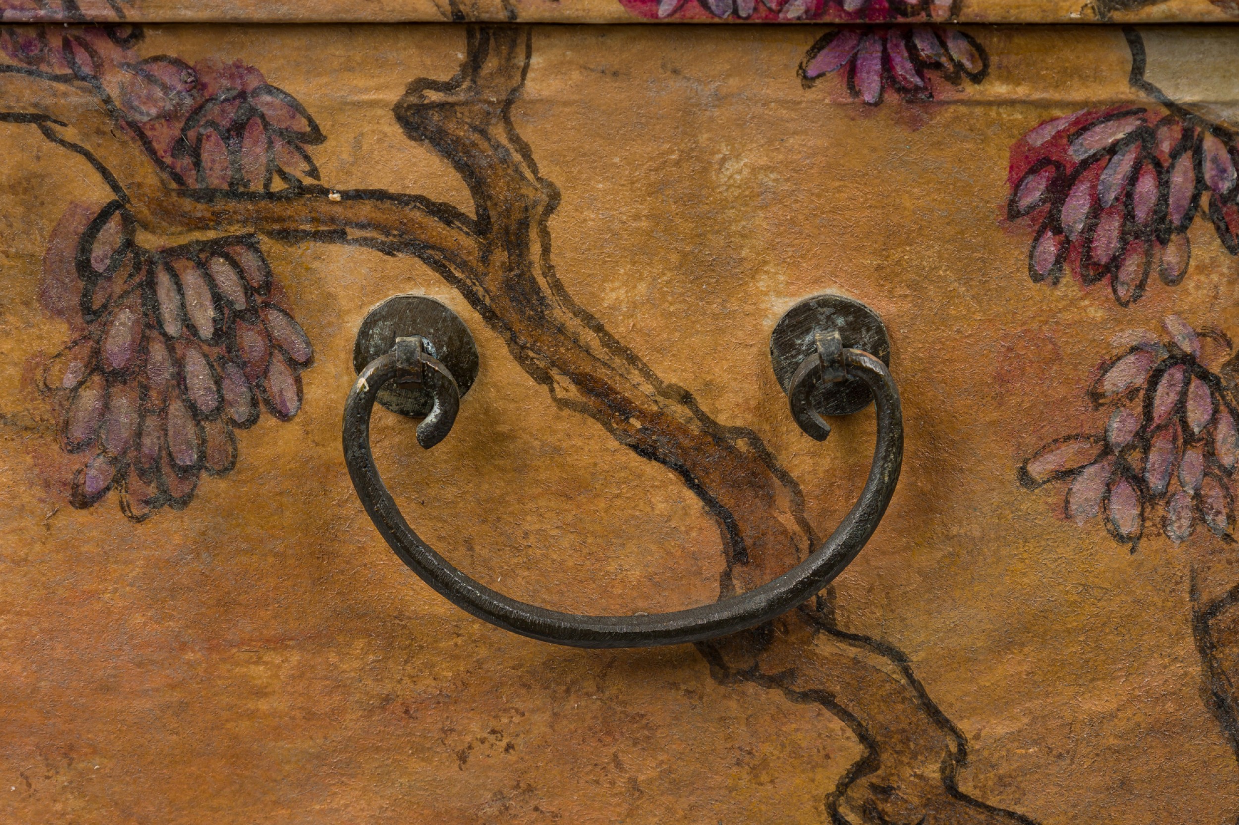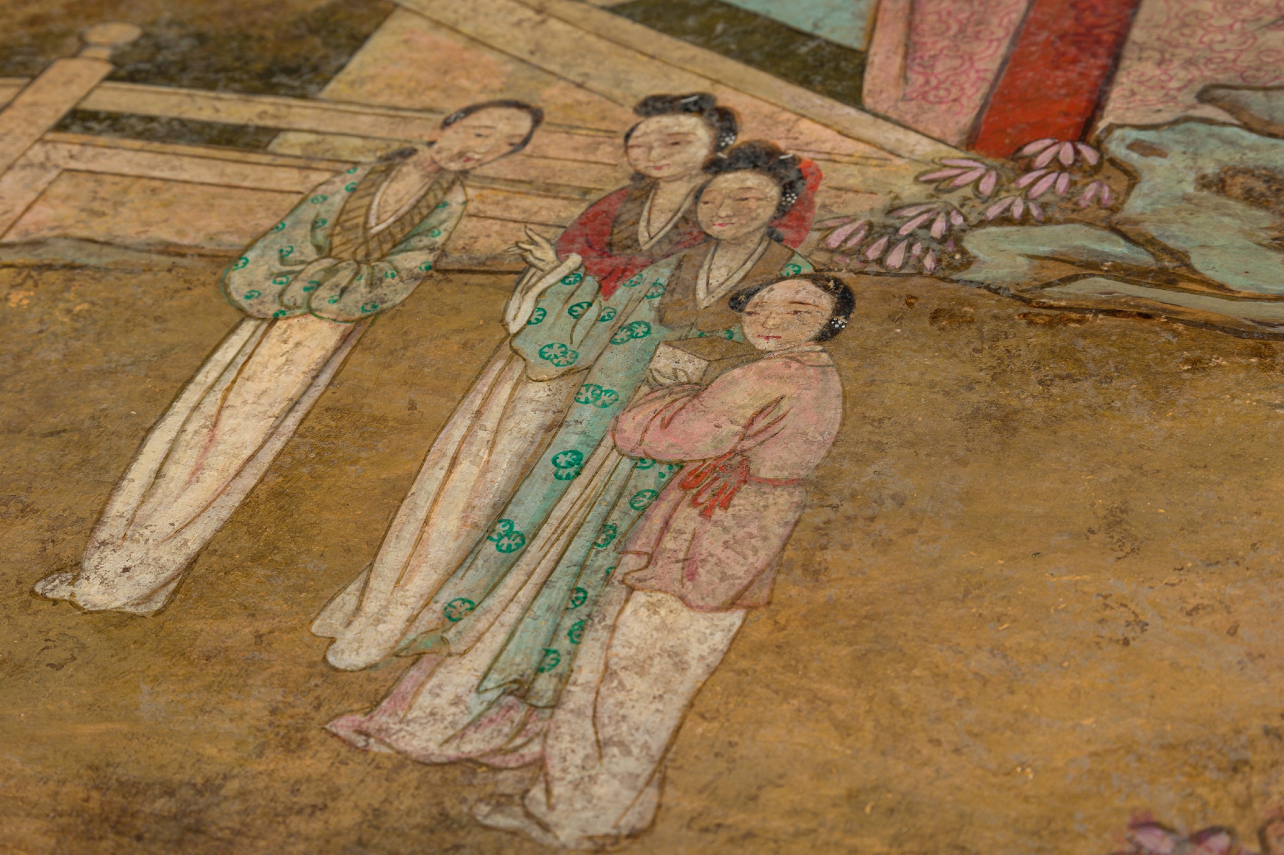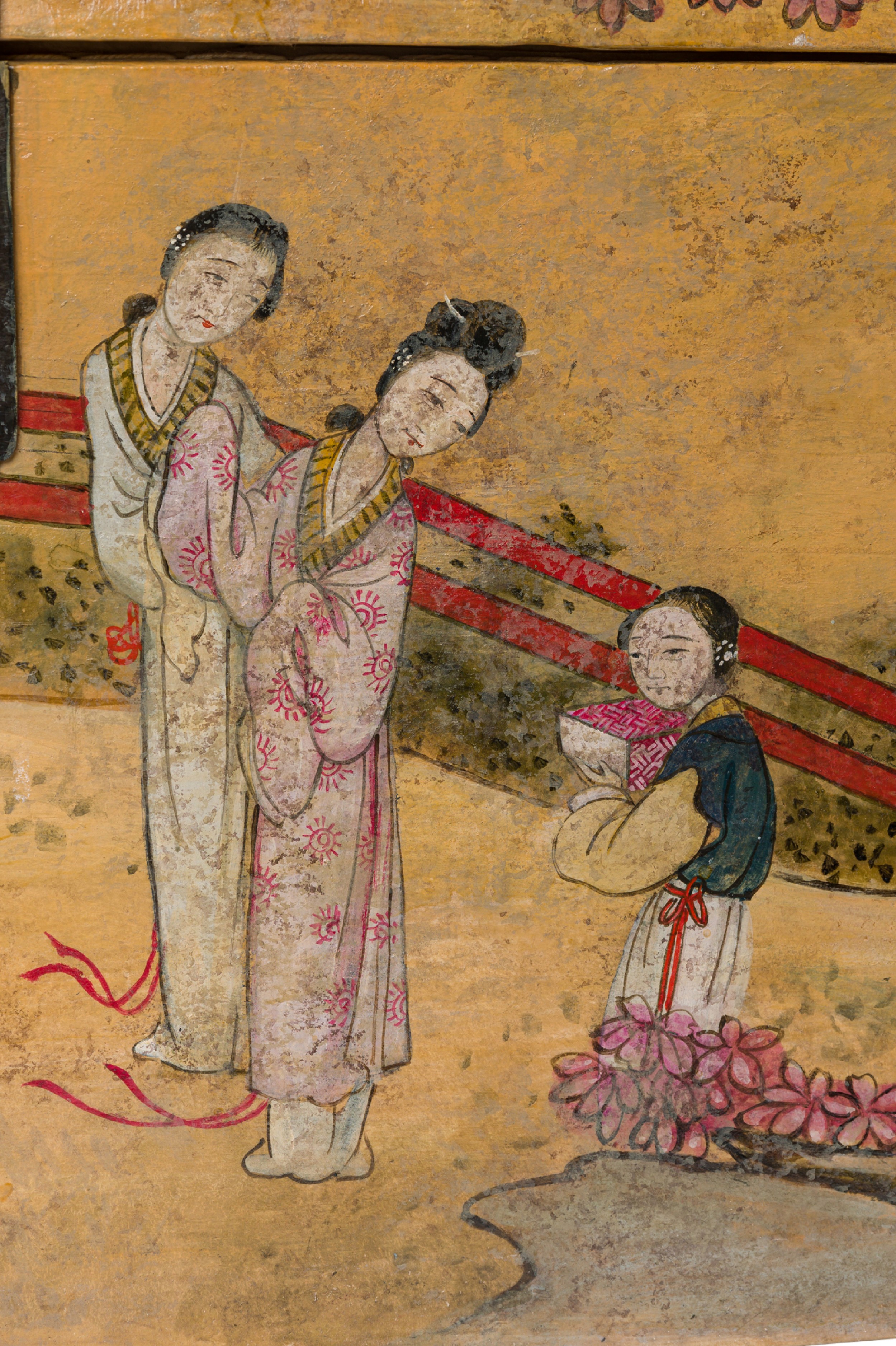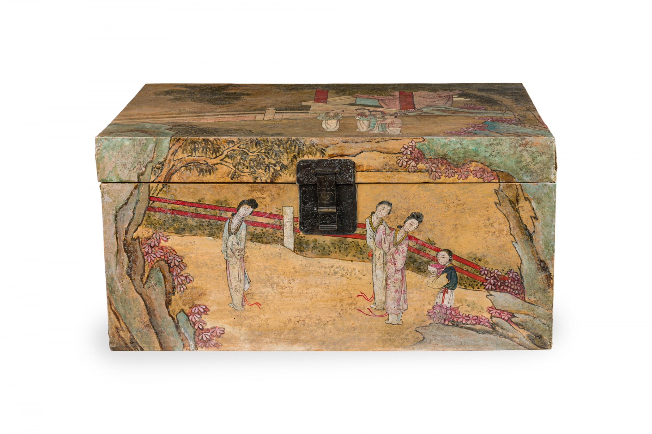 Chinese Mid-Century rectangular hinged chest with black metal latch and two side ring handles, lacquered and hand painted featuring three women and one girl in two outdoor courtyard scenes with lush foliage in the background (Prov: Chinese Porcelain Co)