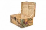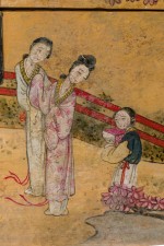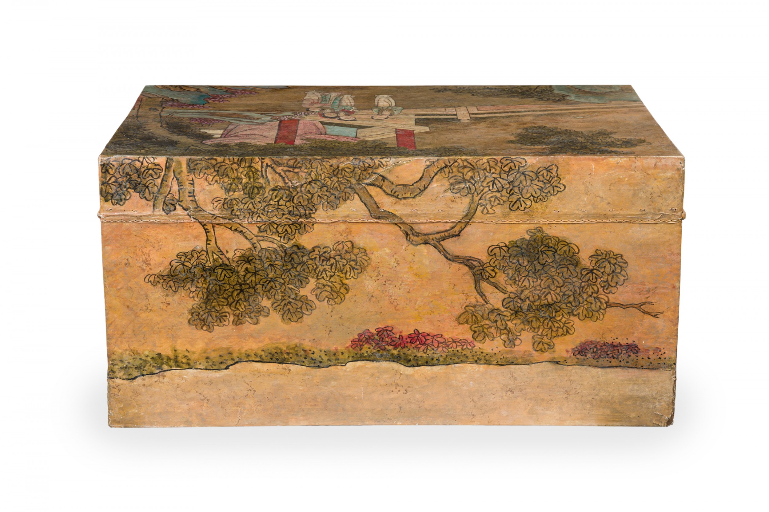 Chinese Mid-Century rectangular hinged chest with black metal latch and two side ring handles, lacquered and hand painted featuring three women and one girl in two outdoor courtyard scenes with lush foliage in the background (Prov: Chinese Porcelain Co).