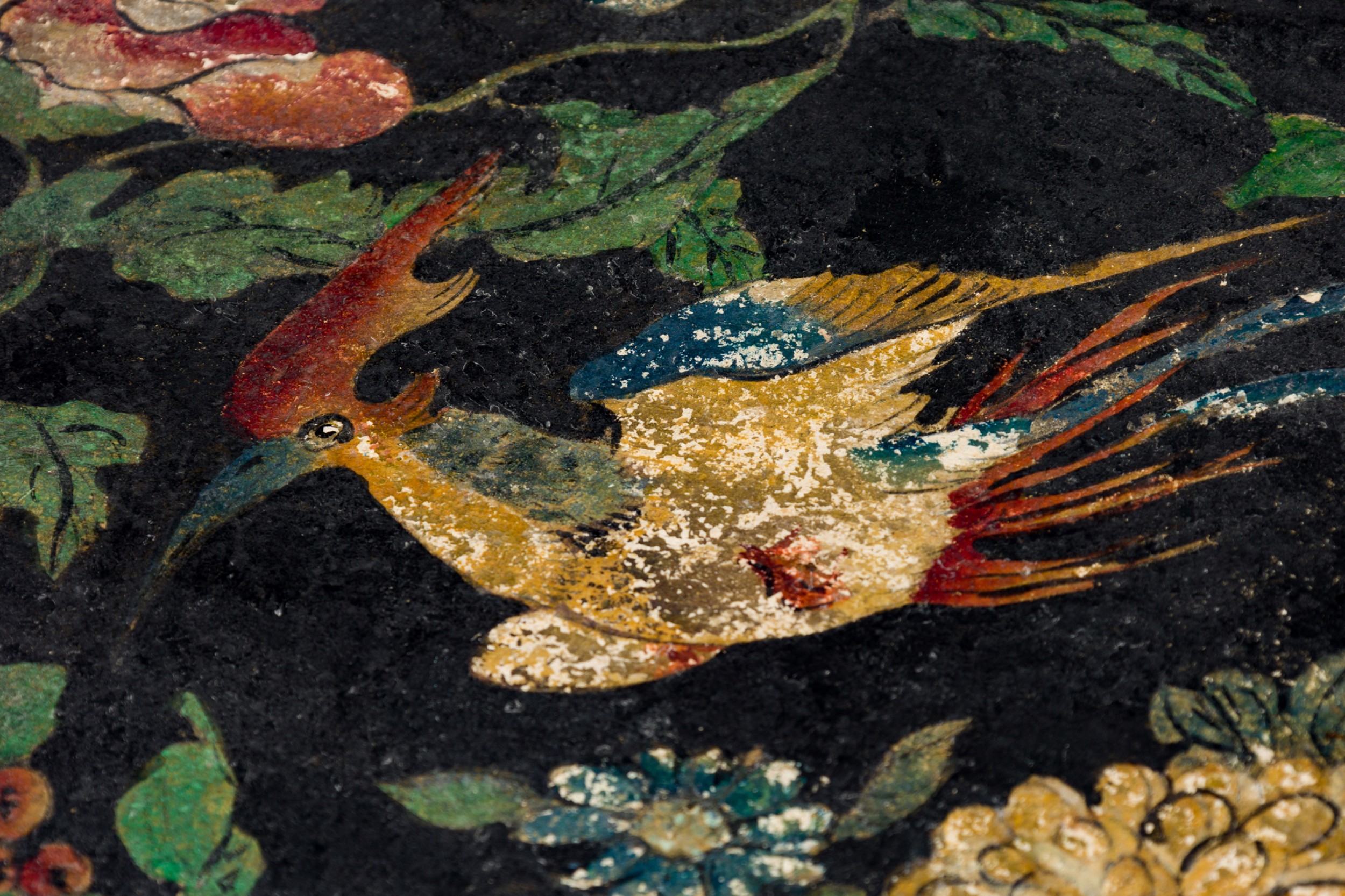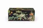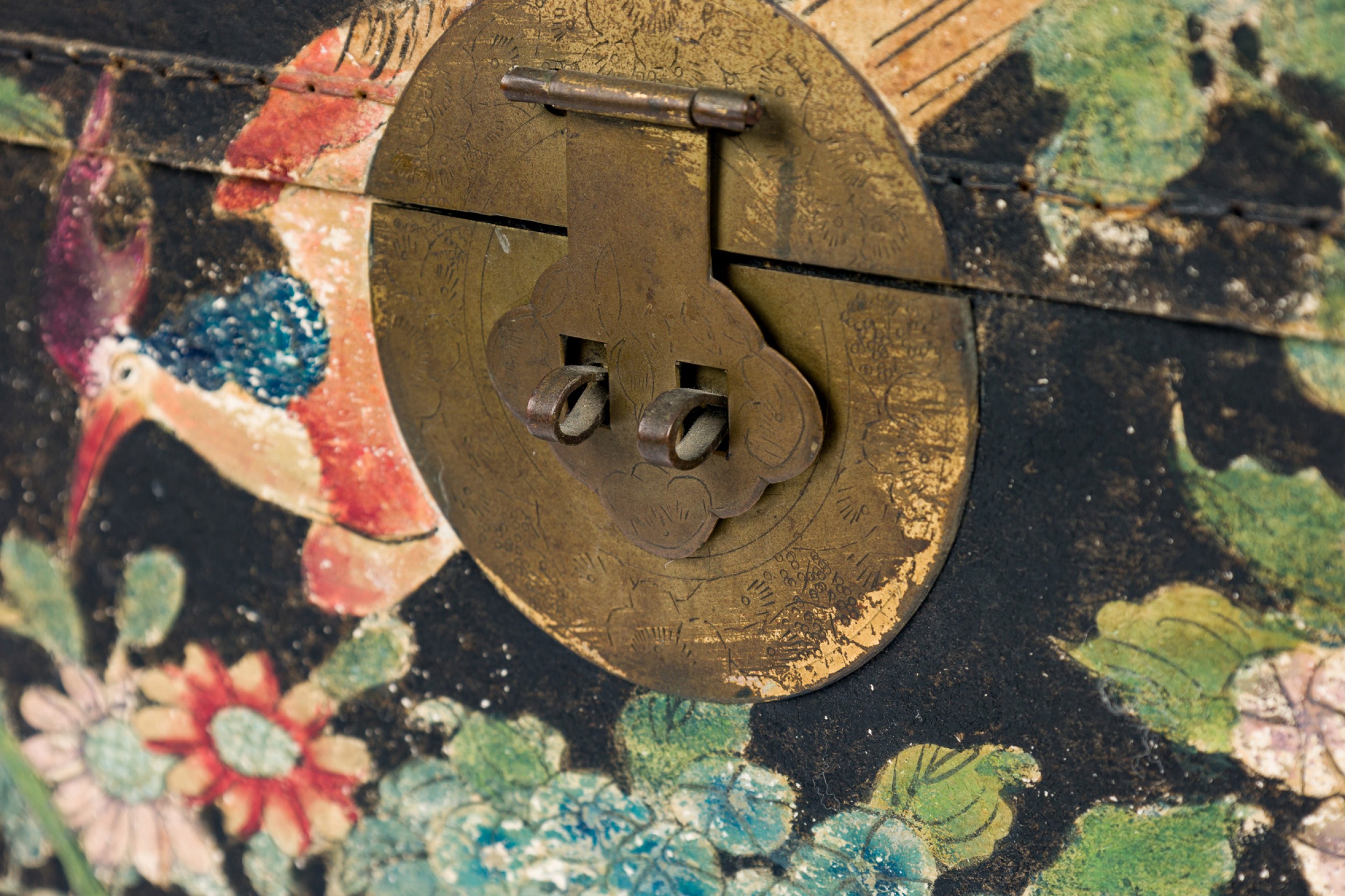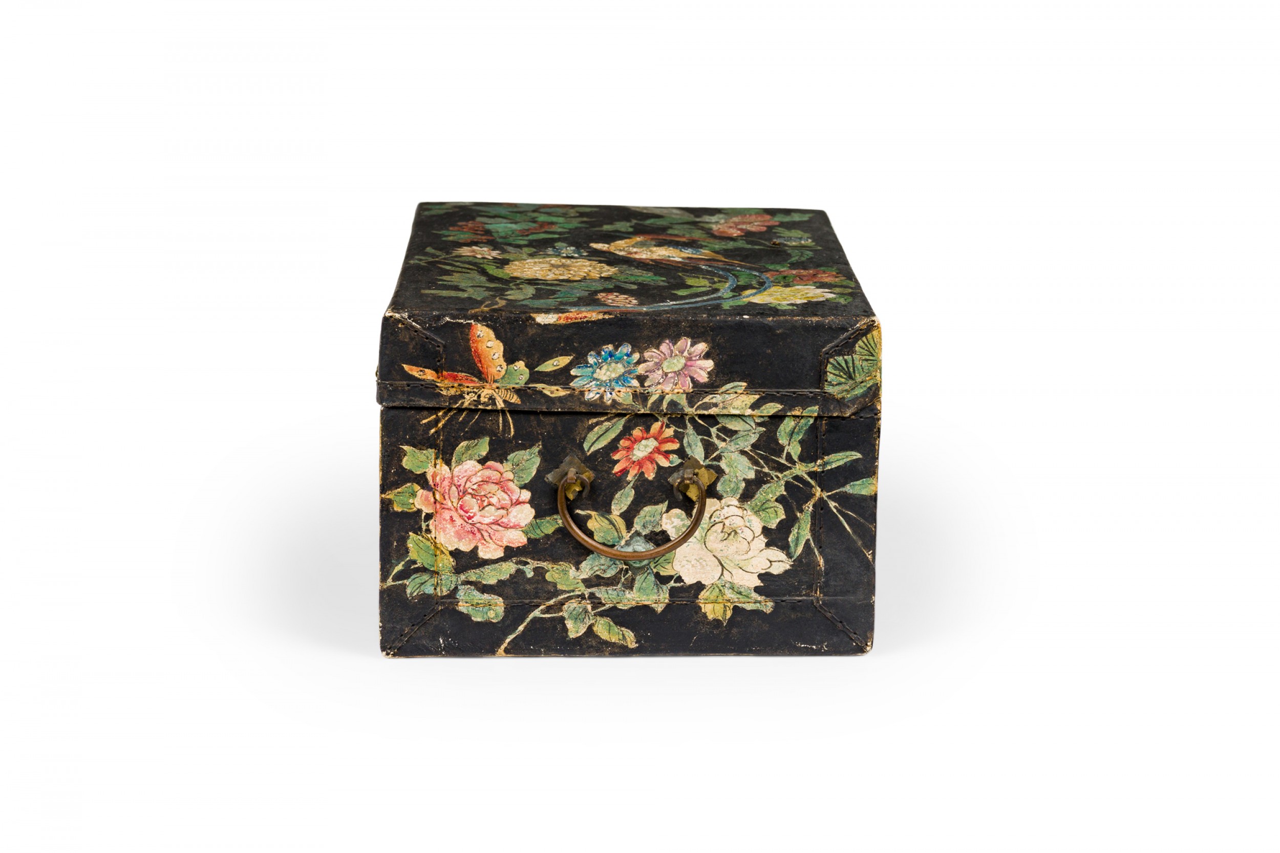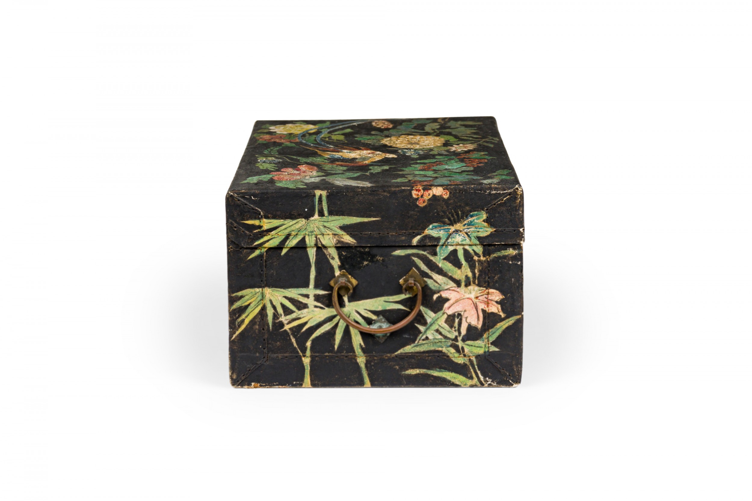 Chinese Mid-Century small rectangular hinged chest with metal latch and two side ring handles, hand painted featuring two exotic birds (depicted on the top and front), pine, berries, fungi and various flora over a network of leaves on a black ground. Includes a lock, key and stone heart charm. (Prov: Chinese Porcelain Co)