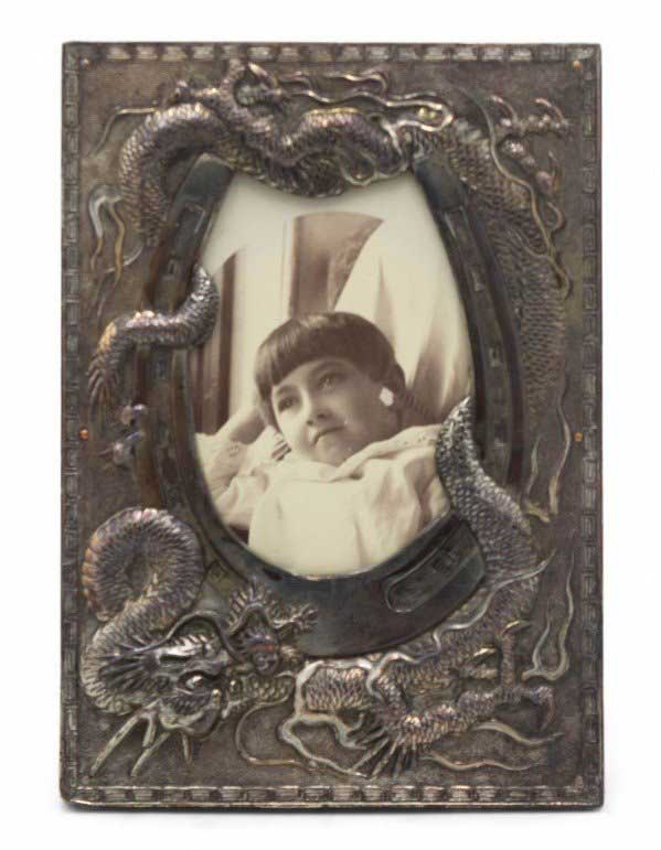 Asian Chinese-style (19/20th Century) pewter double easel picture frame with dragon motif..