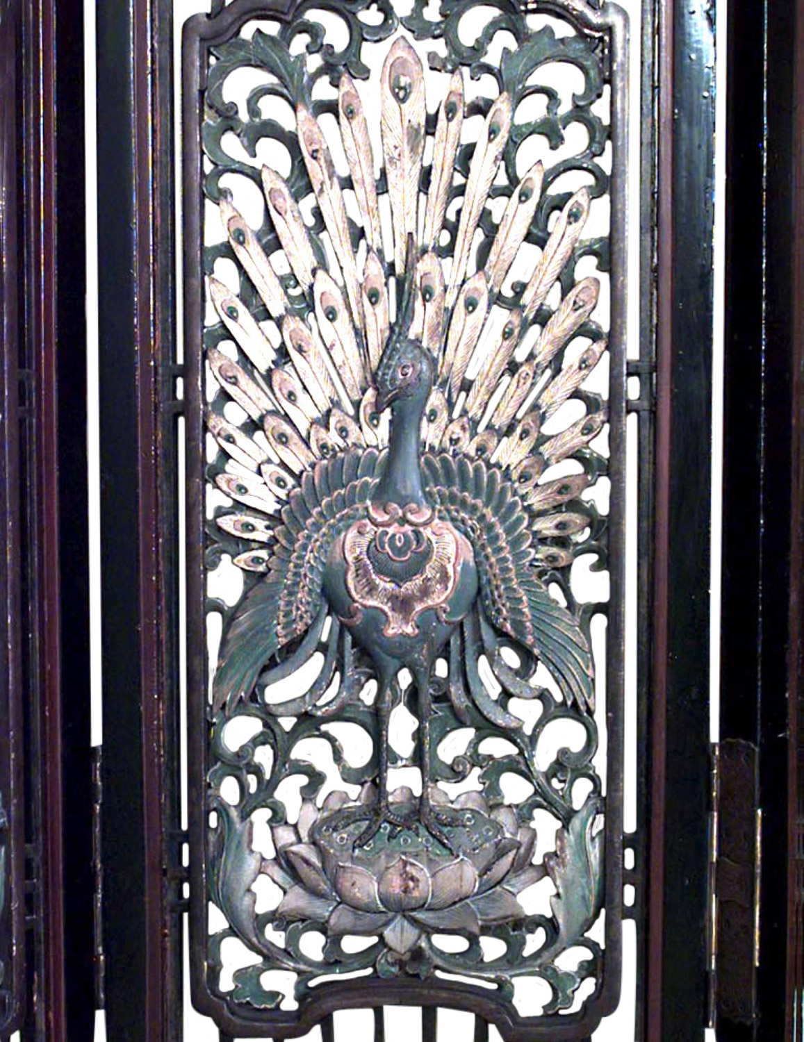 Asian Chinese (19th Century) polychromed 4 fold screen with carved peacock design..
