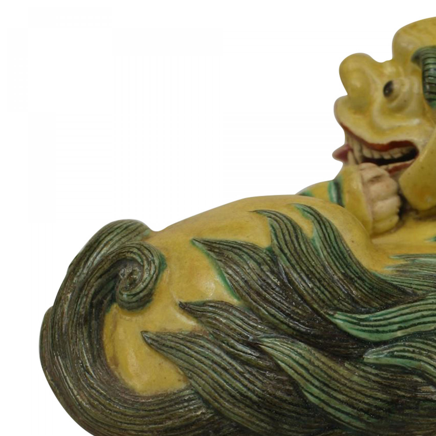 PAIR of Asian Chinese (19/20th Cent) green and yellow small porcelain reclining foo dog figures.