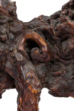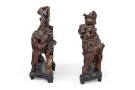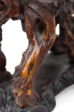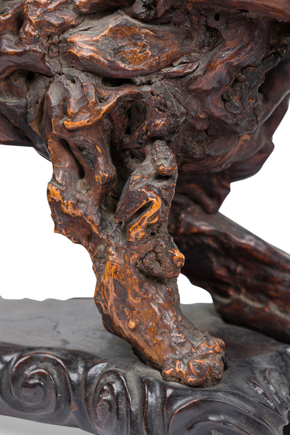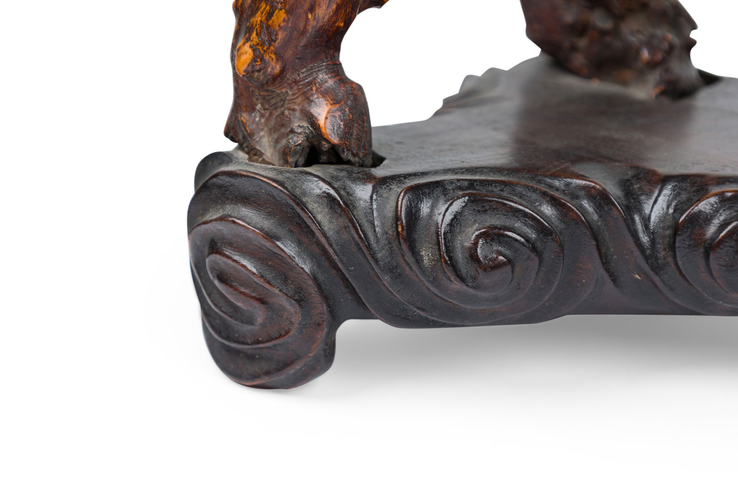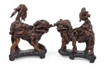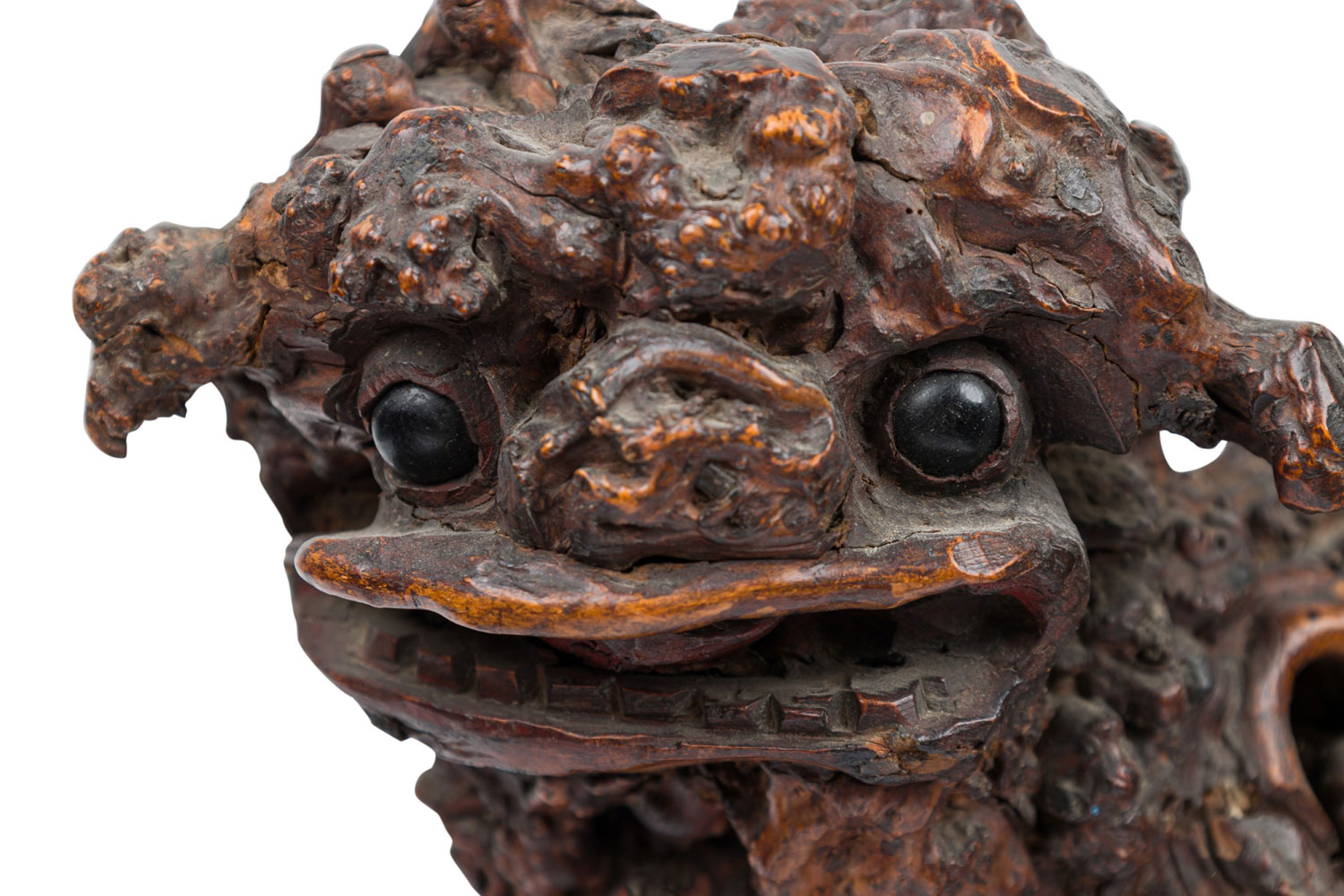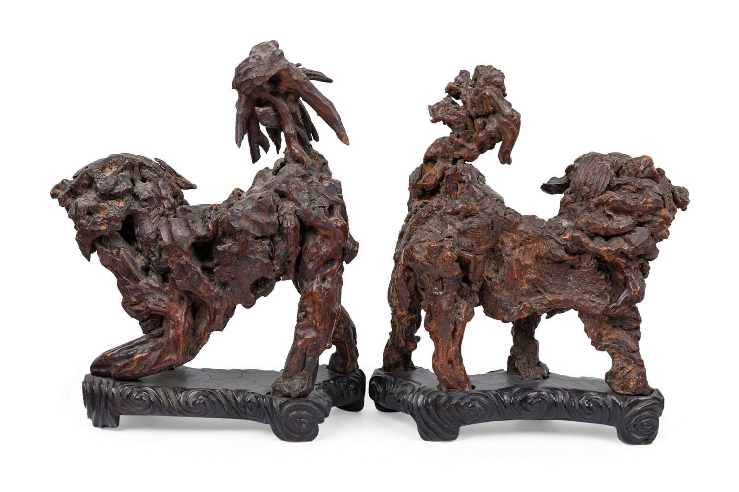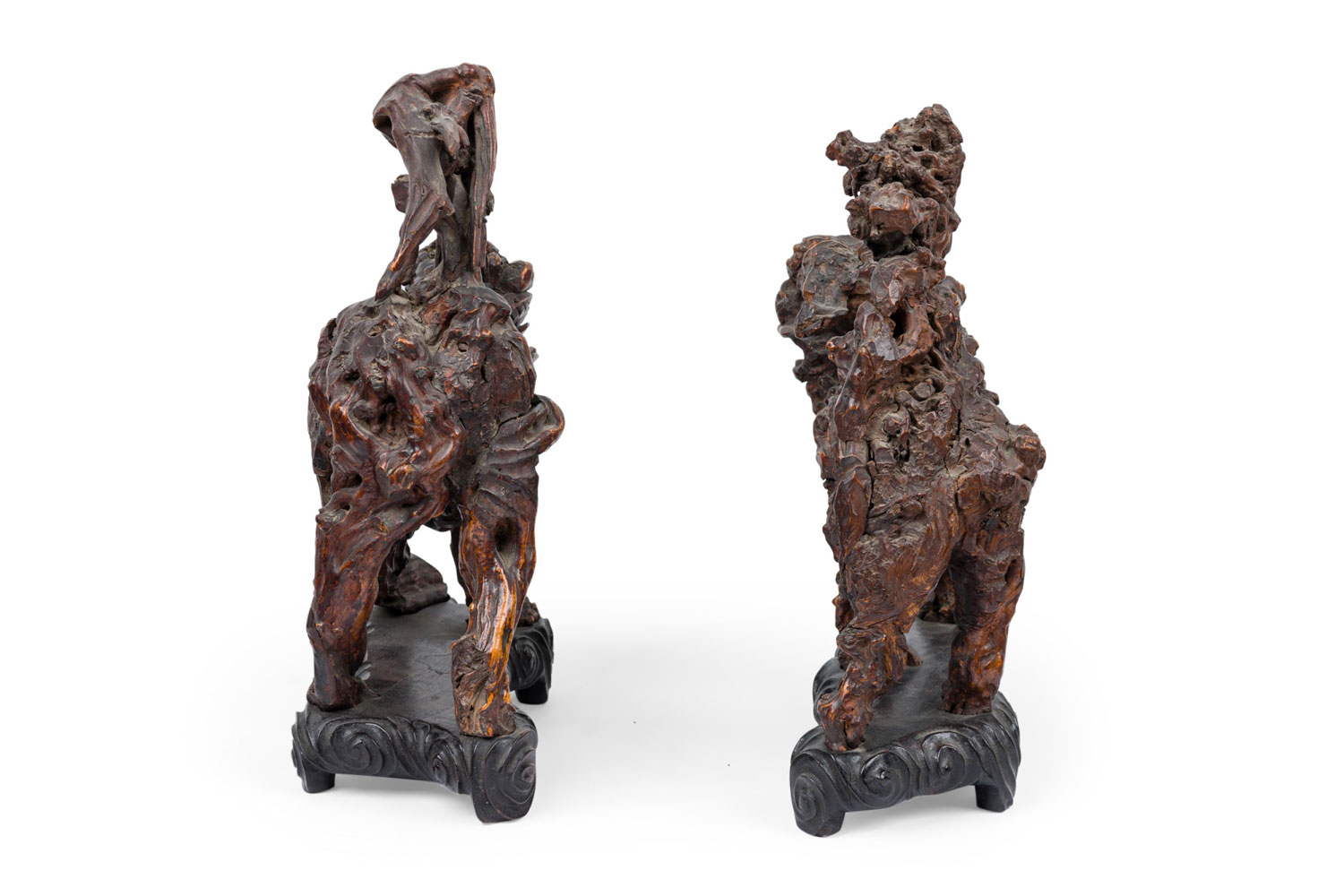 PAIR of Asian Chinese style (19th Cent) root design foo dog figures on shaped teak bases
