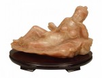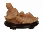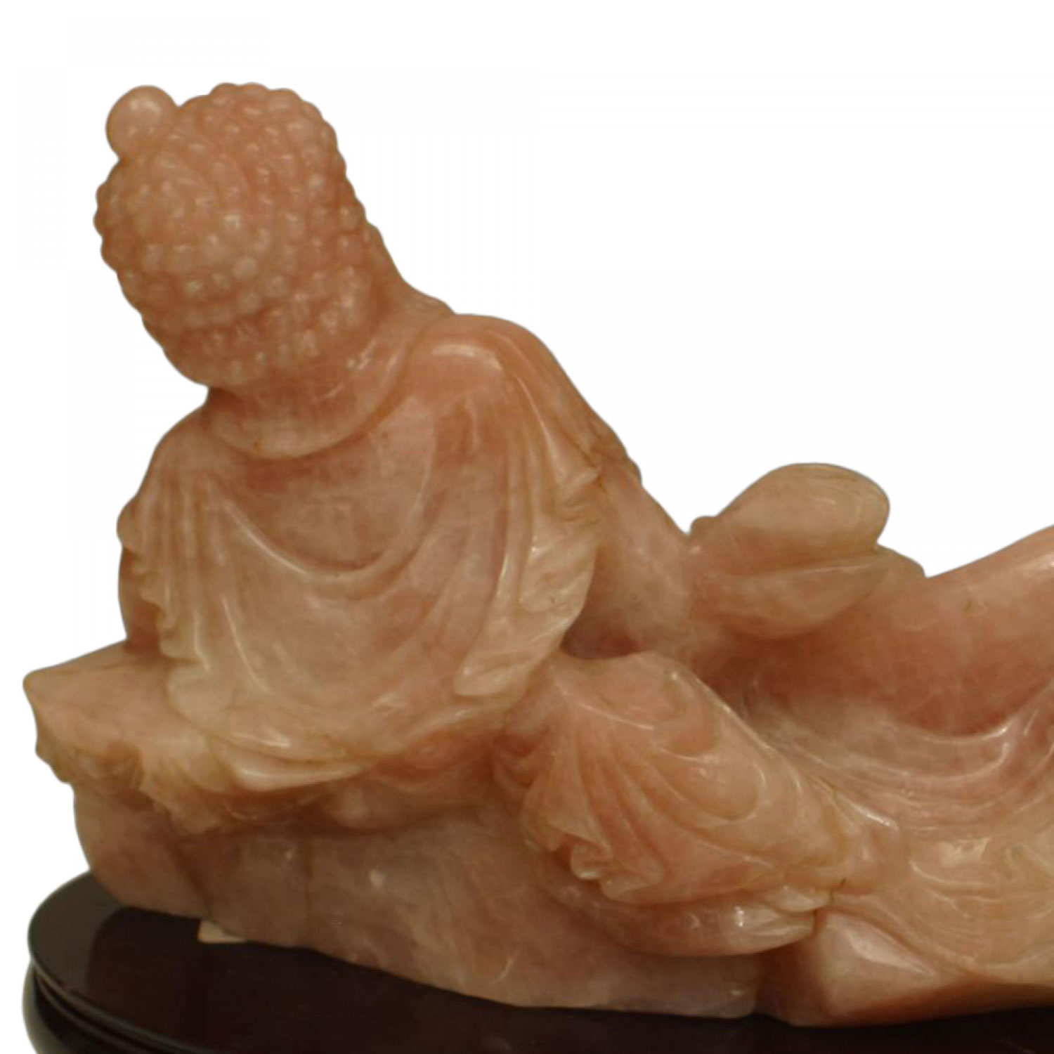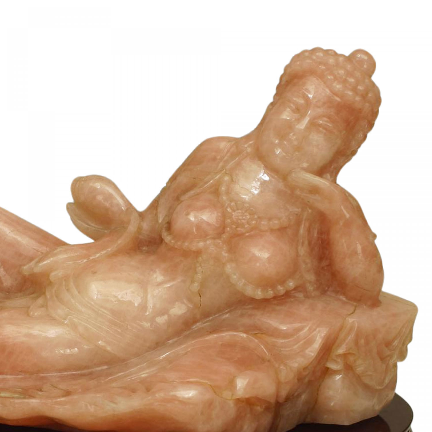 Asian Chinese rose quartz carved reclining lady on an oval wood base (20th Cent)