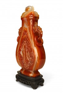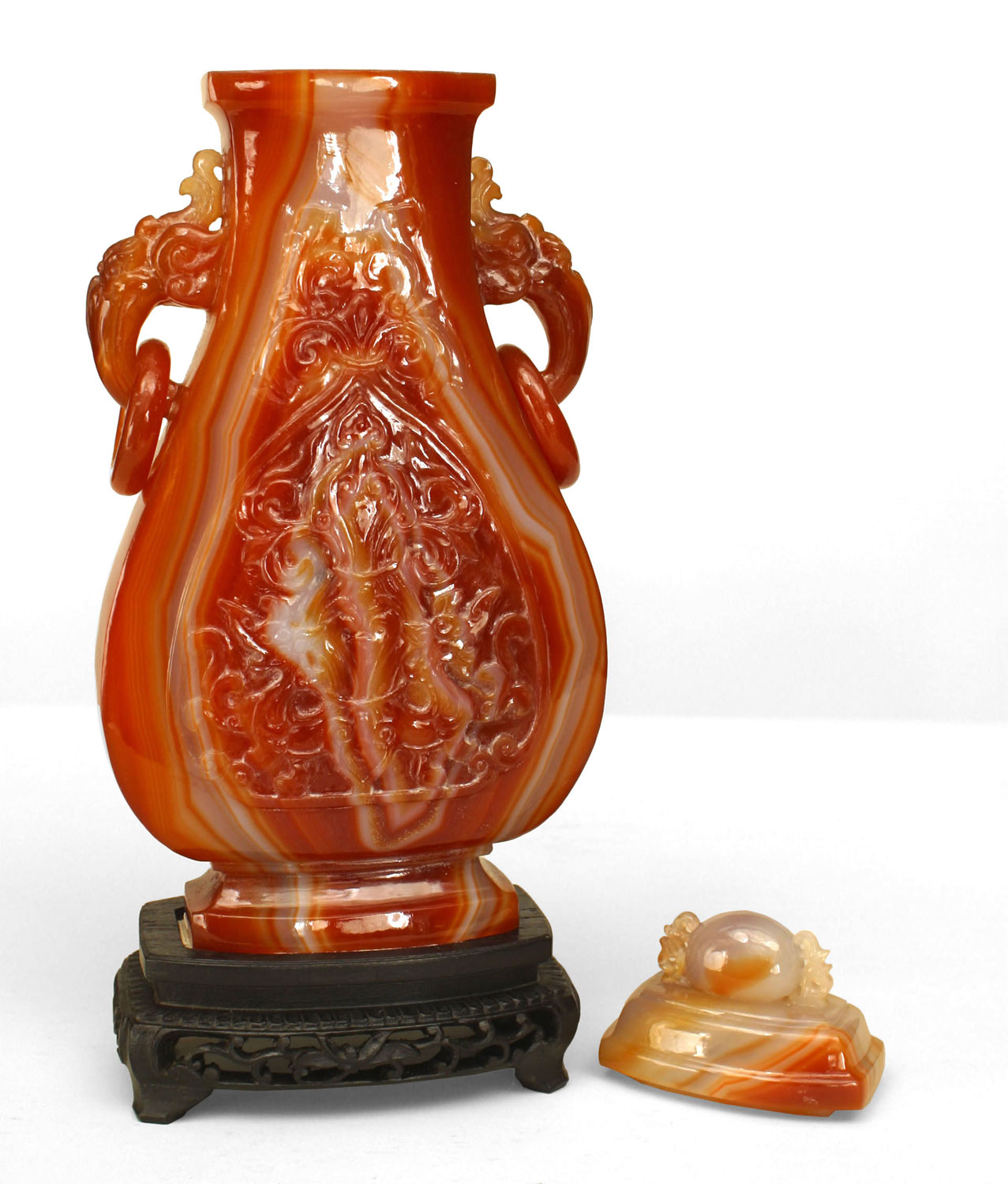 Asian Chinese rust agate tapered urn with carved elephant handles having rings and scroll & floral carving in relief with a finial top with filigree sides. (modern base 1½" high)