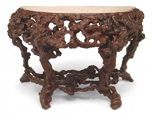 PAIR of Asian Chinese Rustic-style (18th Century) root console tables with shaped top above a pierced frieze on similar supports joined by a stretcher (PRICED AS PAIR)