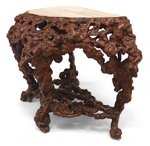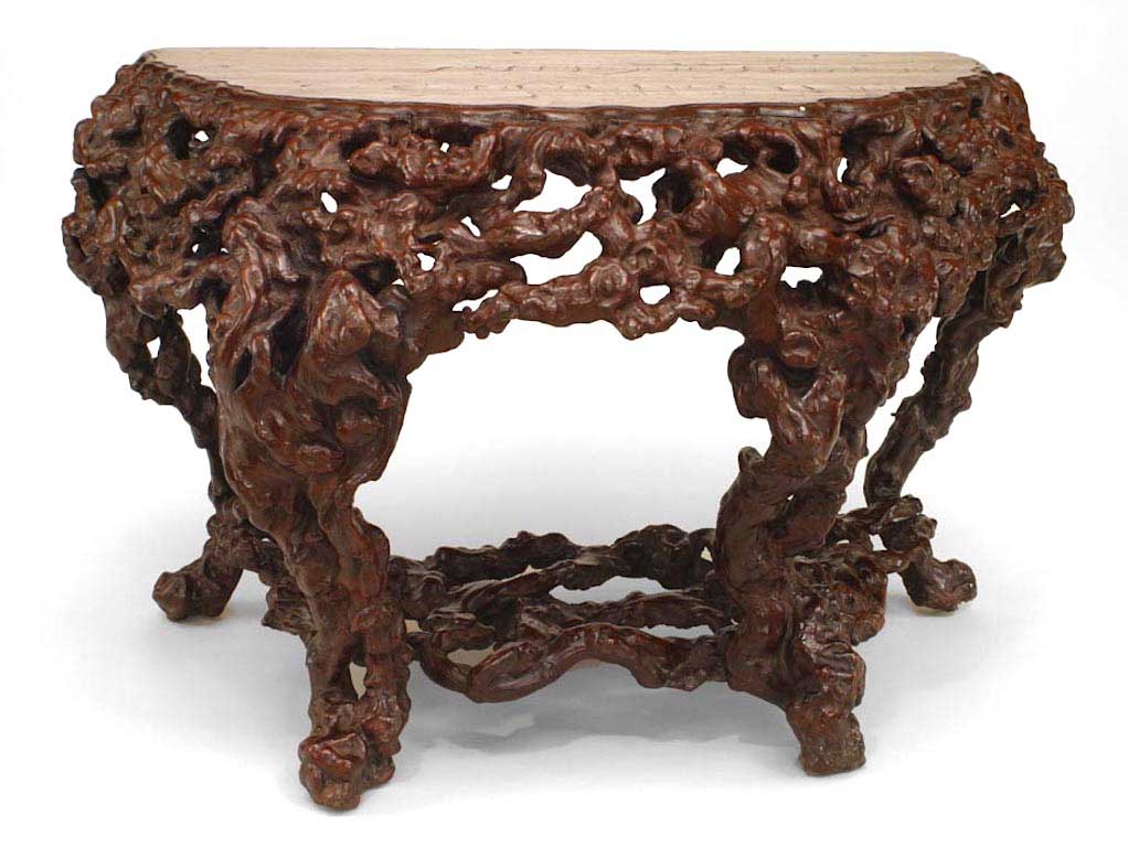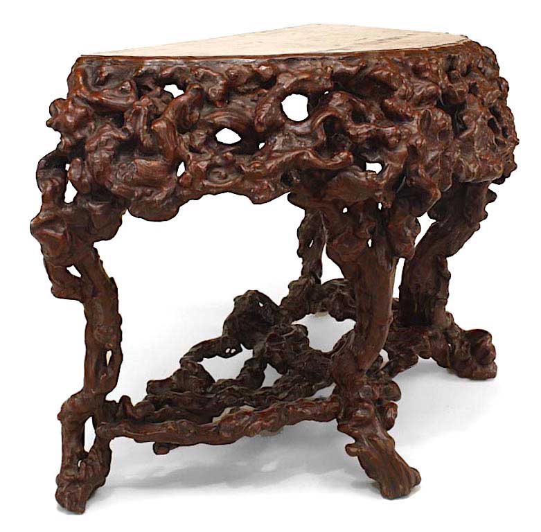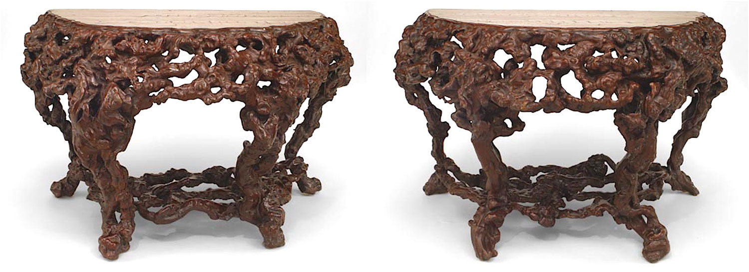 PAIR of Asian Chinese Rustic-style (18th Century) root console tables with shaped top above a pierced frieze on similar supports joined by a stretcher (PRICED AS PAIR).