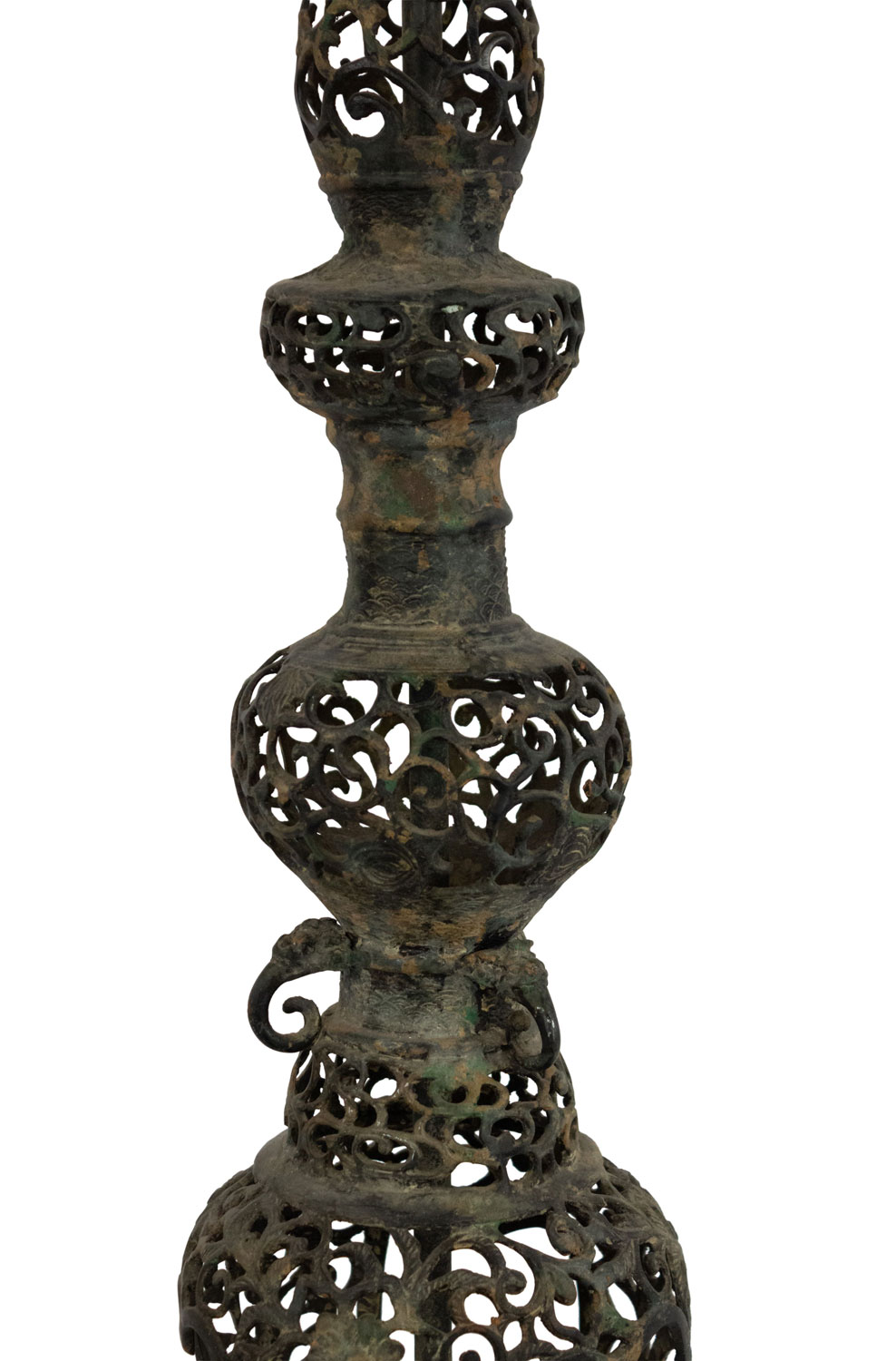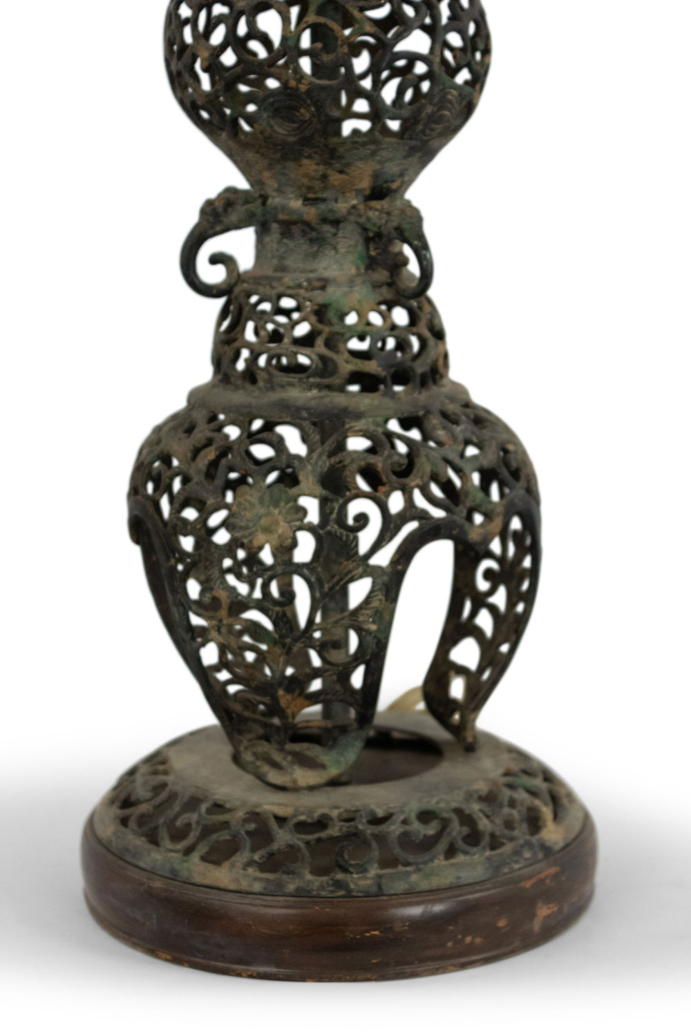 Asian Chinese style (19/20th Century) tall black iron filigree design tiered table lamp on a round base..