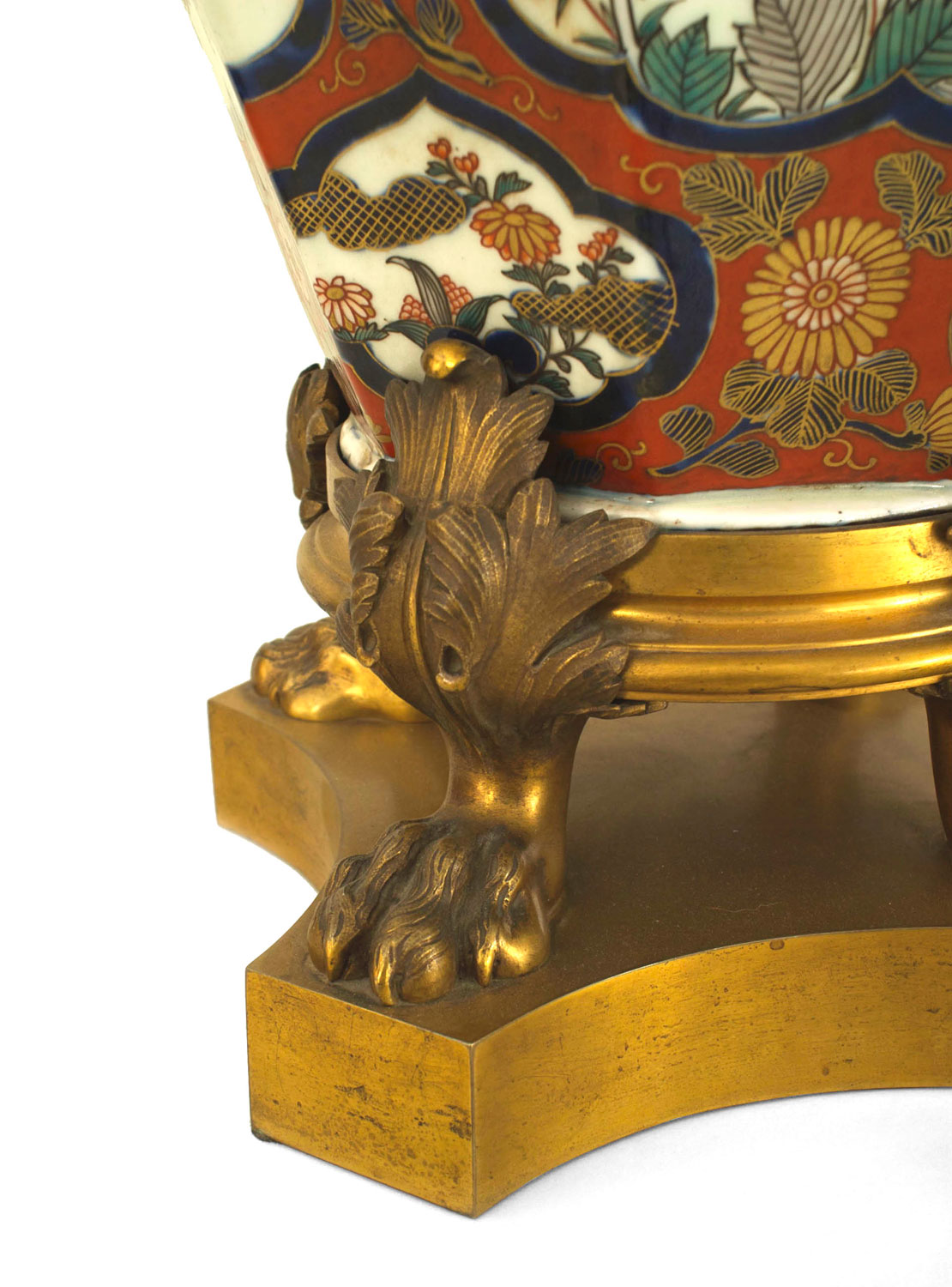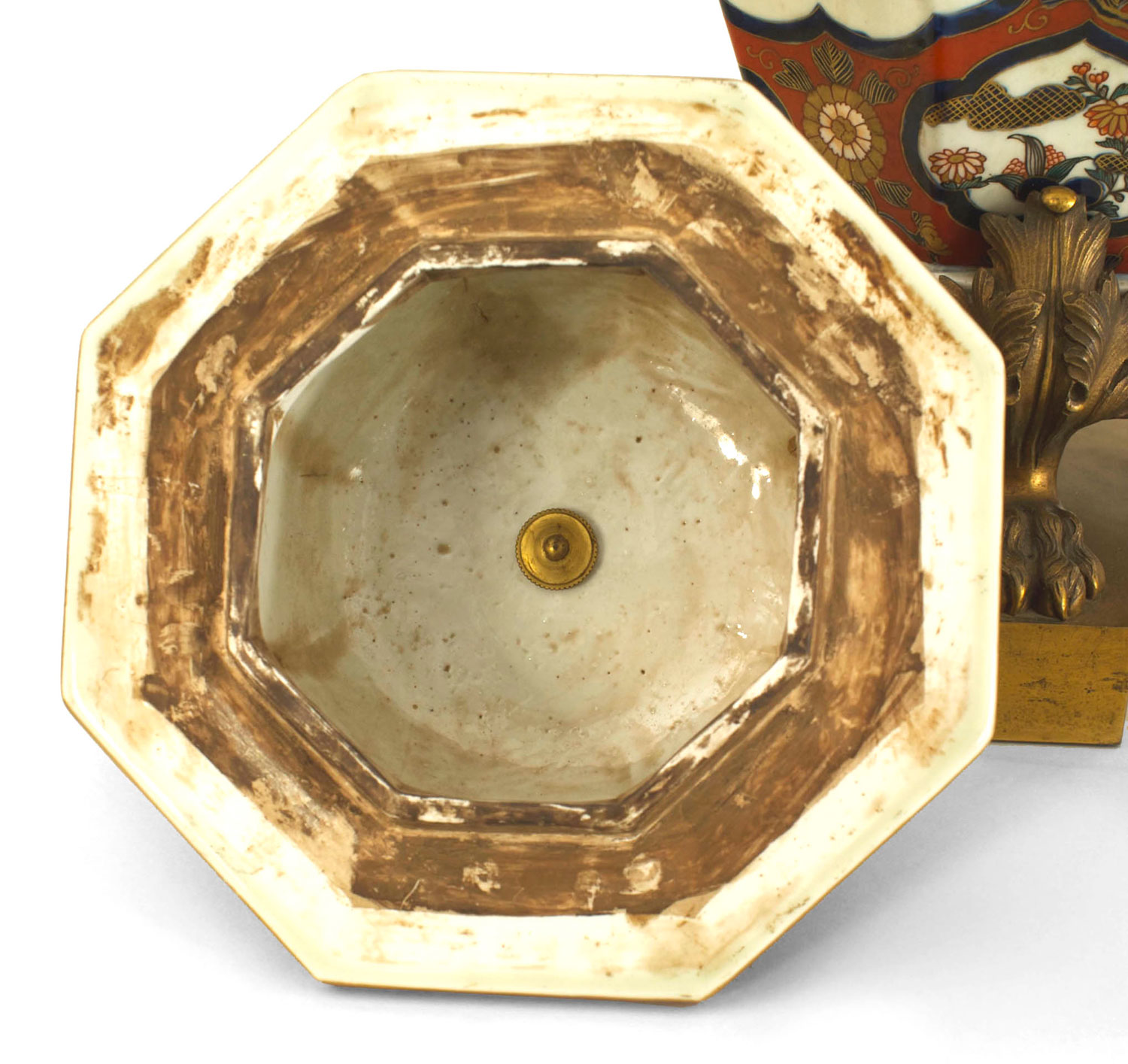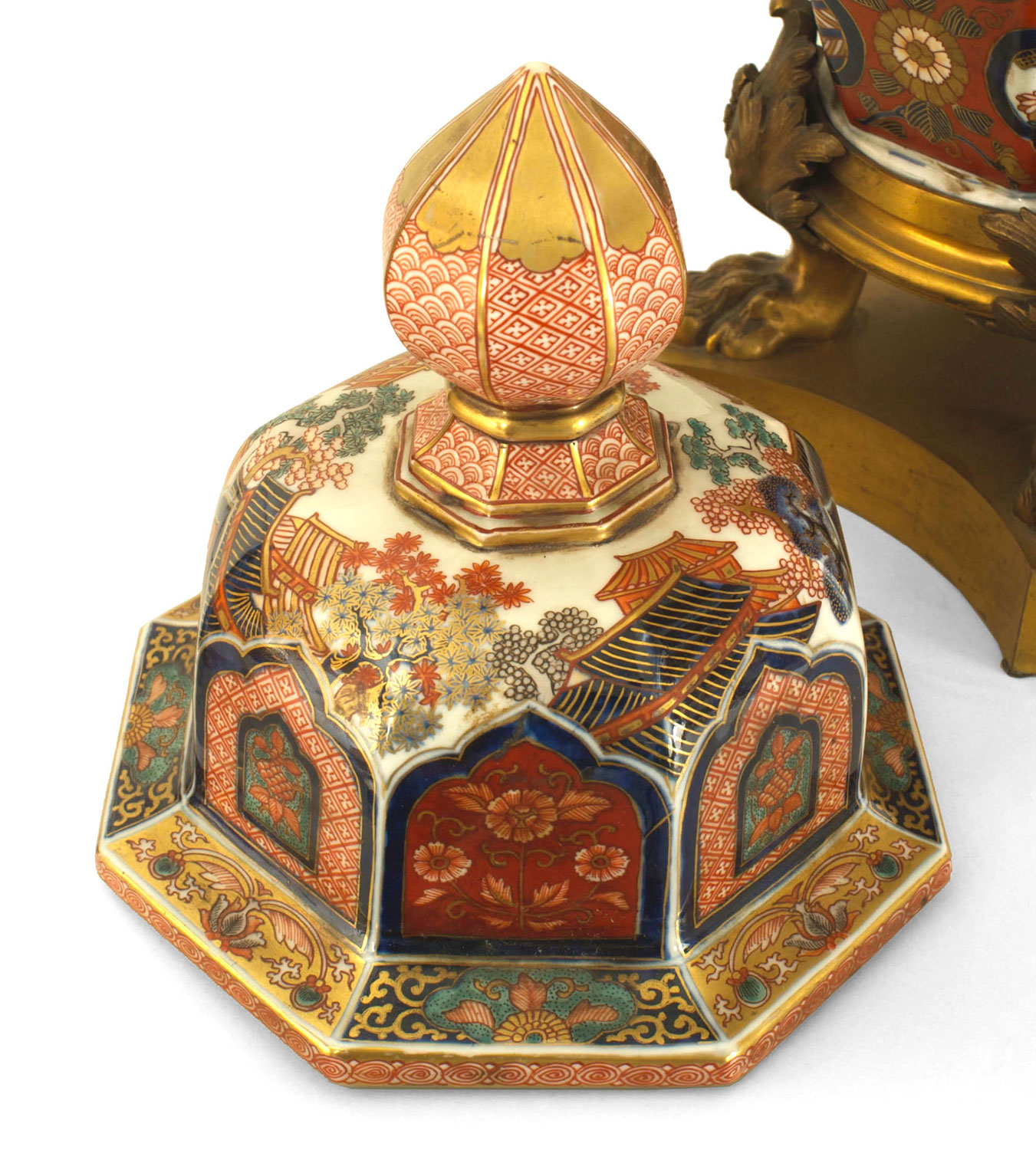 Asian Chinese style large octagonal Imari porcelain vase with finial cover and 4 bronze dore claw feet on base (19th Cent)