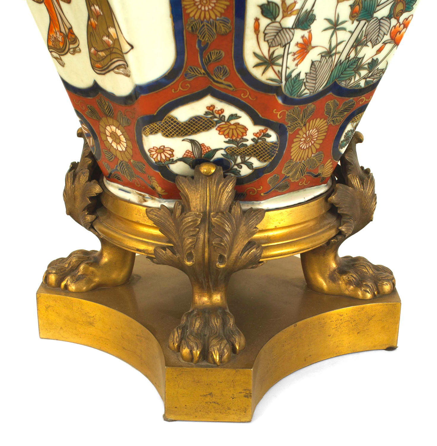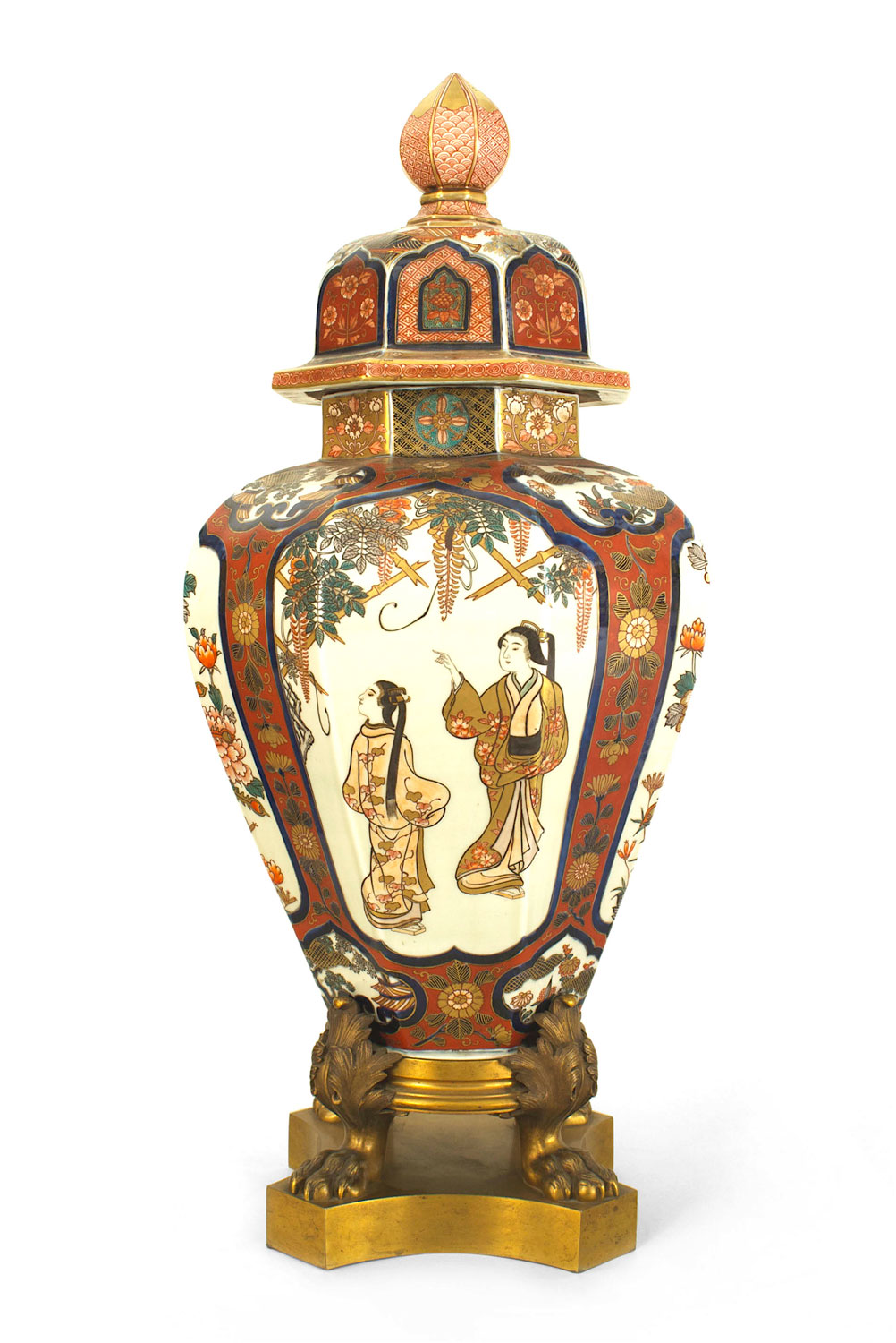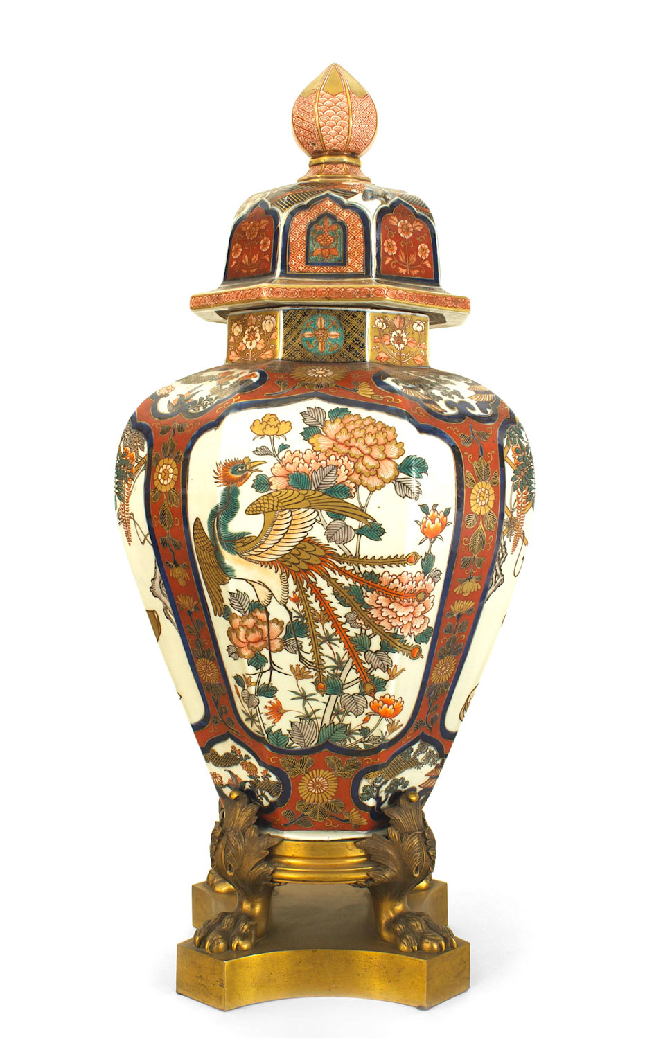 Asian Chinese style large octagonal Imari porcelain vase with finial cover and 4 bronze dore claw feet on base (19th Cent).