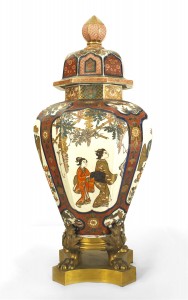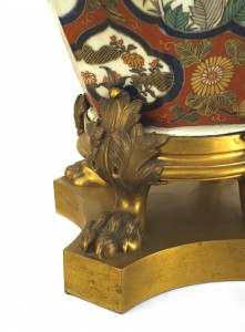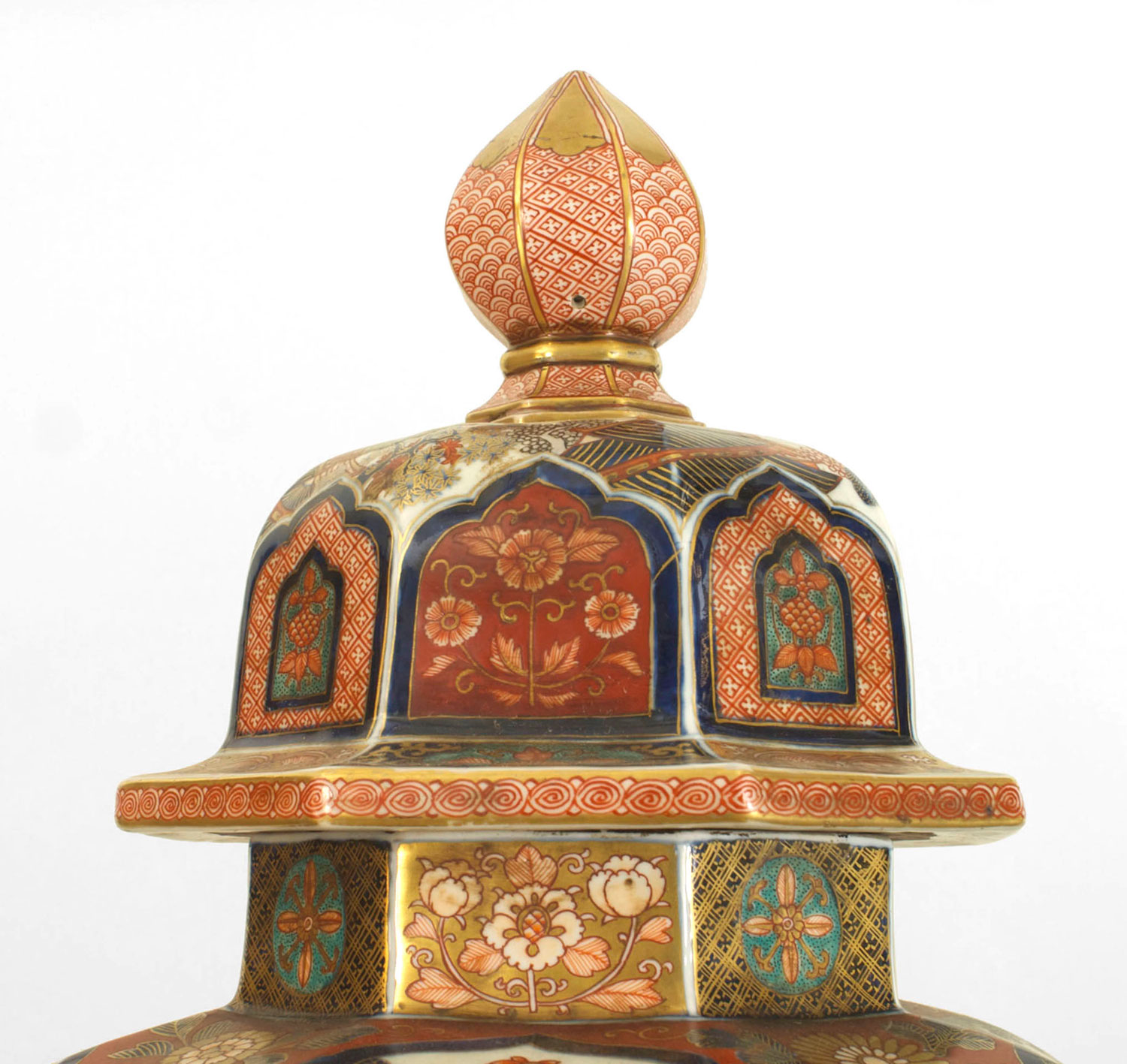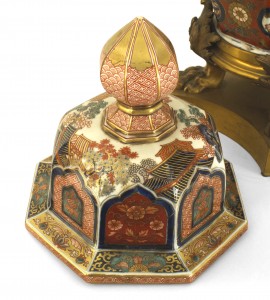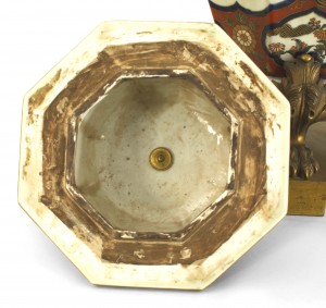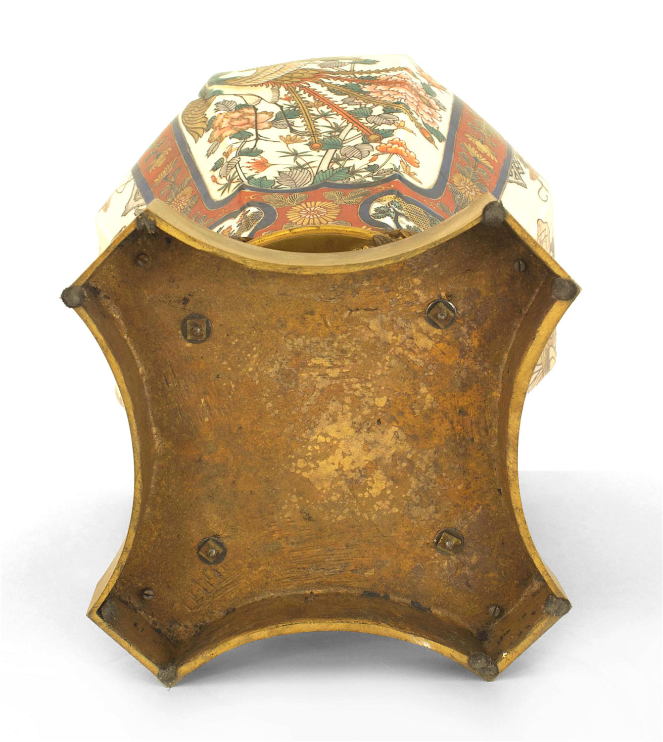 Asian Chinese style large octagonal Imari porcelain vase with finial cover and 4 bronze dore claw feet on base (19th Cent).