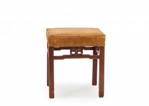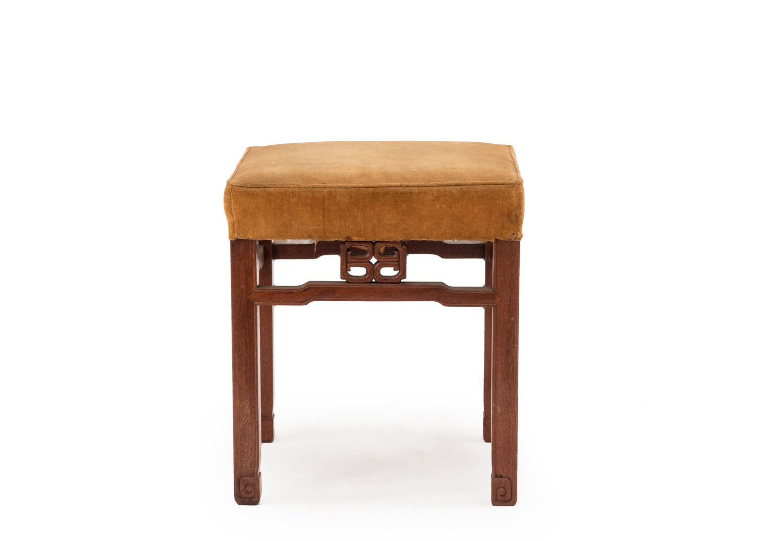 Pair of Asian Chinese style (20th Cent) square teak benches with filigree apron and mustard velvet seat.